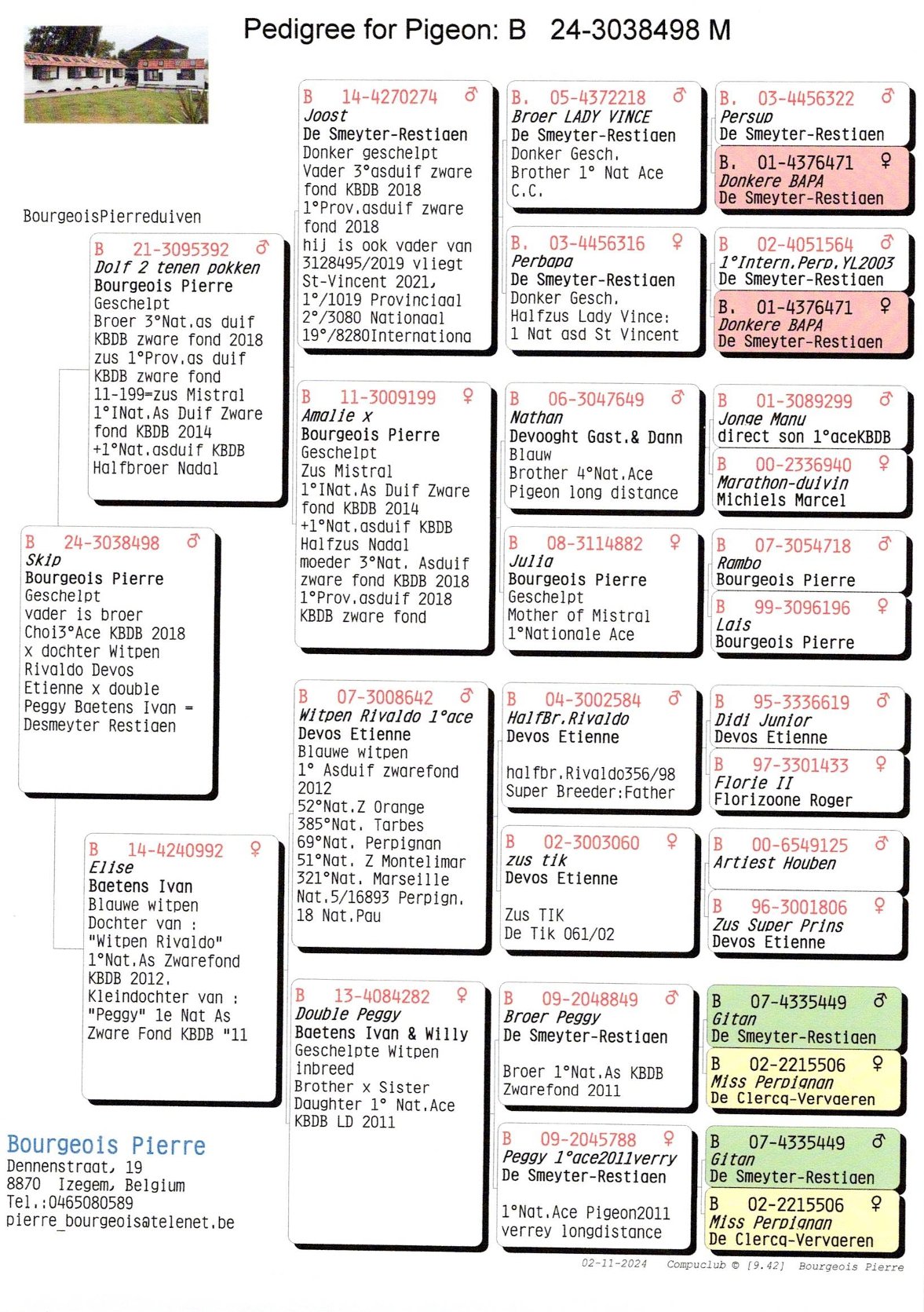 Zoon van “Joost” (De Smeyter-Restiaen) Lijn 1. Internationaal Perpignan ‘03 x “Amalie” Zus “Mistral” 1. Internationale Asduif, 1. Nationale Asduif KBDB Zware Fond. Ouders van” Choi” 3. Nationale Asduif , 1. Provinciale Asduif KBDB Zware Fond 2018.