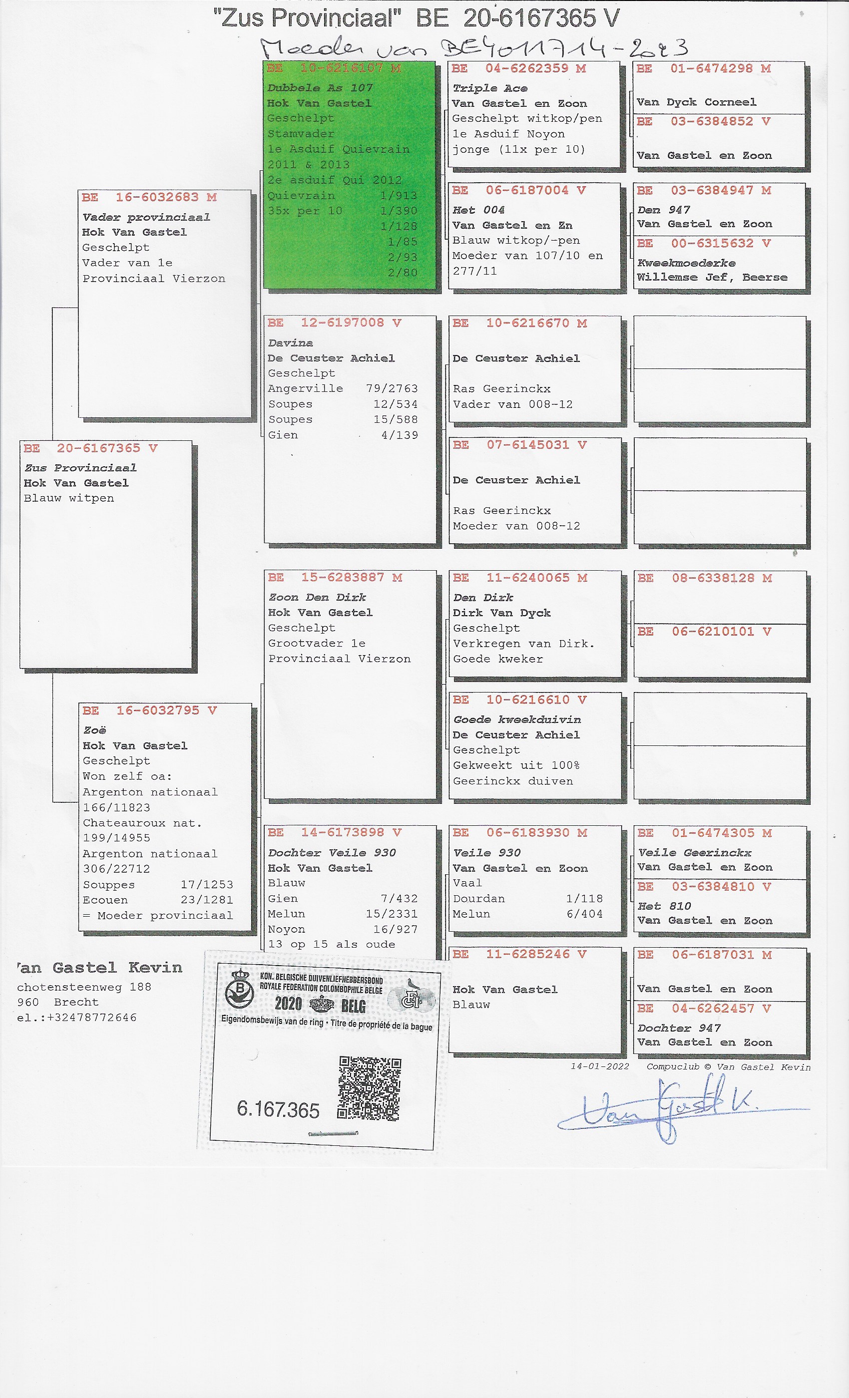 De moeder van deze duif is een rechtstreekse Kevin Van Gastel en bovendien volle zus van meerdere bewezen toppers zoals De Provinciaal en asduifke 311