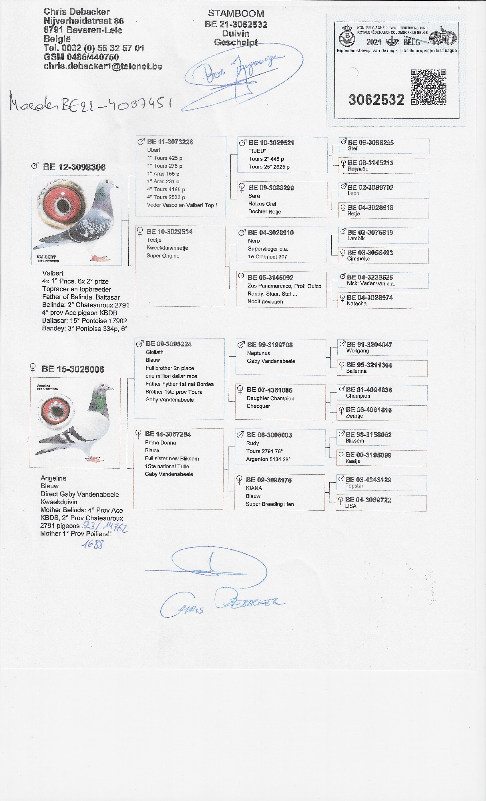 Langs moederskant, volle zus dario 1e provinviaal Poitiers, is het een rechtstreekse duivin van het kampioenhok Chris Debacker uit het koppel Valbert × Angelina, dat topprestaties voortbracht. Uit deze lijn komen toppers voort zoals: