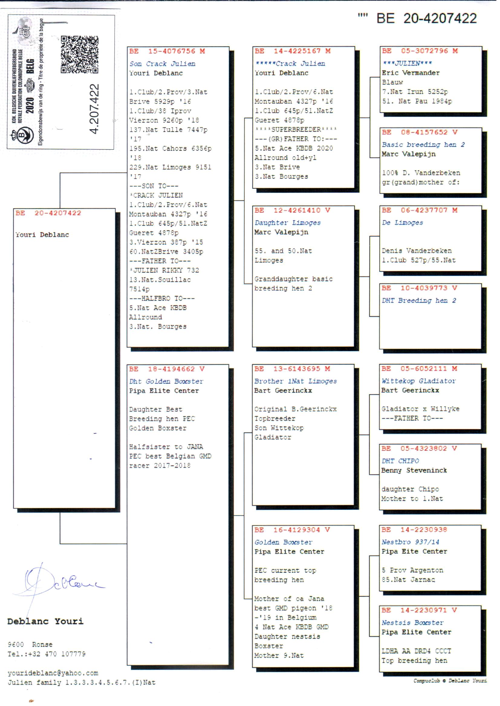Zoon van “Crack Julien” (Youri Deblanc) 6. Nationaal Montauban x “Daughter Limoges” (Valepijn M) Dochter 50. & 55. Nationaal Limoges