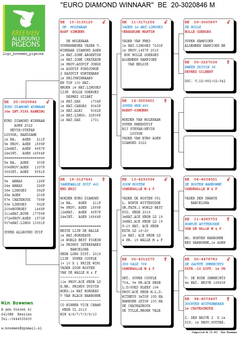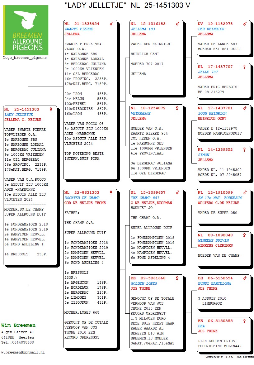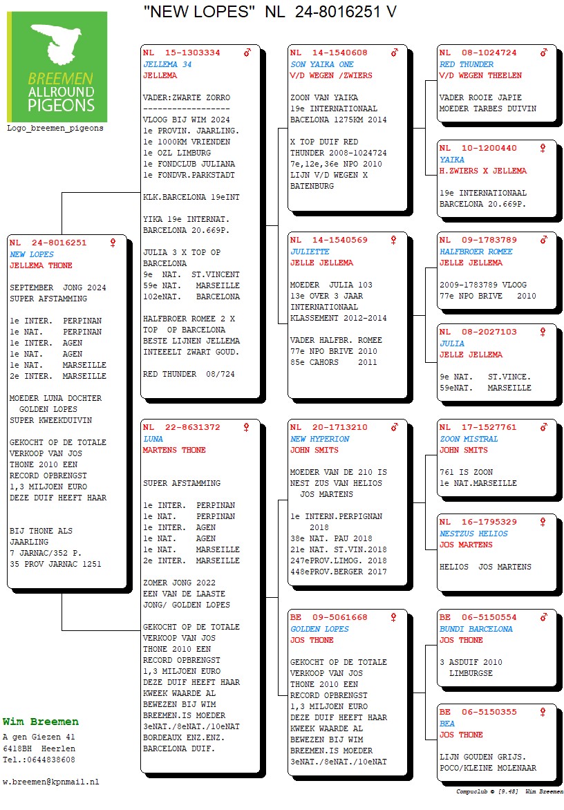 Een van de laatste jongen van “Golden Lopes”, gekocht op de totale verkoop van Jos Thoné in 2010. Een record opbrengst van 1,3 miljoen euro. Deze duif heeft haar kweekwaarde al bewezen bij Wim Breemen. Is moeder van oa;