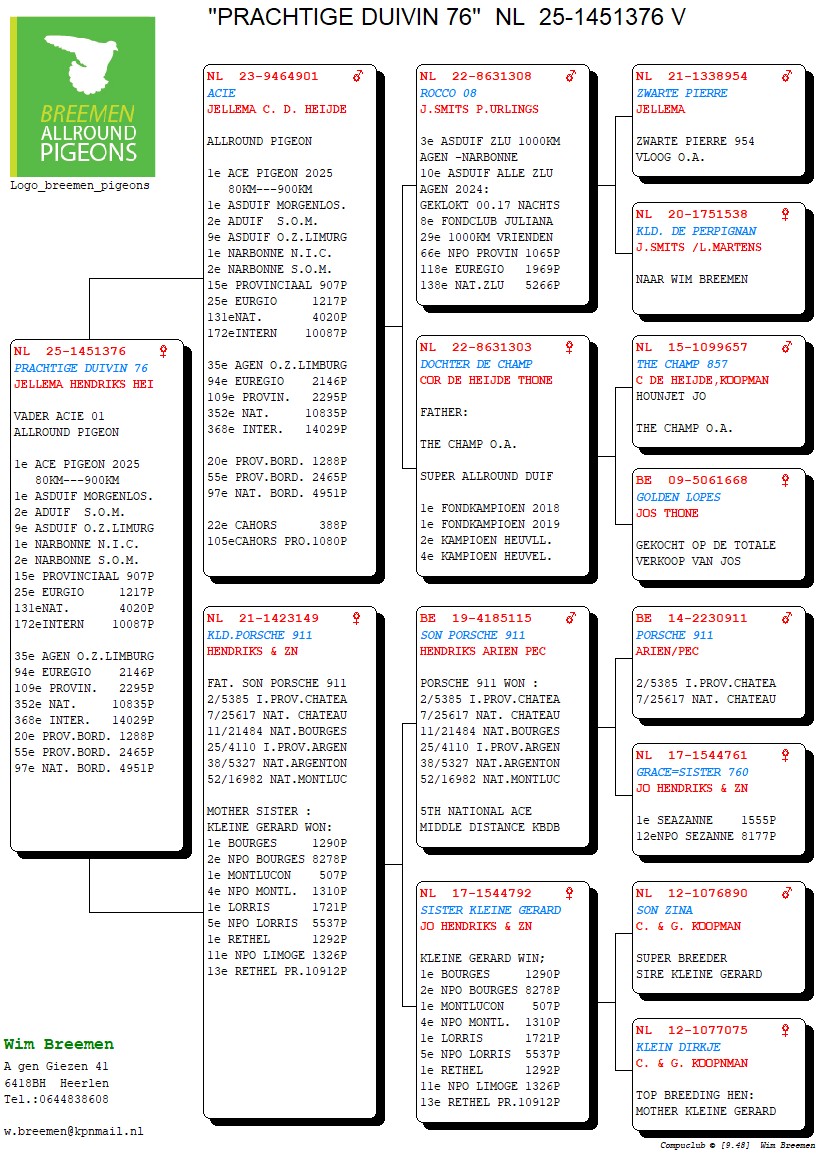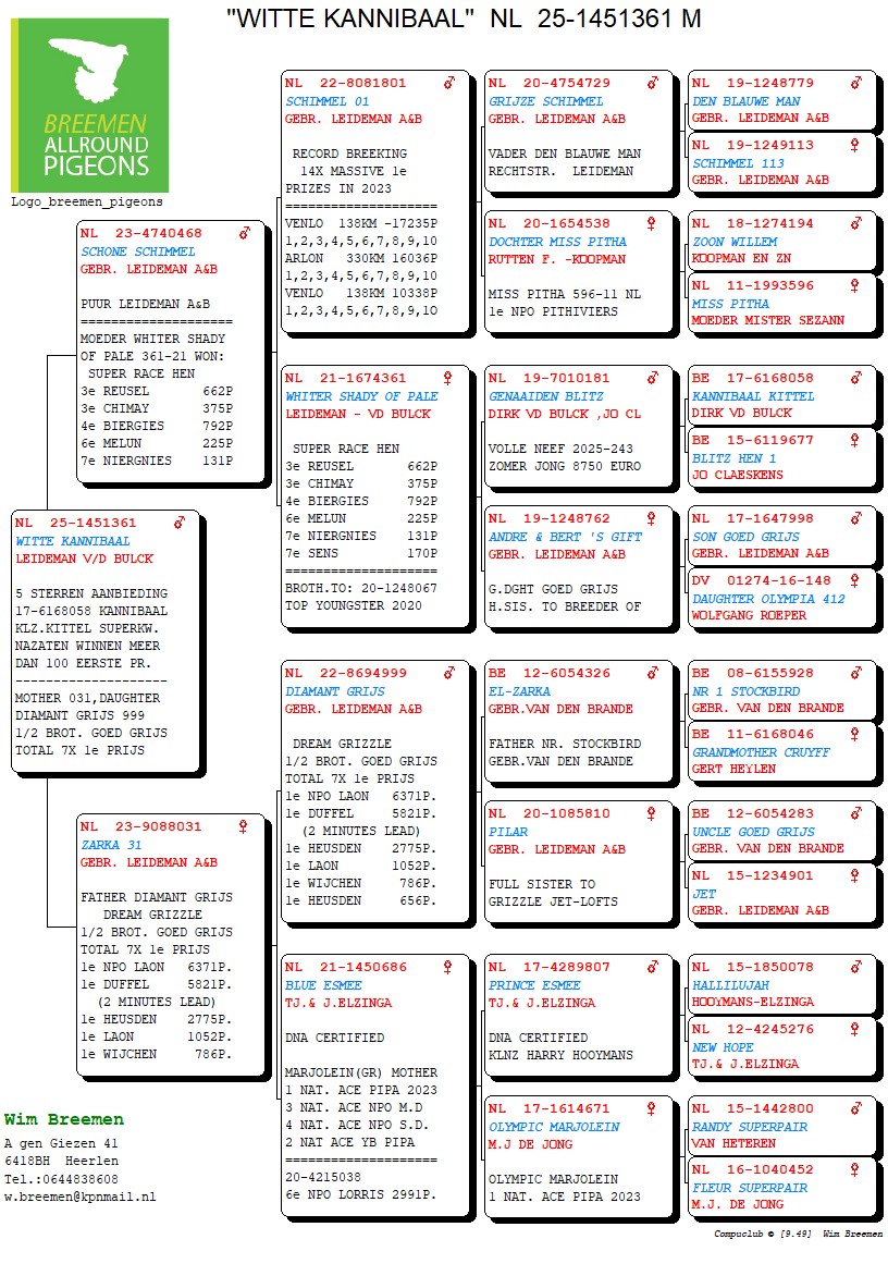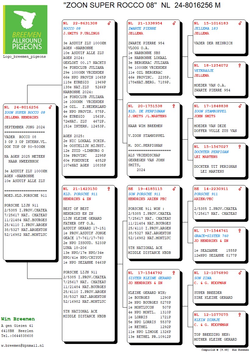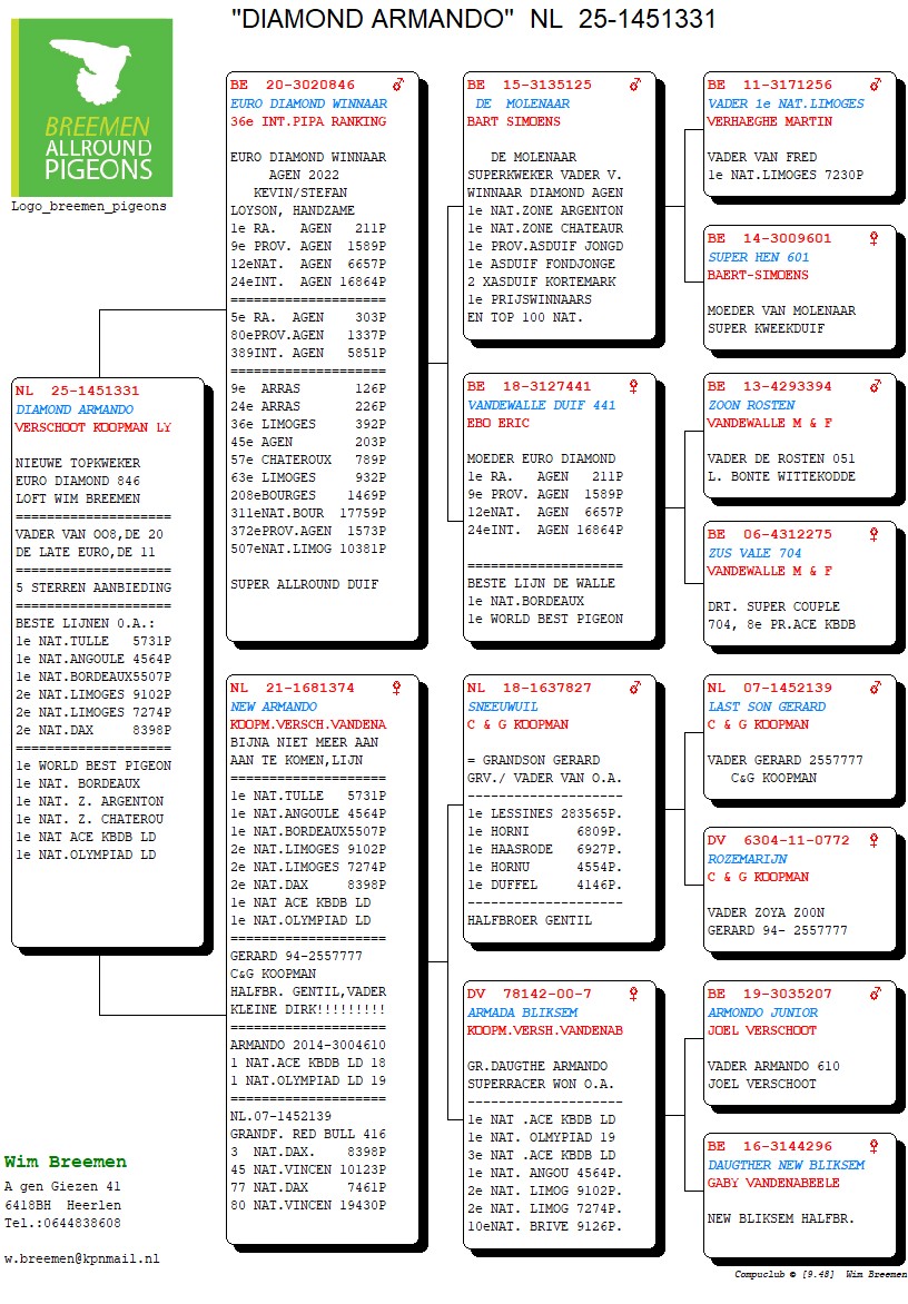 Een van de laatste jongen van “Golden Lopes”, gekocht op de totale verkoop van Jos Thoné in 2010. Een record opbrengst van 1,3 miljoen euro. Deze duif heeft haar kweekwaarde al bewezen bij Wim Breemen. Is moeder van oa;
