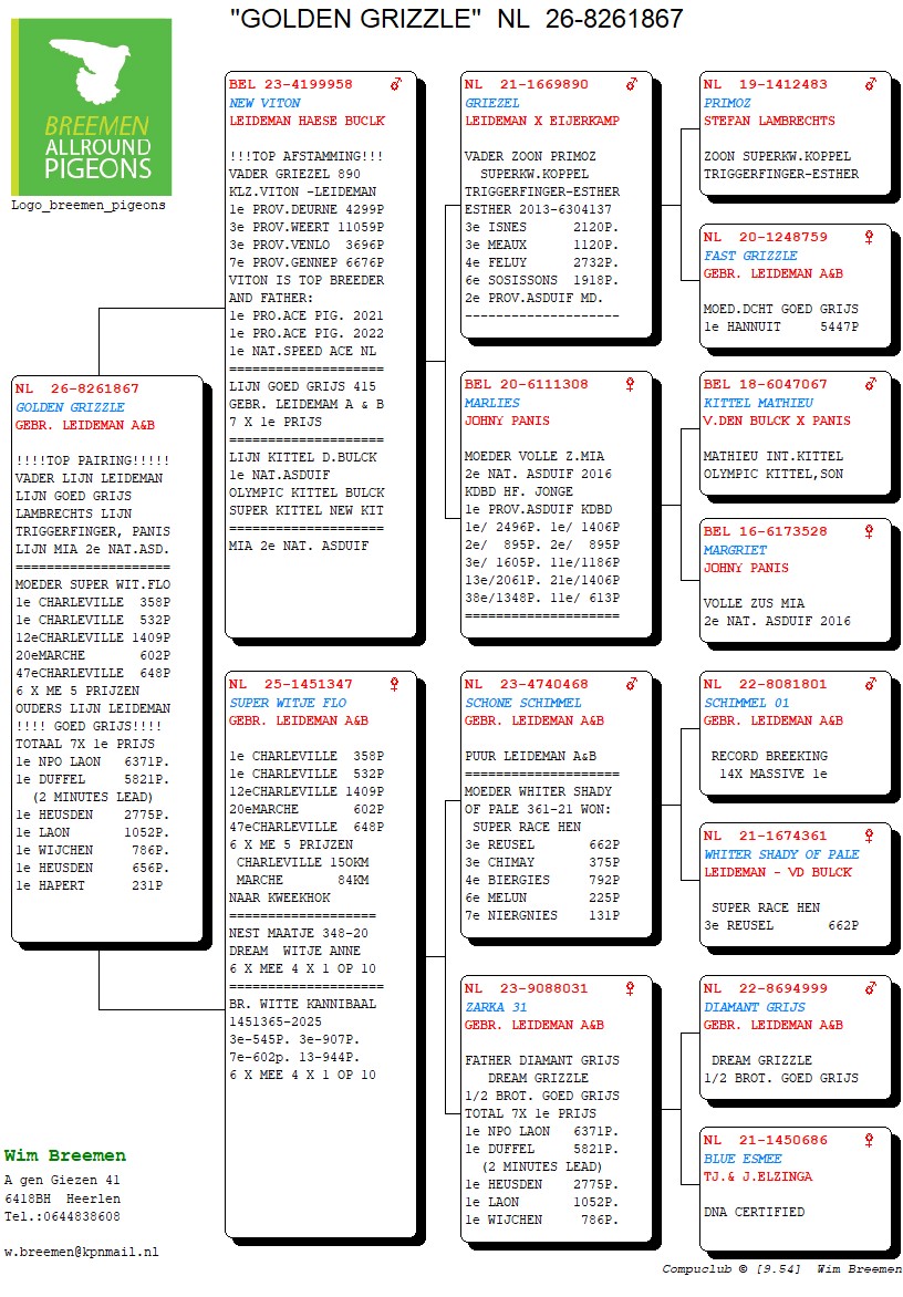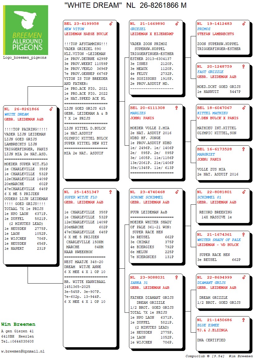 Na gezondsheidsproblemen en diverse ziekenhuisopnames enkele jaren terug, is Wim Breemen terug van - eigelijk nooit!- weggeweest. 2024 én 2025 werden terug knappe seizoenen, waarin hij wederom nationaal en internationaal aan het raam kwam kloppen. Dat Wim een man is van weinig tierlantijntjes, dat weten we al langer dan vandaag: "goede duiven en ze zo dicht mogelijk bij de natuur houden" is zijn motto. Een kleine veiling, maar boordevol kwaliteit, zoals we van deze immersympathieke Heerlenaar gewend zijn!