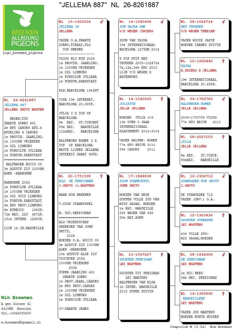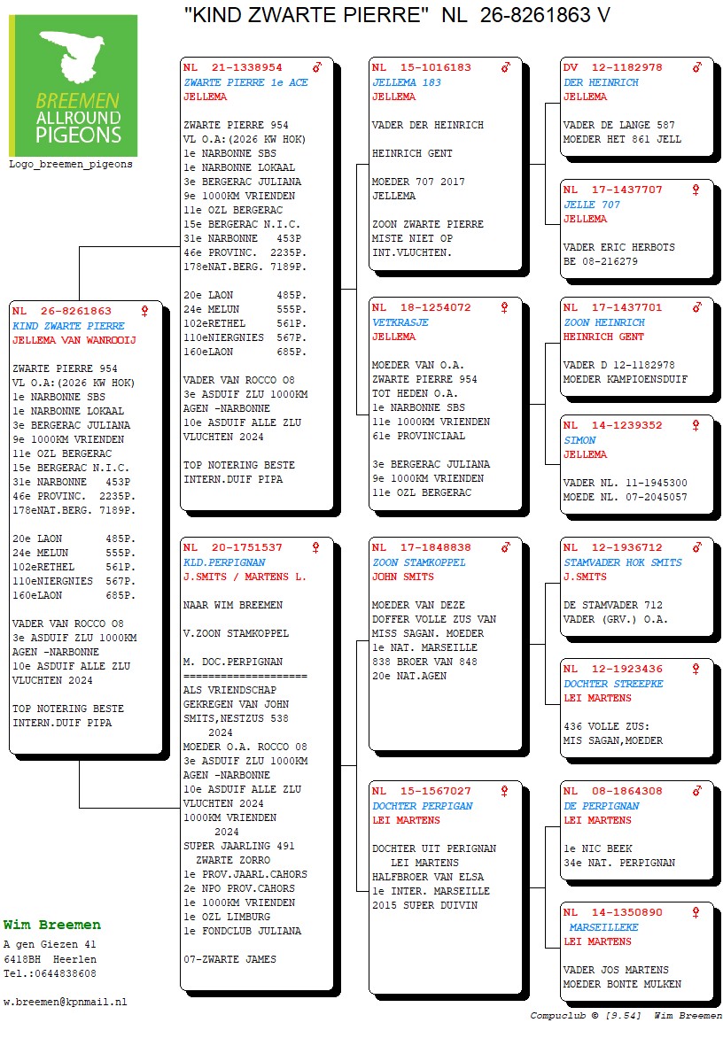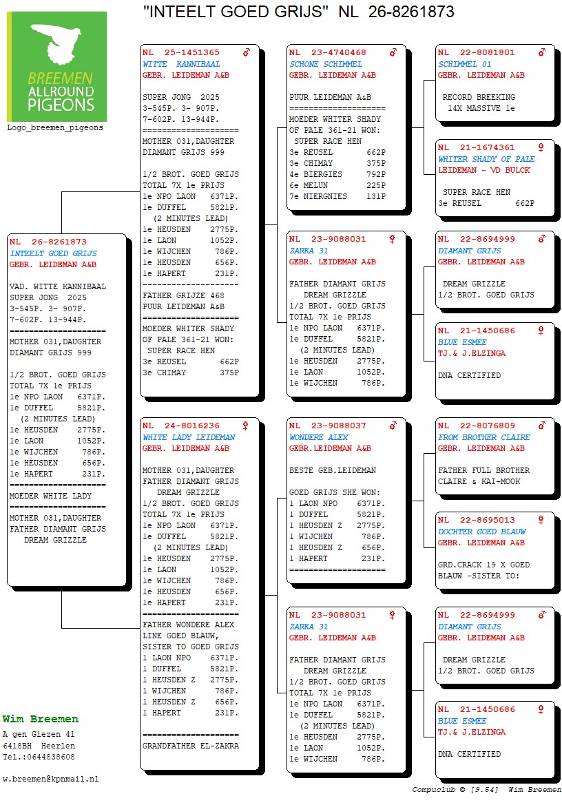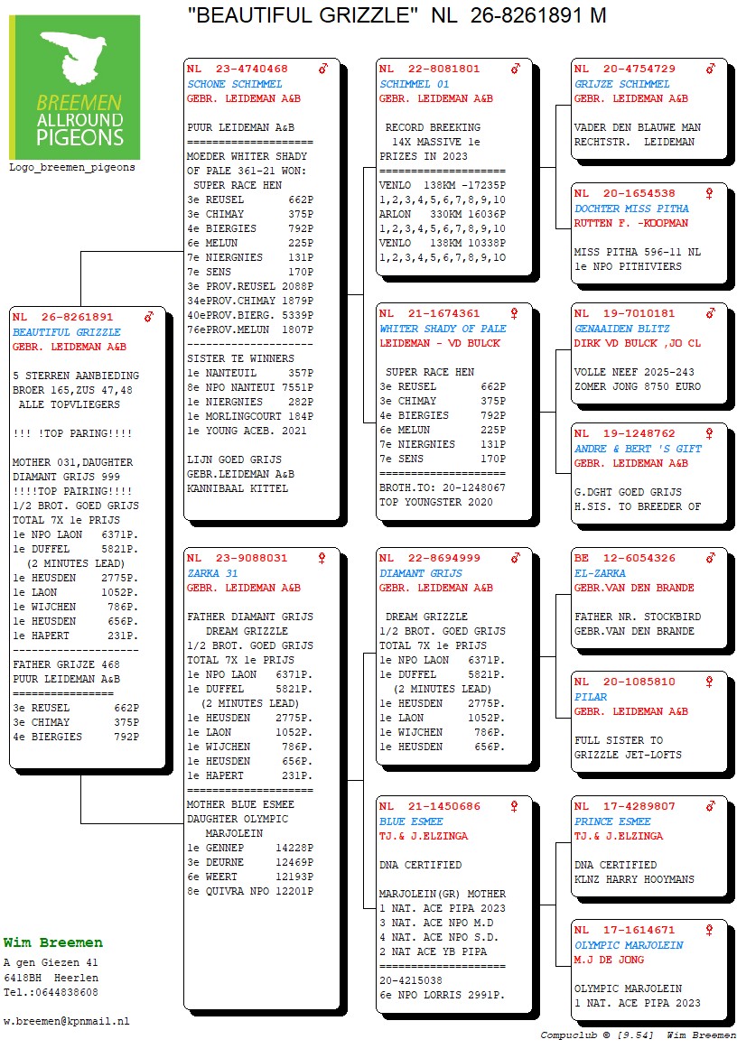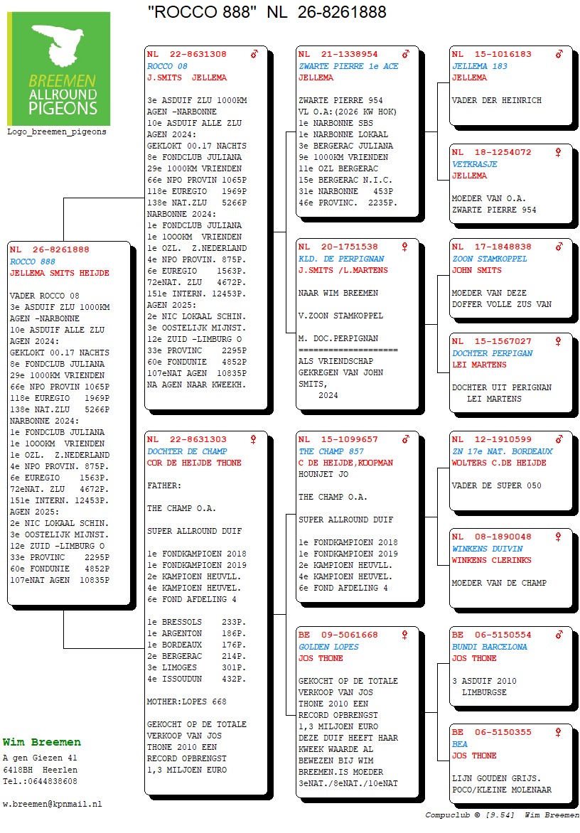 Na gezondsheidsproblemen en diverse ziekenhuisopnames enkele jaren terug, is Wim Breemen terug van - eigelijk nooit!- weggeweest. 2024 én 2025 werden terug knappe seizoenen, waarin hij wederom nationaal en internationaal aan het raam kwam kloppen. Dat Wim een man is van weinig tierlantijntjes, dat weten we al langer dan vandaag: "goede duiven en ze zo dicht mogelijk bij de natuur houden" is zijn motto. Een kleine veiling, maar boordevol kwaliteit, zoals we van deze immersympathieke Heerlenaar gewend zijn!