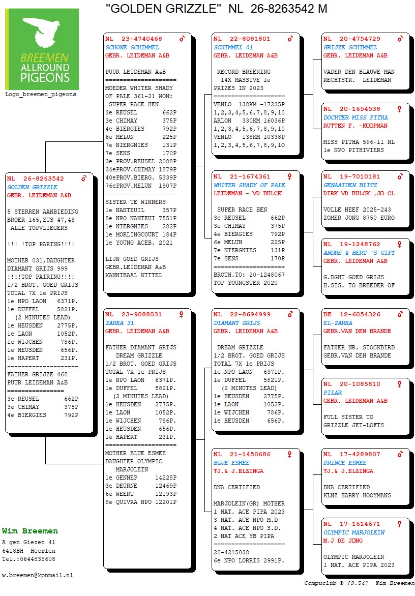 Na gezondsheidsproblemen en diverse ziekenhuisopnames enkele jaren terug, is Wim Breemen terug van - eigelijk nooit!- weggeweest. 2024 én 2025 werden terug knappe seizoenen, waarin hij wederom nationaal en internationaal aan het raam kwam kloppen. Dat Wim een man is van weinig tierlantijntjes, dat weten we al langer dan vandaag: "goede duiven en ze zo dicht mogelijk bij de natuur houden" is zijn motto. Een kleine veiling, maar boordevol kwaliteit, zoals we van deze immersympathieke Heerlenaar gewend zijn!
