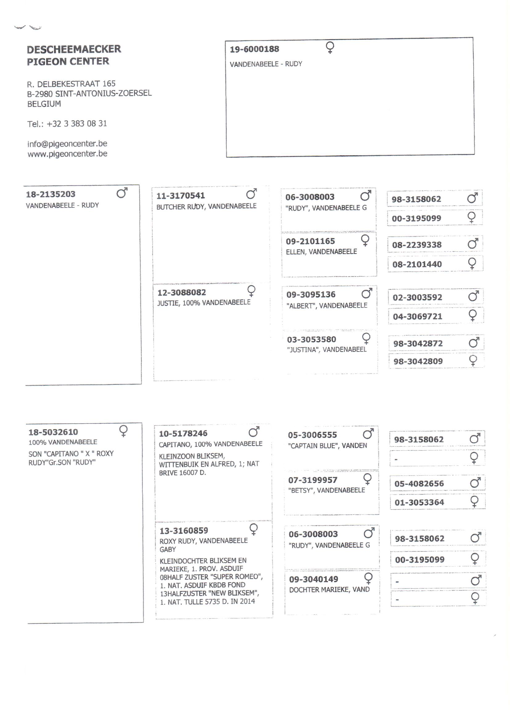 Vader BE16-2247879 Roox Henri & BetsyVloog als jonge duif 6 x per 10Line "Ulla"; 1st Prov Limoges, 8th Nat LimogesMoeder BE19-6000188 100% VandenabeeleKleinkind "Capitano" x "Roxy Rudy"Lijnen Prov en Nat asduif