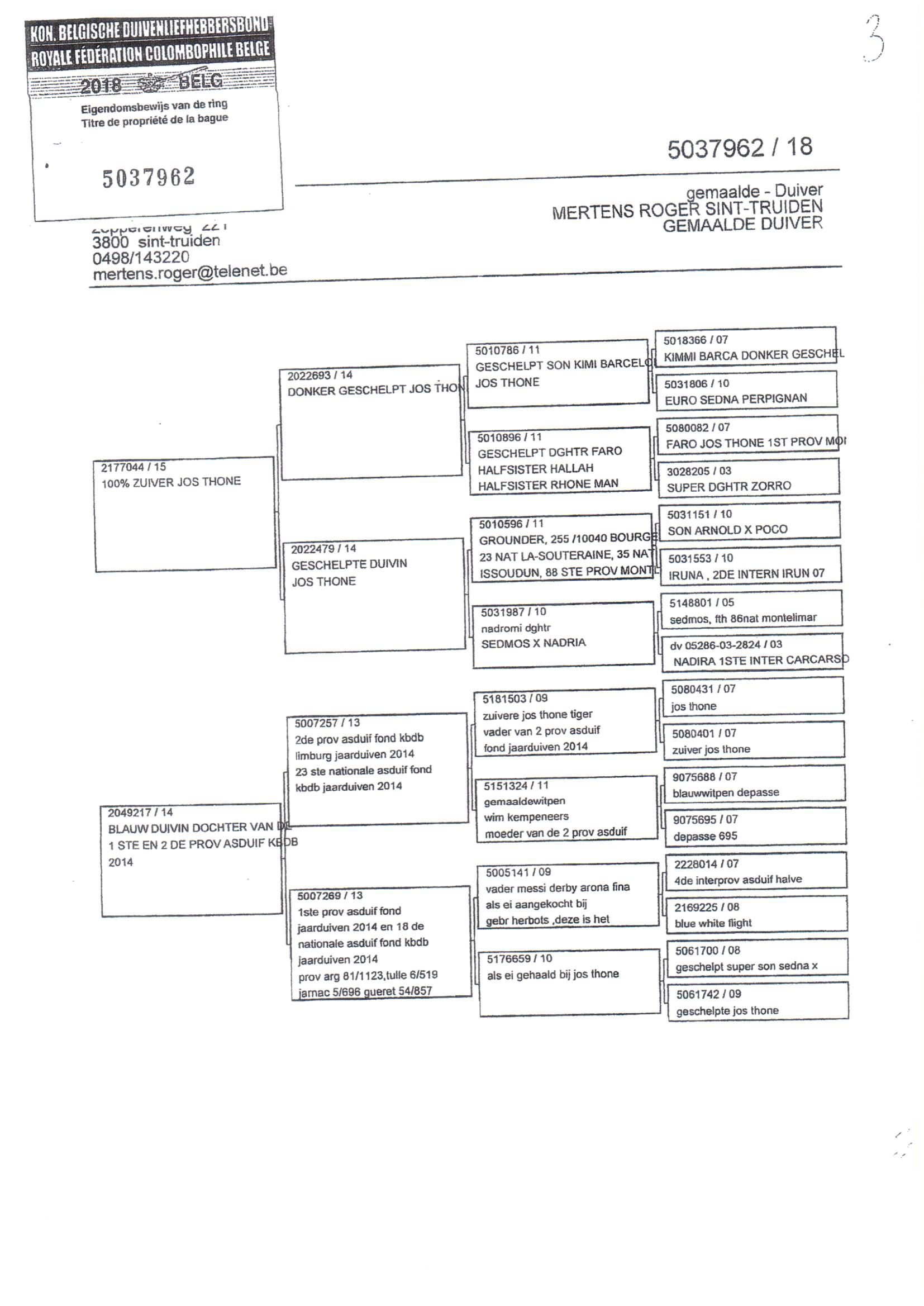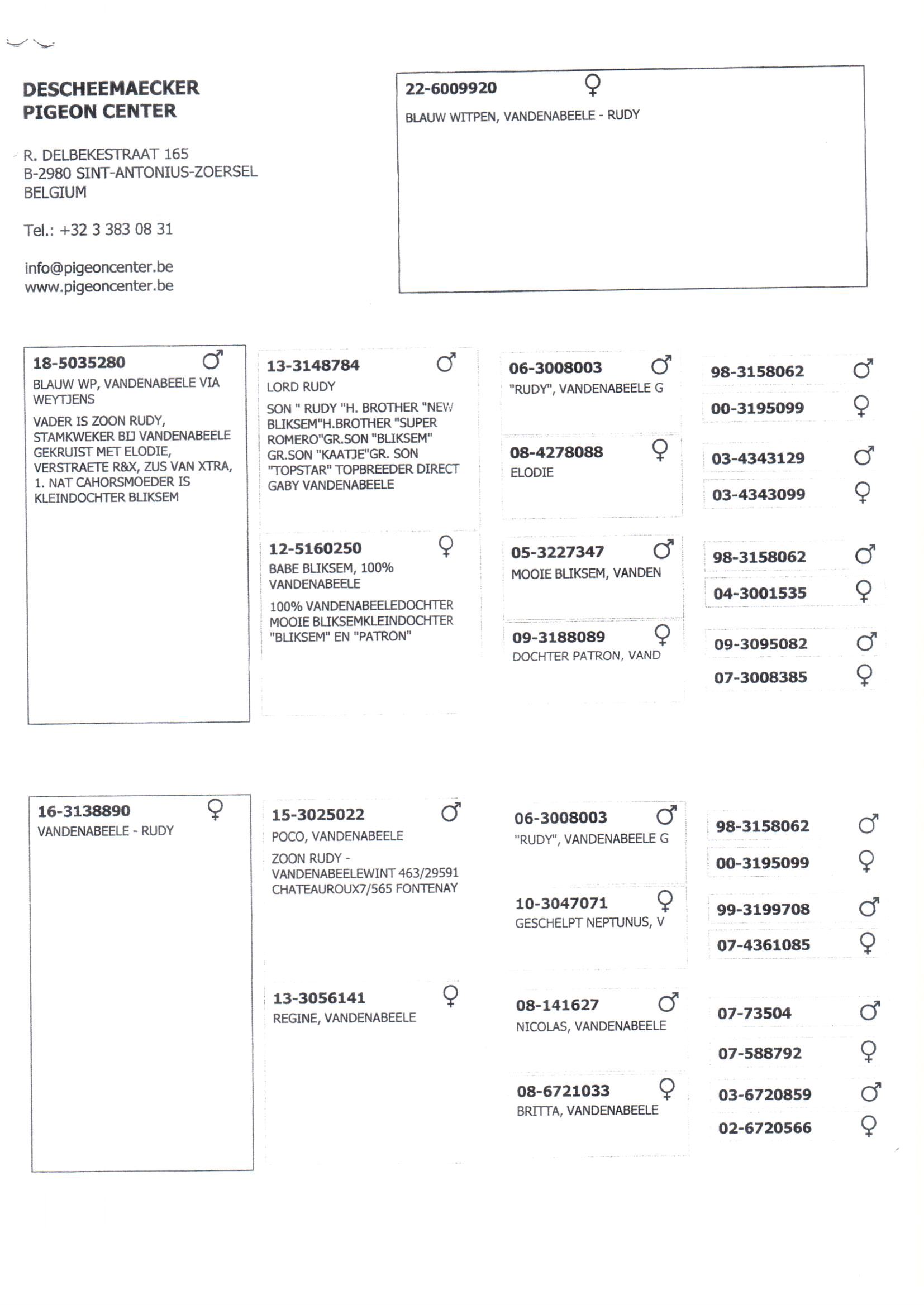 Vader BE18-5037962Moeder is dochter van 1° en 2° prov asduif KBDB '14Moeder BE22-6009920 - Lijn VandenabeeleGrootvader is zoon "Rudy"; stamkweker bij Vandenabeele