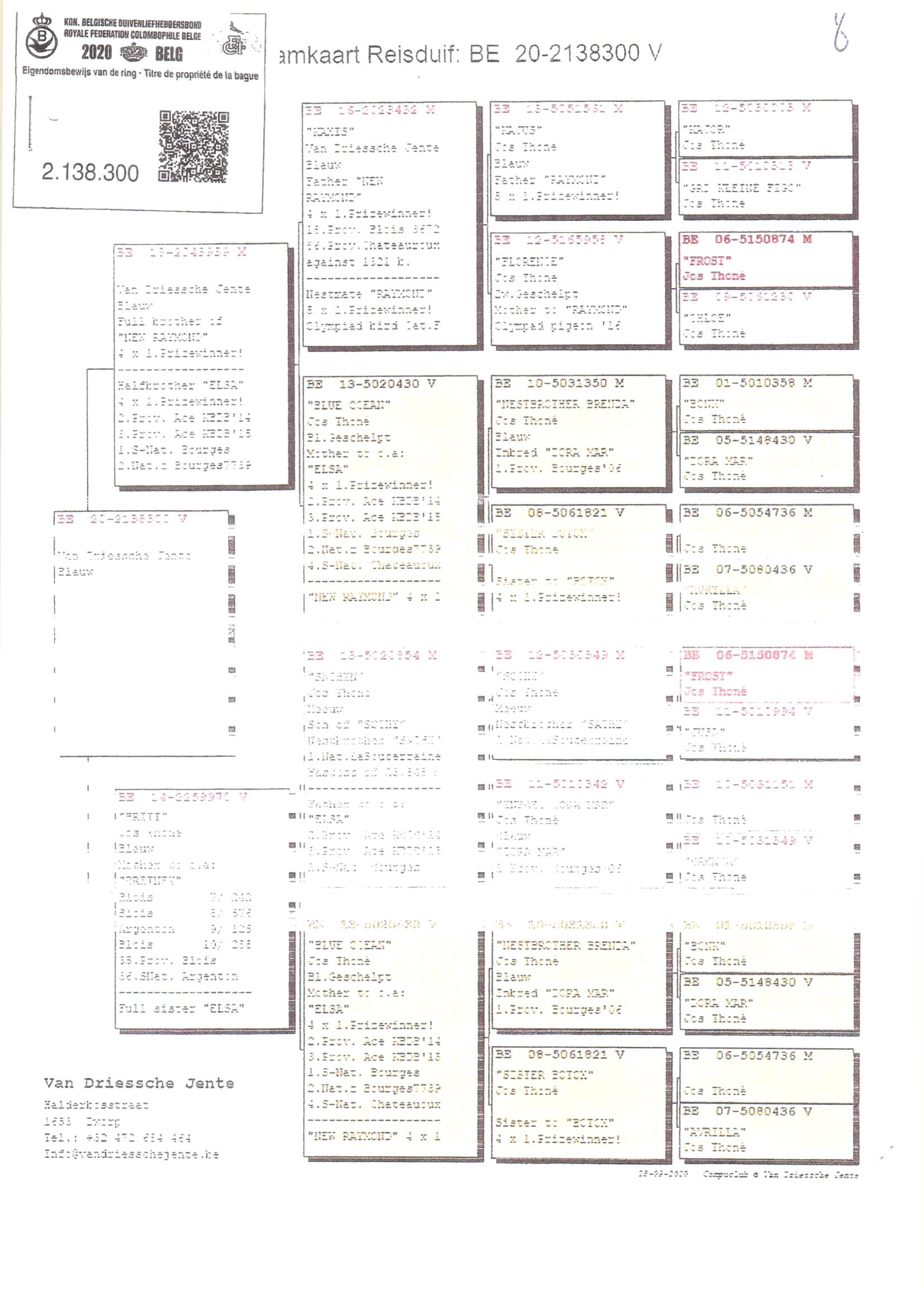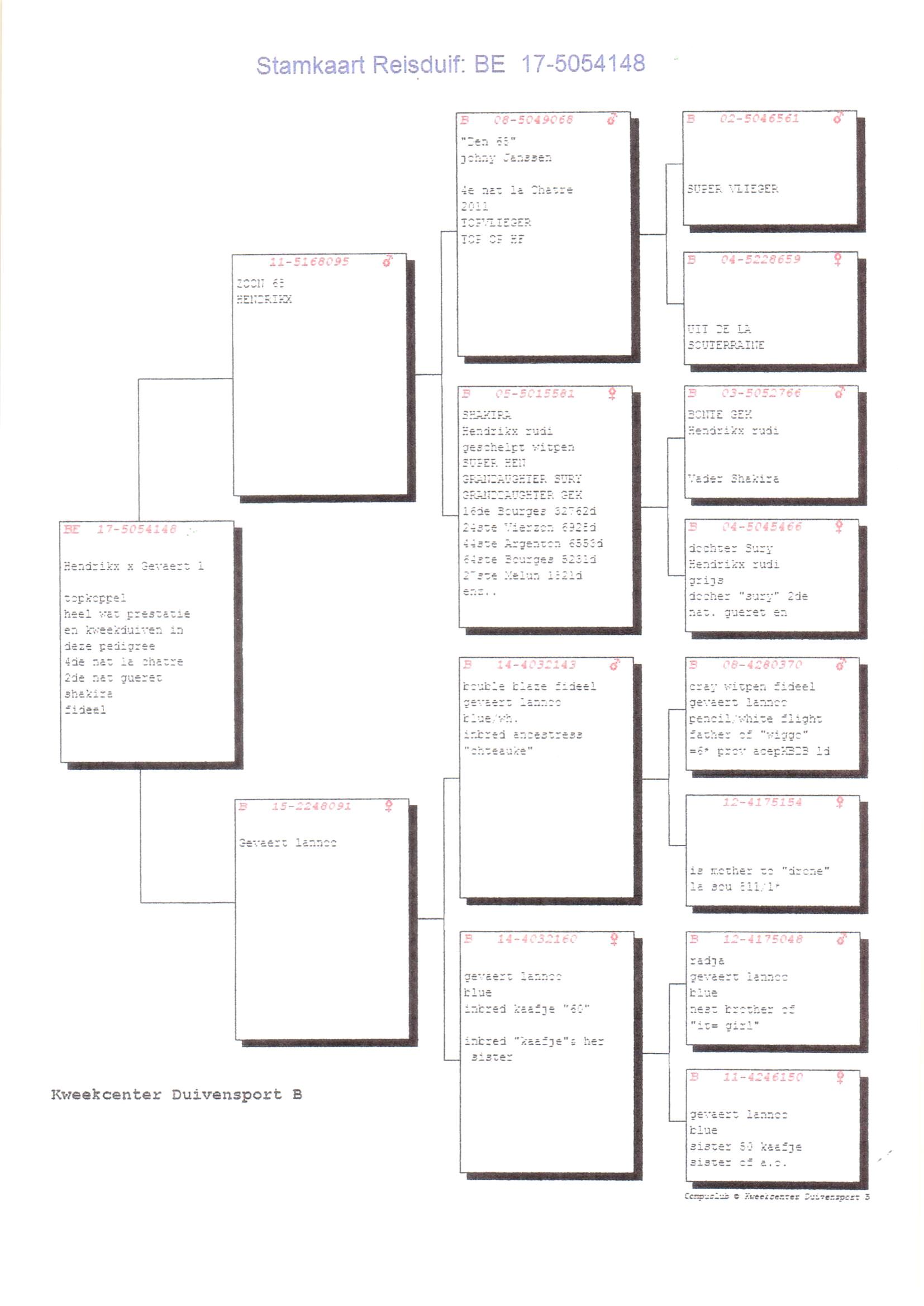 Original Uyttendaele YvesVader : BE17-5054148Original Kweekcenter Duivensport BLijn ‘Suzy’ (Hendrikx Rudi)· 2e Nat. GueretLijn ‘Kaafje’ (Gevaert-Lannoo)Moeder : BE20-2138300Original Van Driessche Jente100 % Thoné Jos