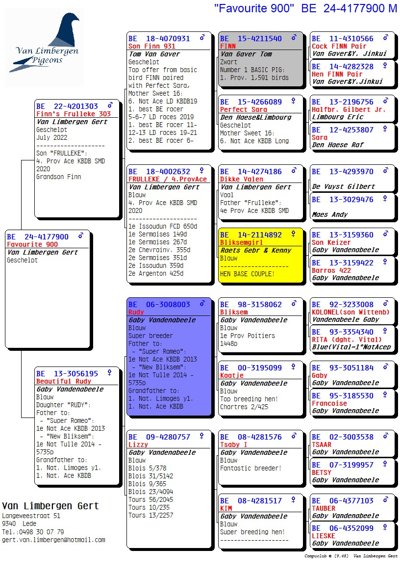 In the meantime, Van Gaver pigeons have also been introduced several times with a view to the longer middle-distance races. Over the past three years in Lede, no fewer than 72 pure first prizes were won from 100 to 700 km; including double wins, this total rises to more than 200 first prizes!