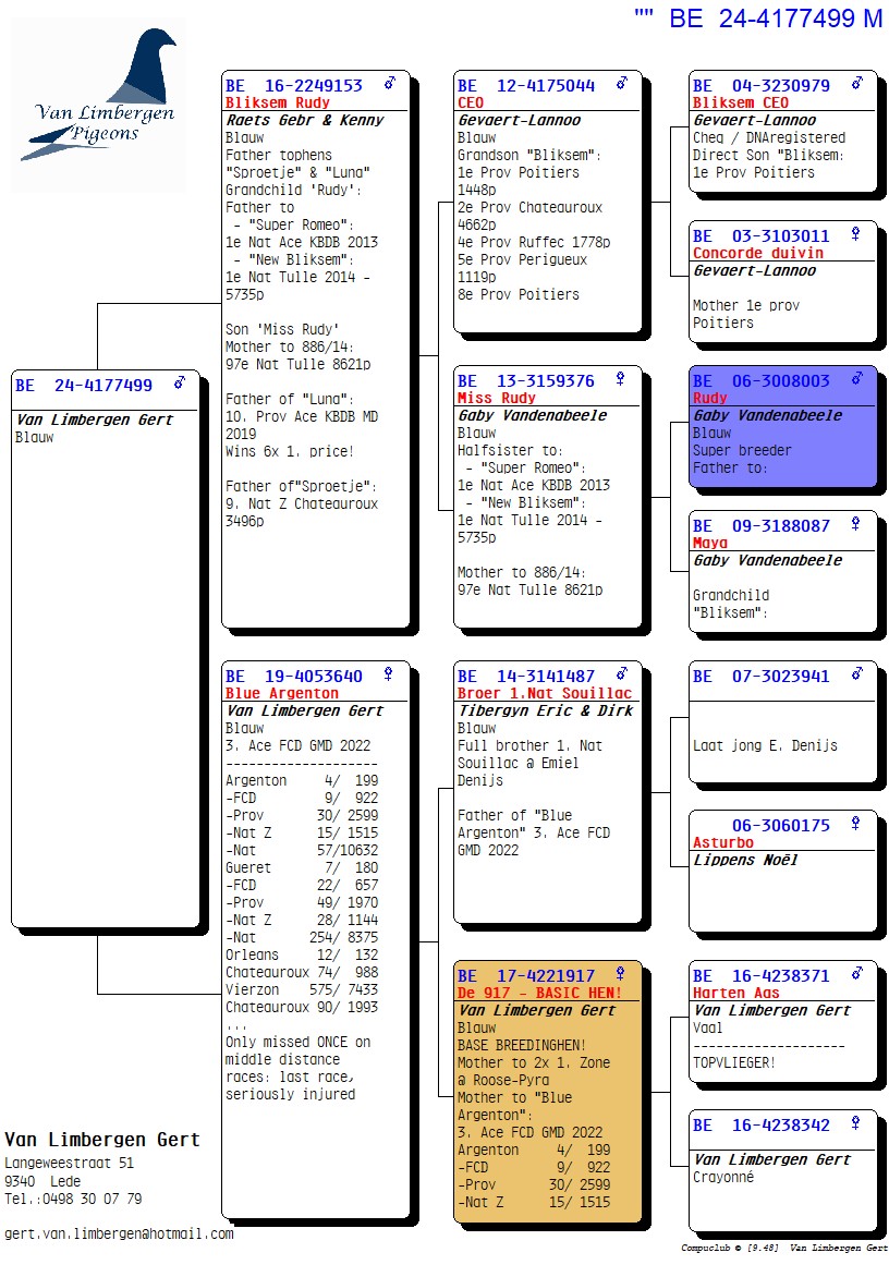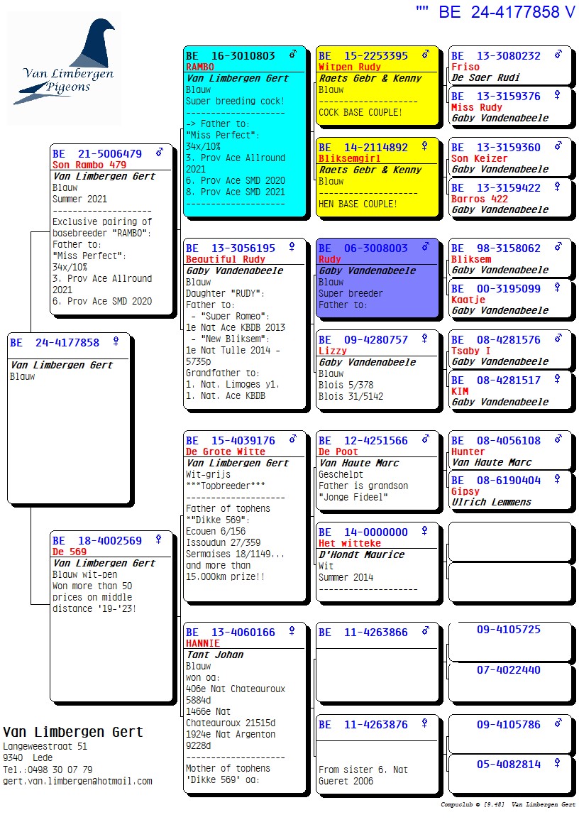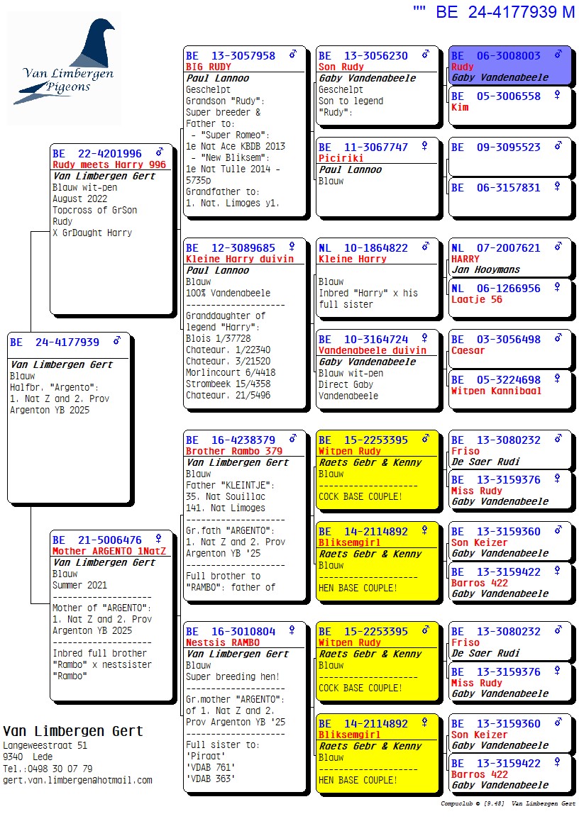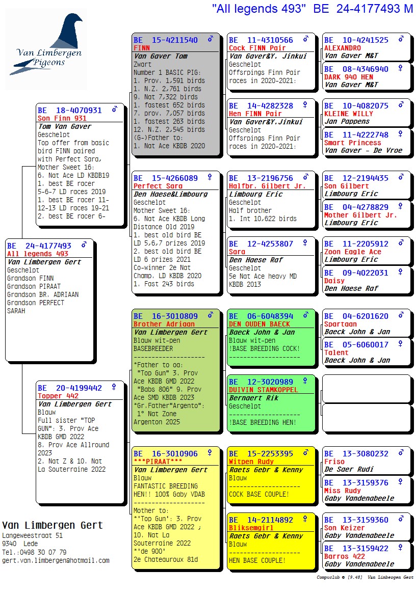 The foundation of this top loft consists for 90% of the Gaby Vandenabeele strain, further enriched with bloodlines from Hendrikx, Baeck, Van Gaver, Raets, and others. The latter provided a serious injection of quality, as two direct Raets pigeons form the absolute foundation pair of the current colony. From this pair came several outstanding breeders such as “Rambo” and his sister “De Piraat,” which have consistently produced first-prize winners and ace pigeons, generation after generation.