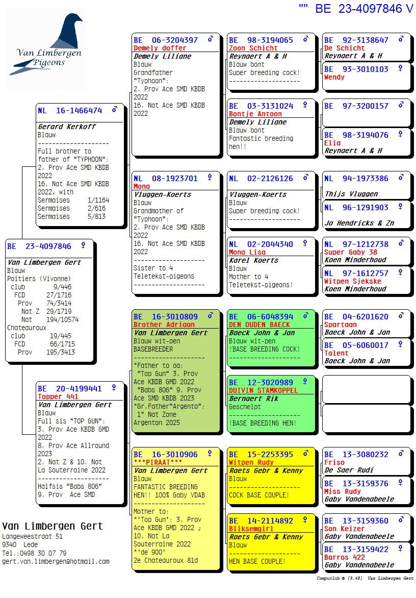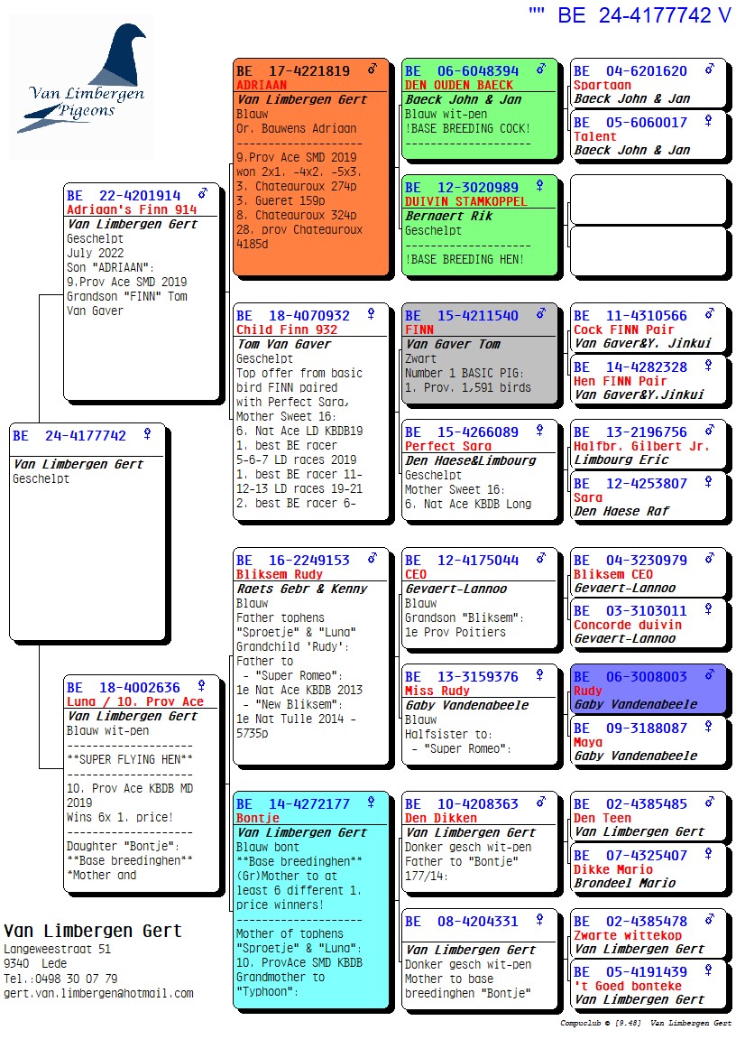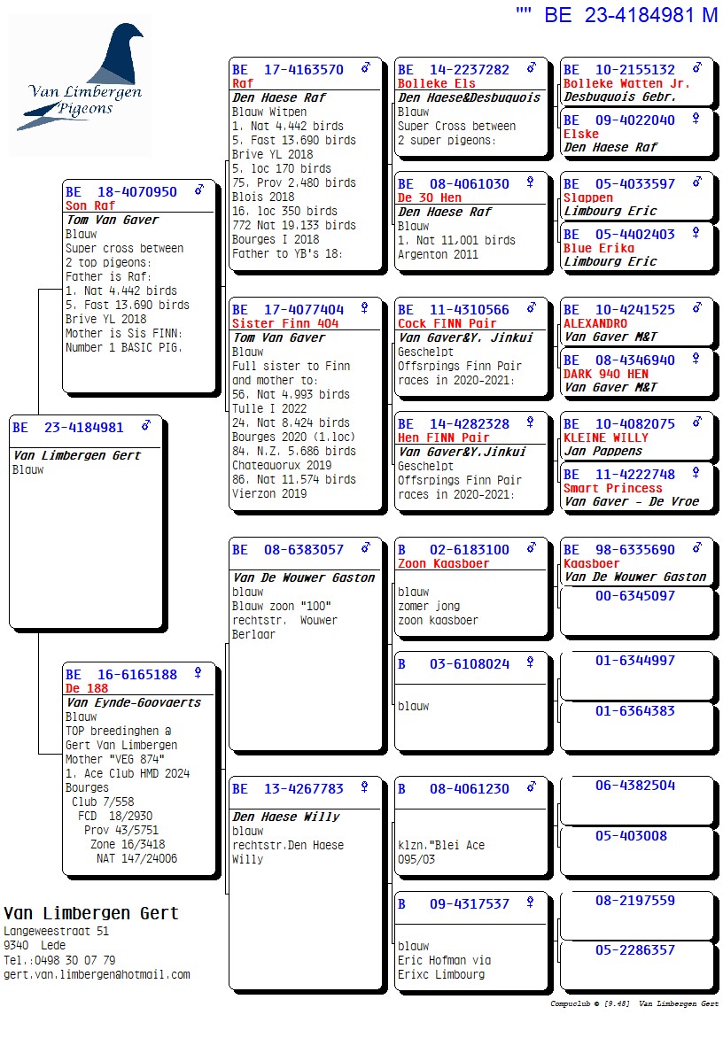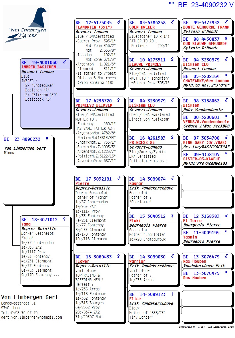 The foundation of this top loft consists for 90% of the Gaby Vandenabeele strain, further enriched with bloodlines from Hendrikx, Baeck, Van Gaver, Raets, and others. The latter provided a serious injection of quality, as two direct Raets pigeons form the absolute foundation pair of the current colony. From this pair came several outstanding breeders such as “Rambo” and his sister “De Piraat,” which have consistently produced first-prize winners and ace pigeons, generation after generation.