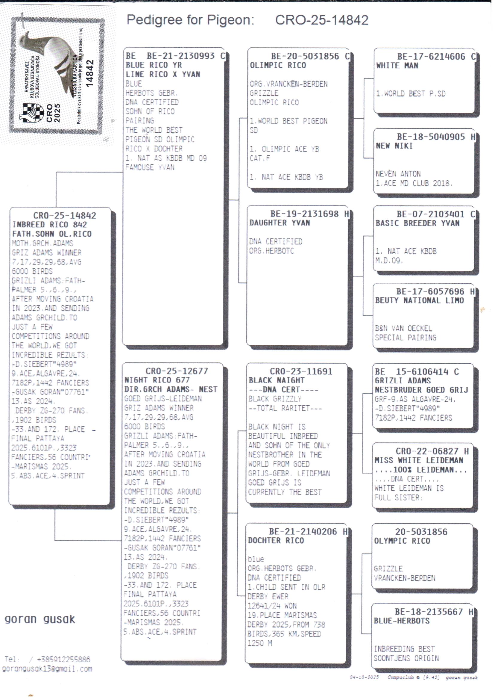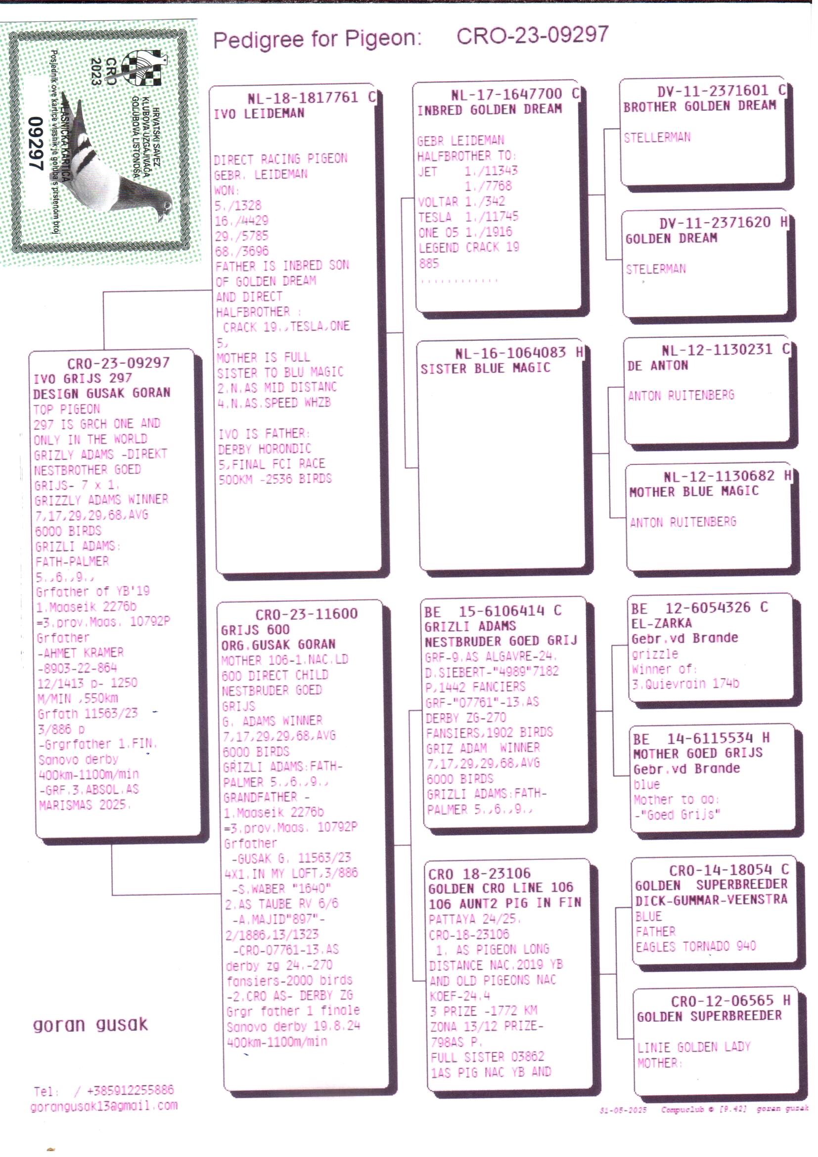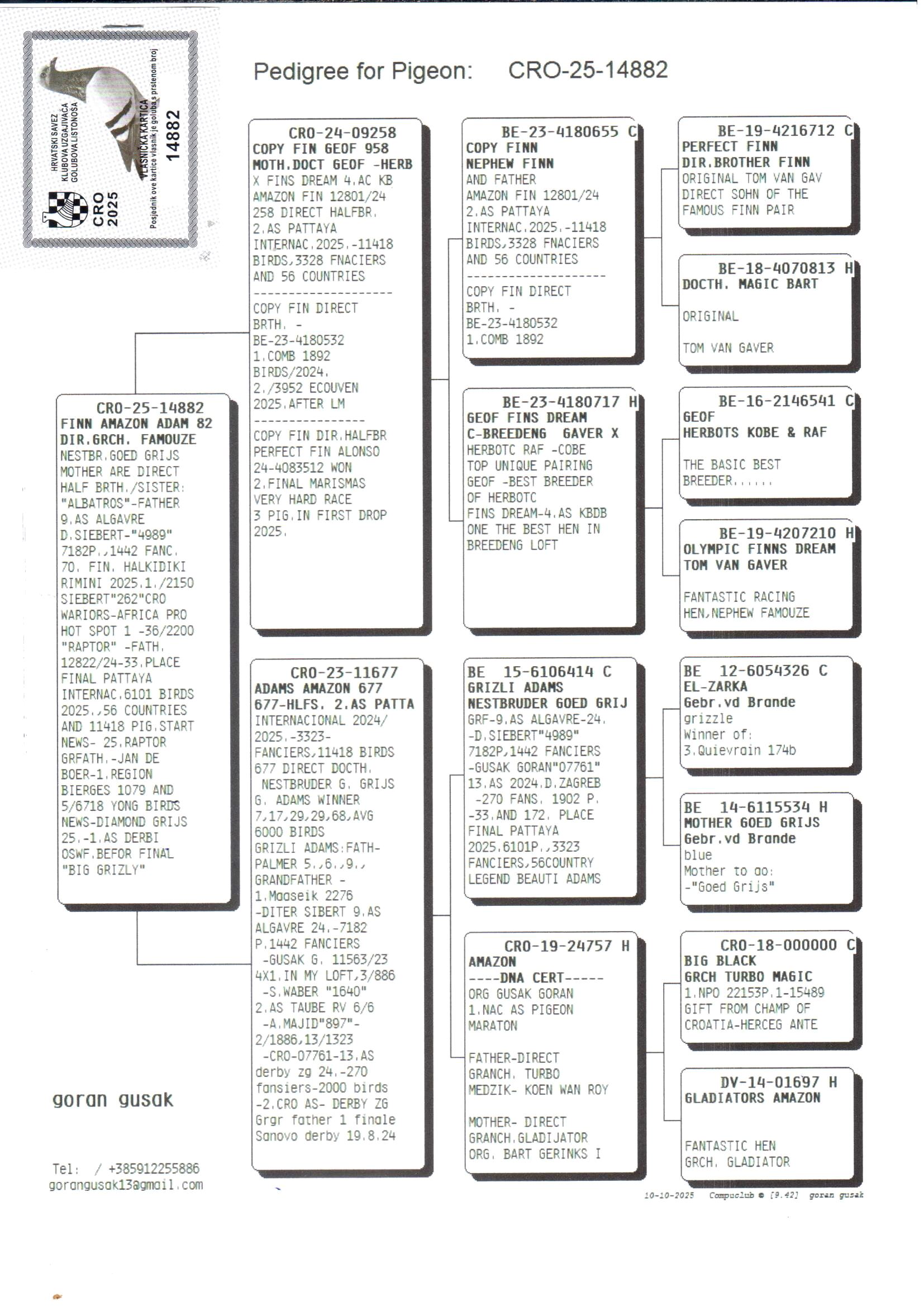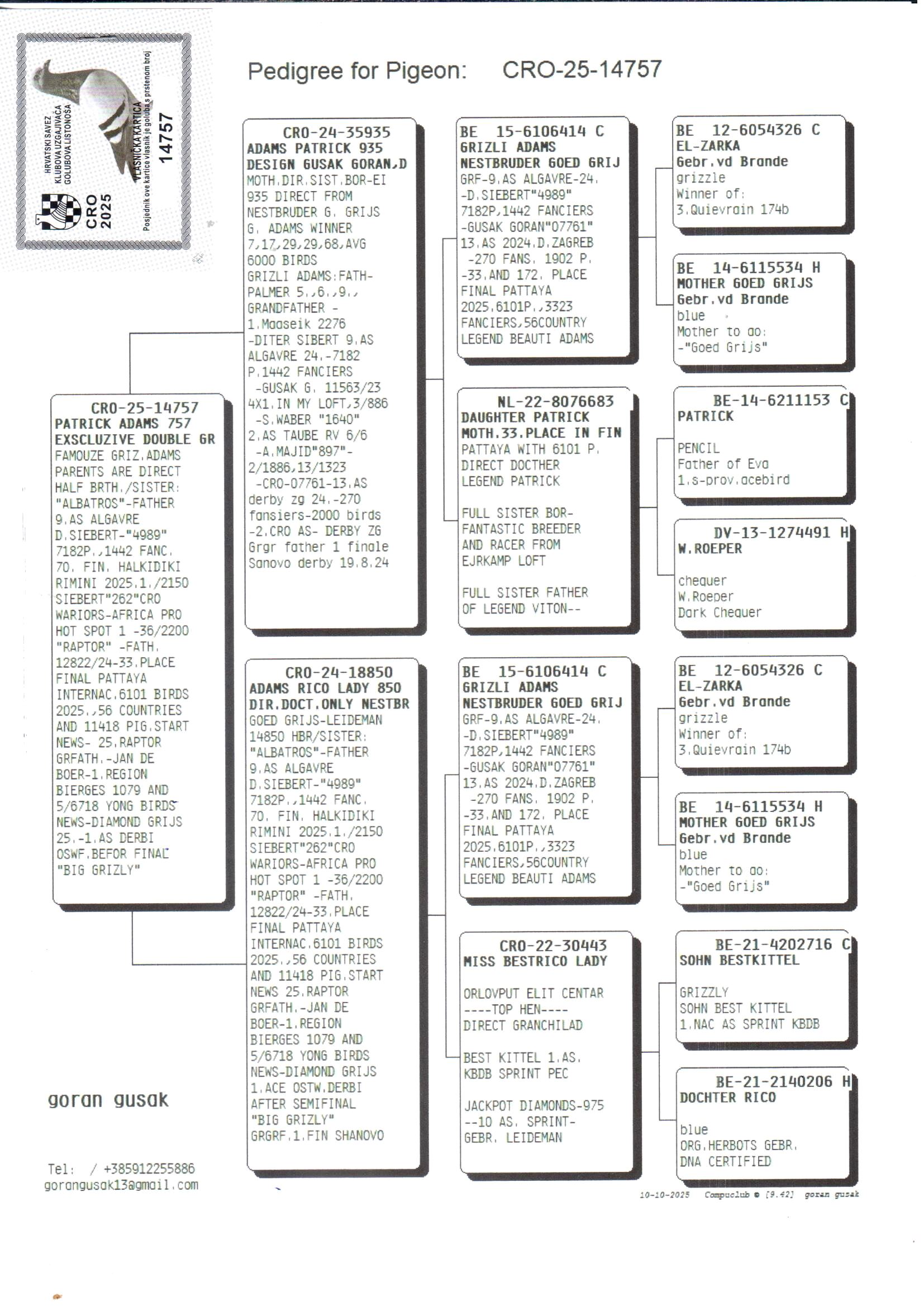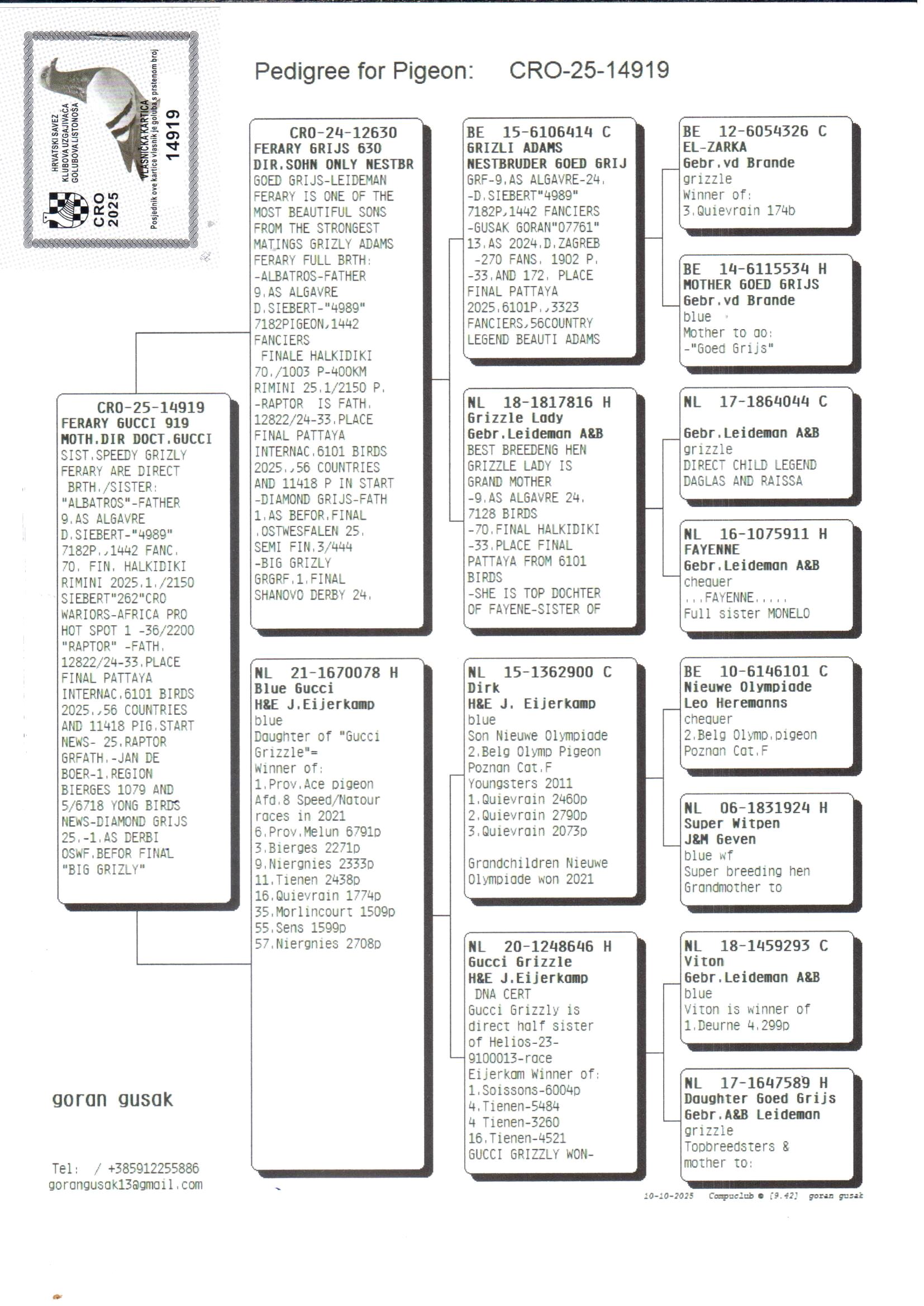 Grandchild of “Grizli Adams” – direct nest brother of “Goed Grijs”; 7 x 1° prize
