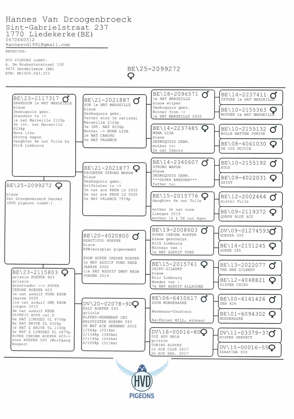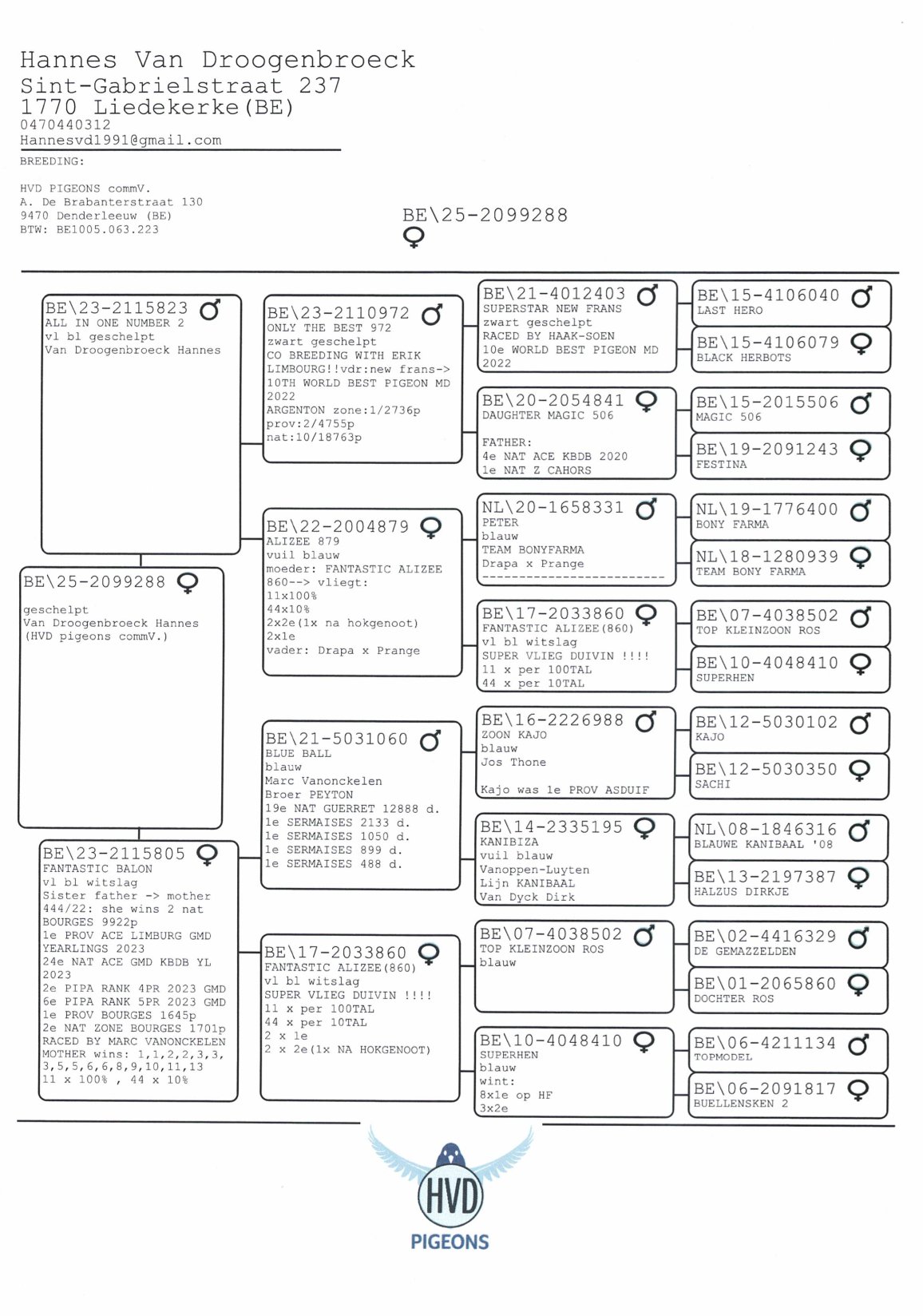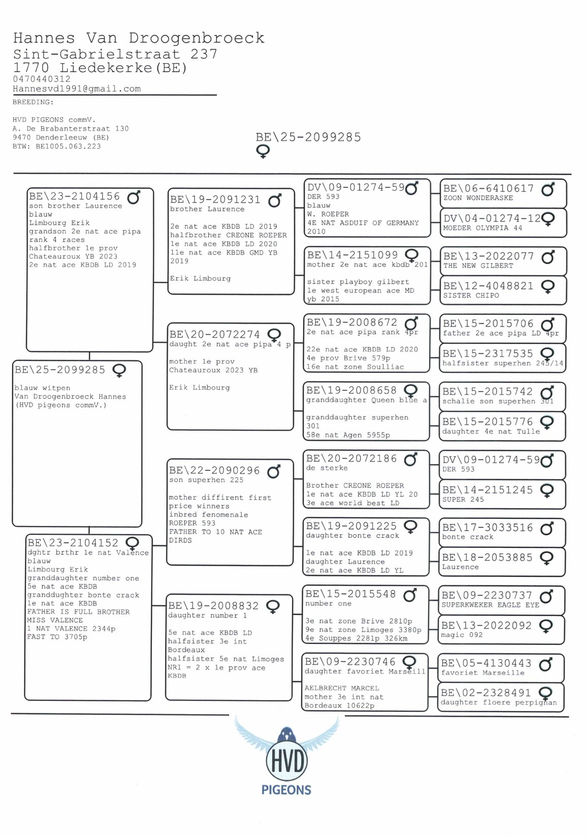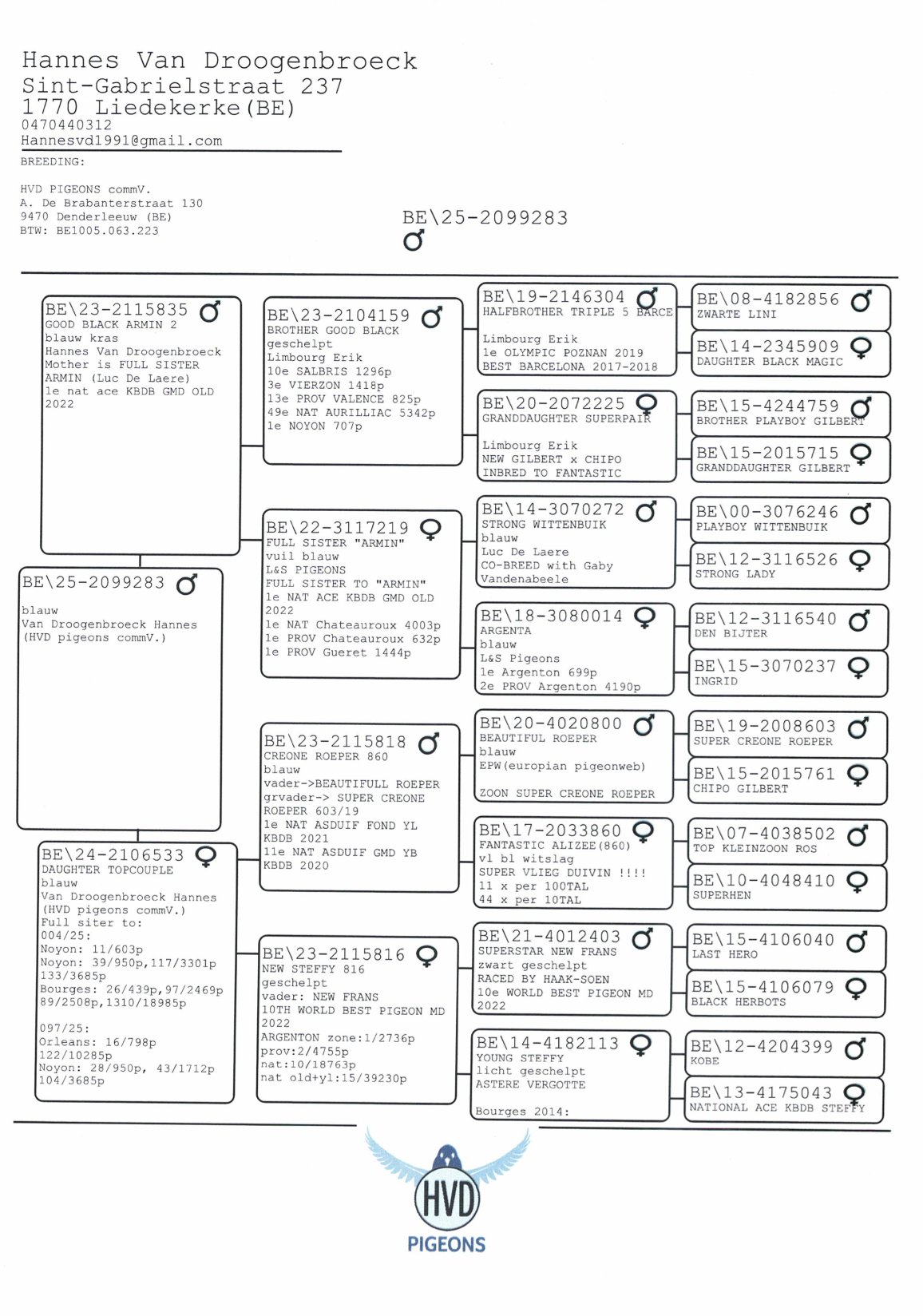 Mother is full sister of “Armin”; 1st National Ace KBDB GMD old birds ’22 (Luc De Laere)