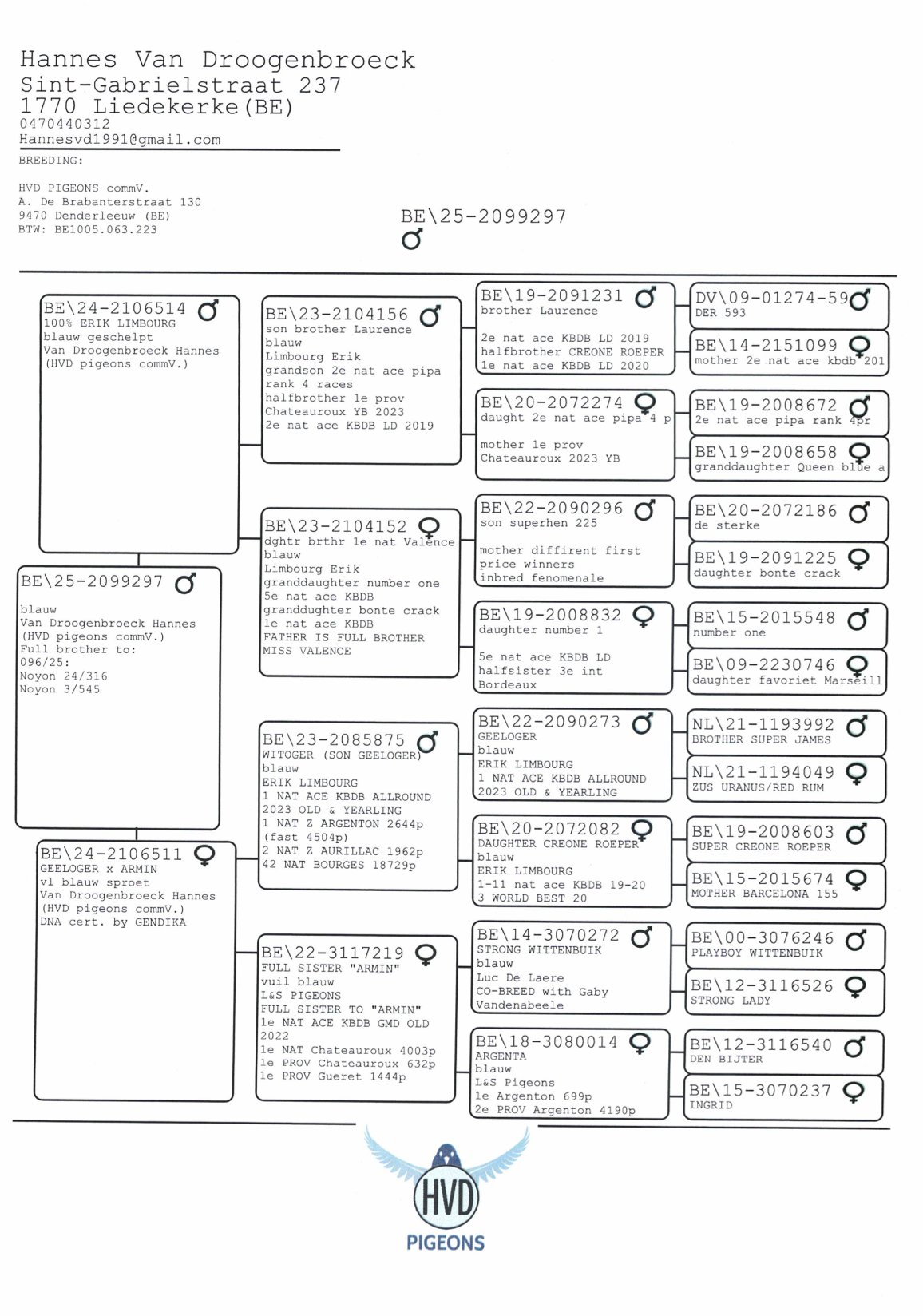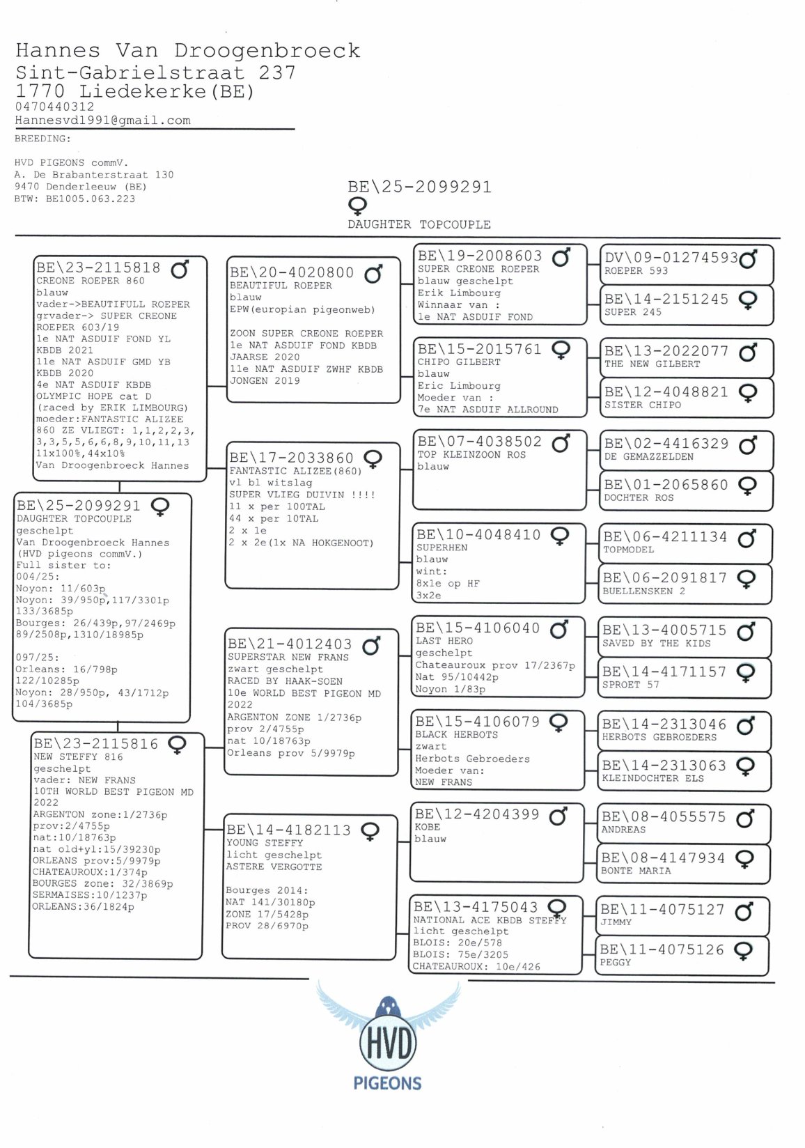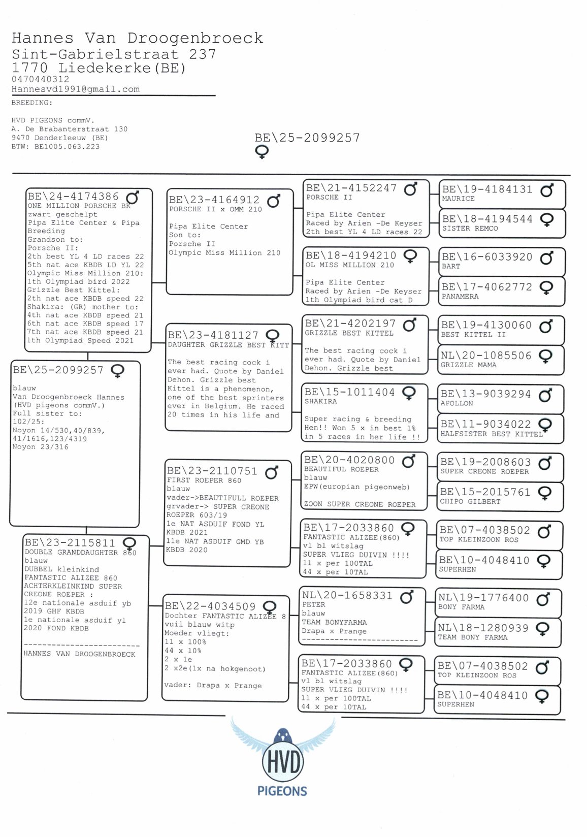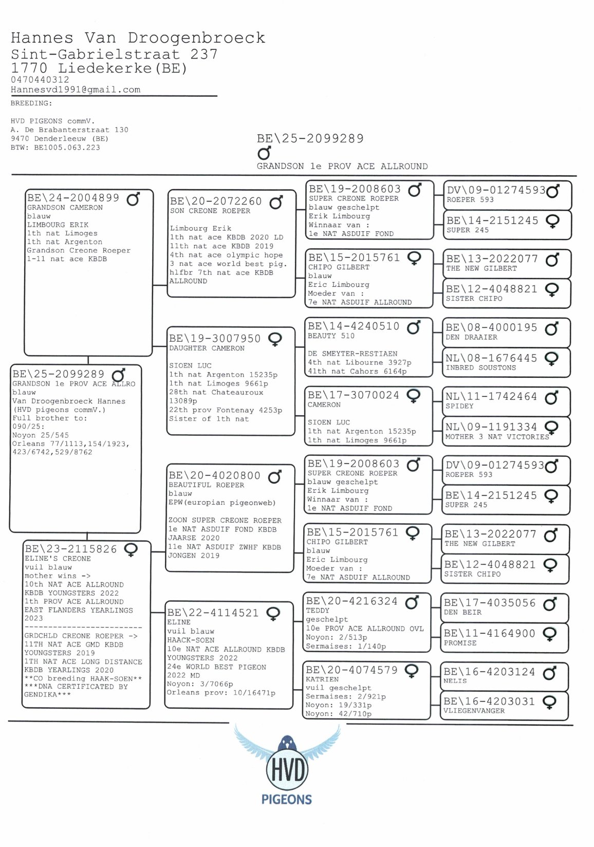 Mother is full sister of “Armin”; 1st National Ace KBDB GMD old birds ’22 (Luc De Laere)
