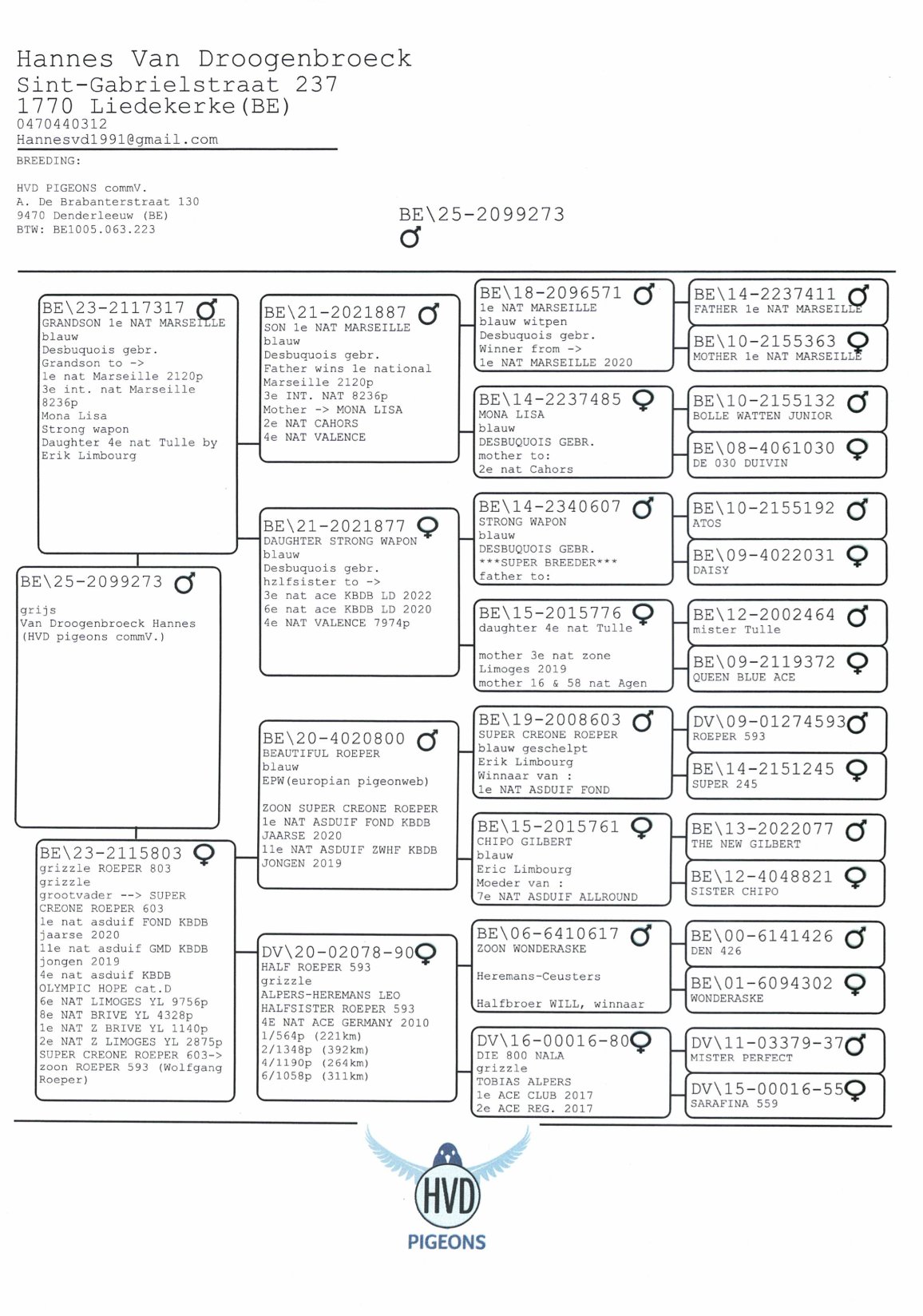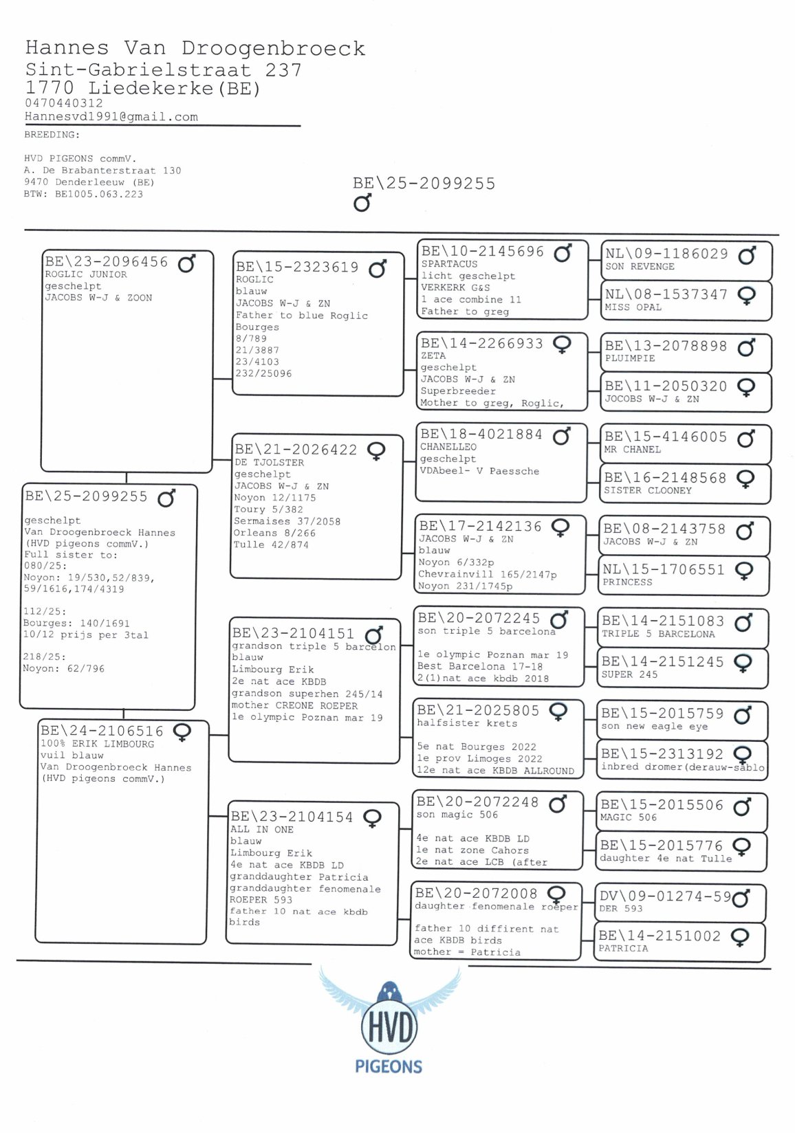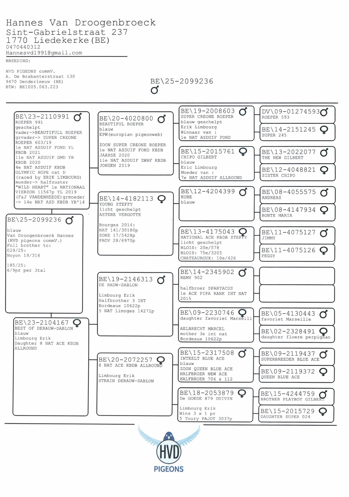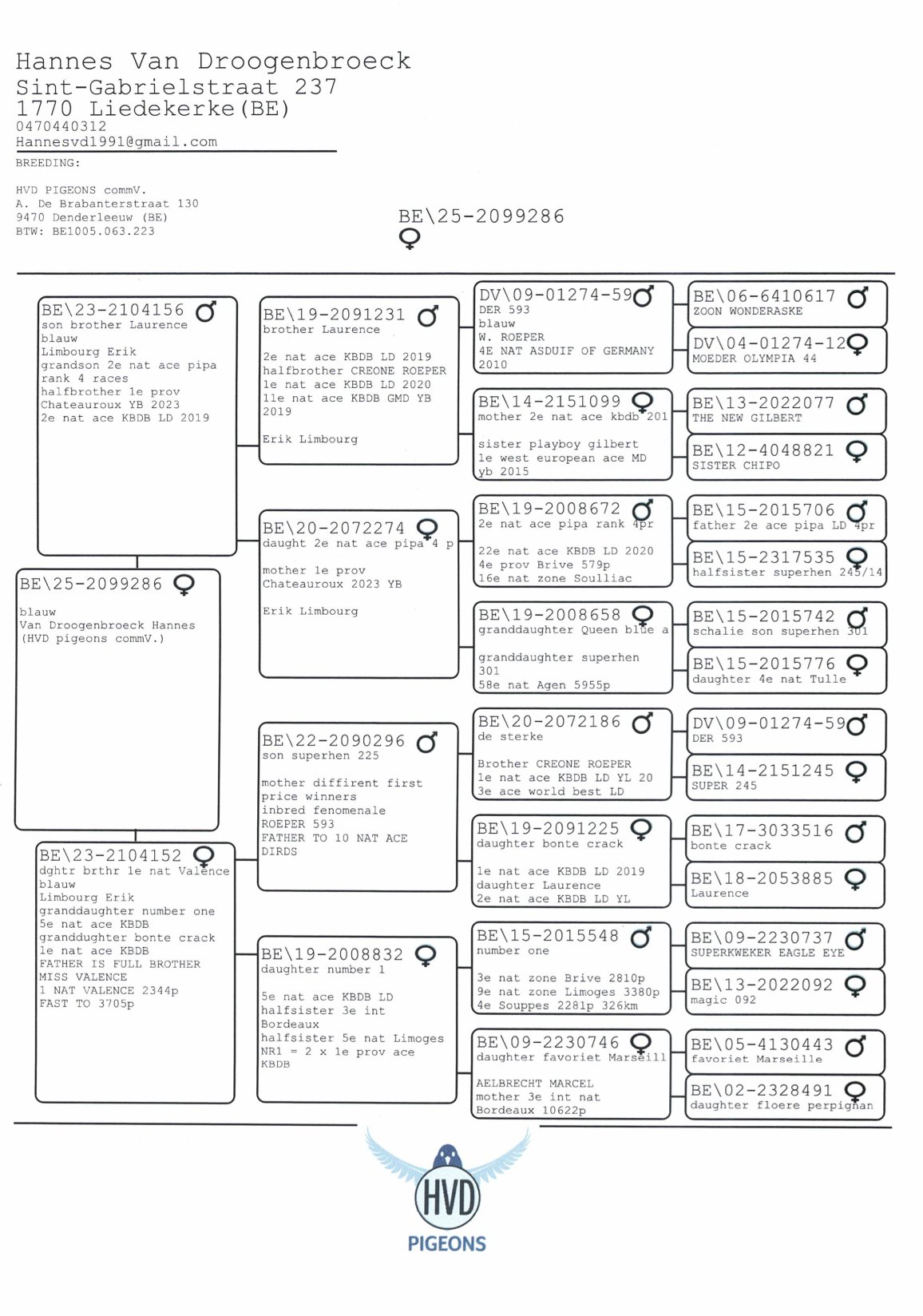 Mother is full sister of “Armin”; 1st National Ace KBDB GMD old birds ’22 (Luc De Laere)