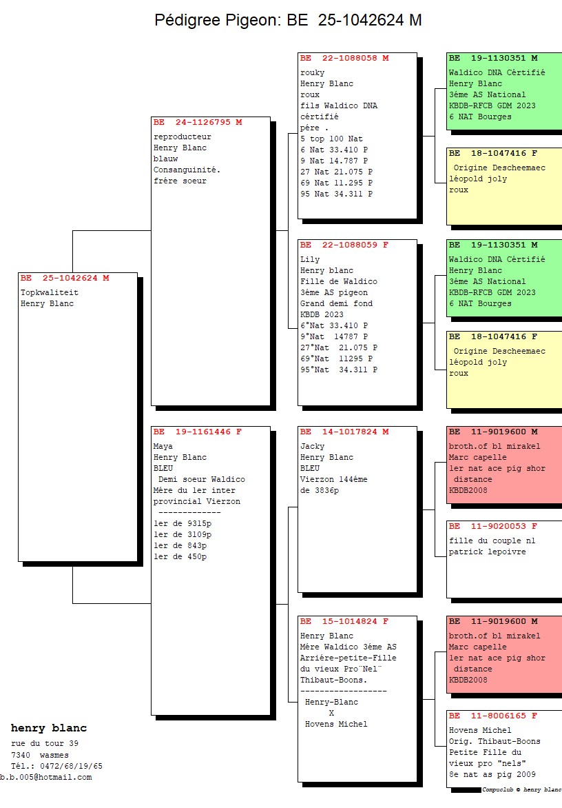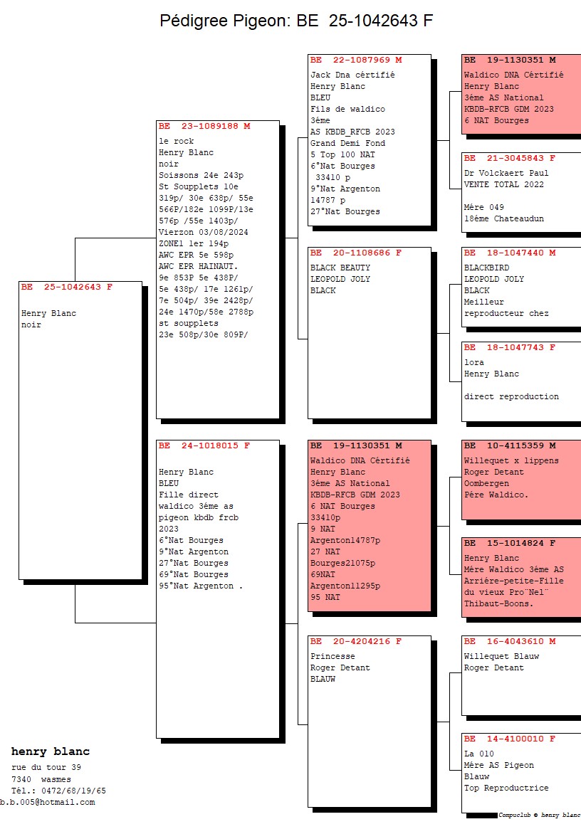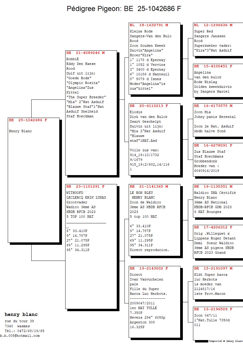 Over the years, this tandem has focused on the large middle distance where, despite a small colony, the results are impressive. A provisional highlight was achieved in 2023 with 3rd National Ace Pigeon ‘Waldico’. A true white raven among pigeons, which quickly became the key breeder of the colony. For example, a grandson won this year's Interprovincial flight from Vierzon and also became the fastest pigeon of the release against 9,242 competitors! This small yet quality auction of the likeable Henry-Blanc tandem largely revolves around their racing miracle ‘Waldico’. Which lucky one can take one home?