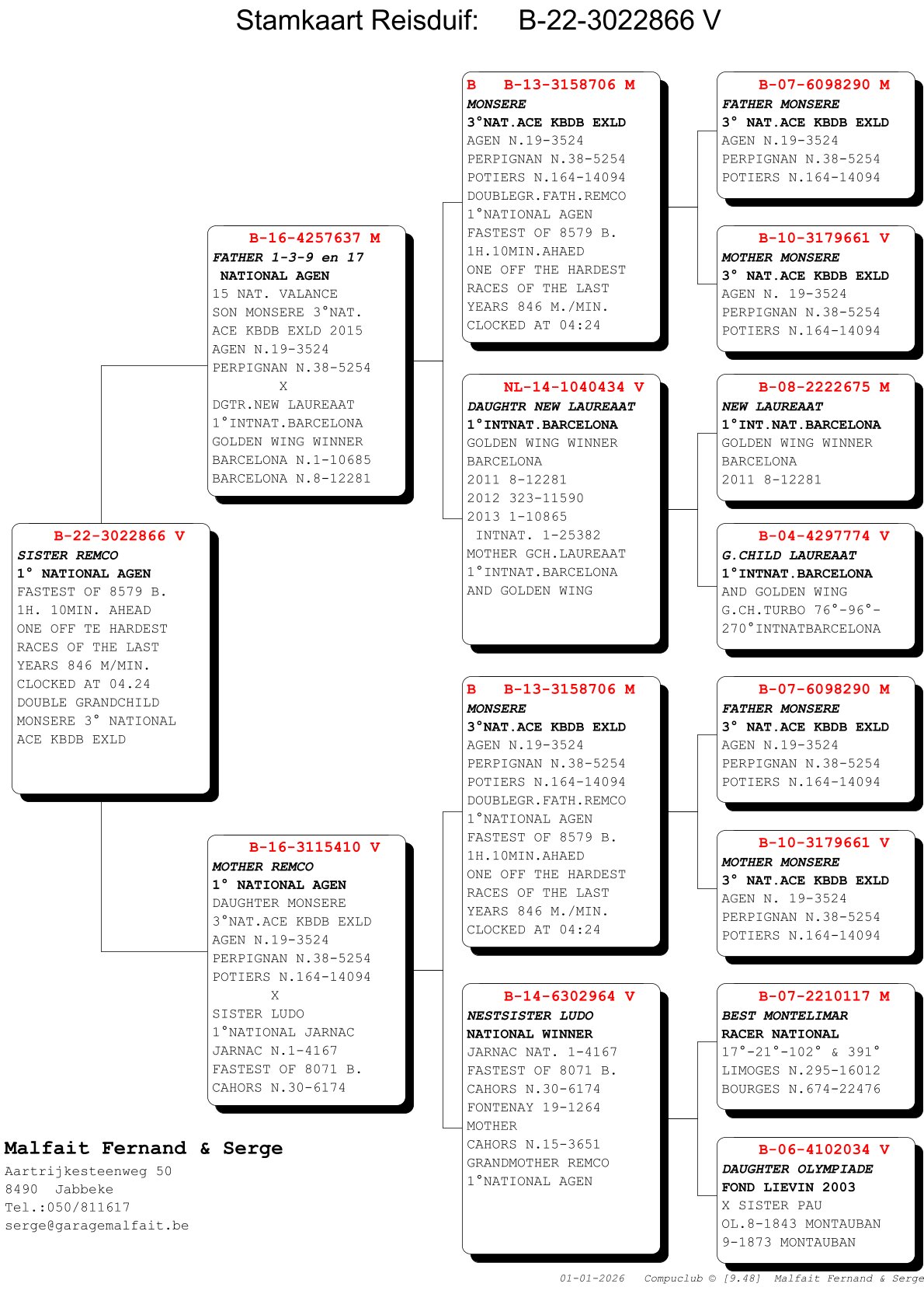 Mother is daughter of “Remco”; 1st Nat Agen – fastest of 8579d and mother of “Monsere”; 3rd Nat As EXLD