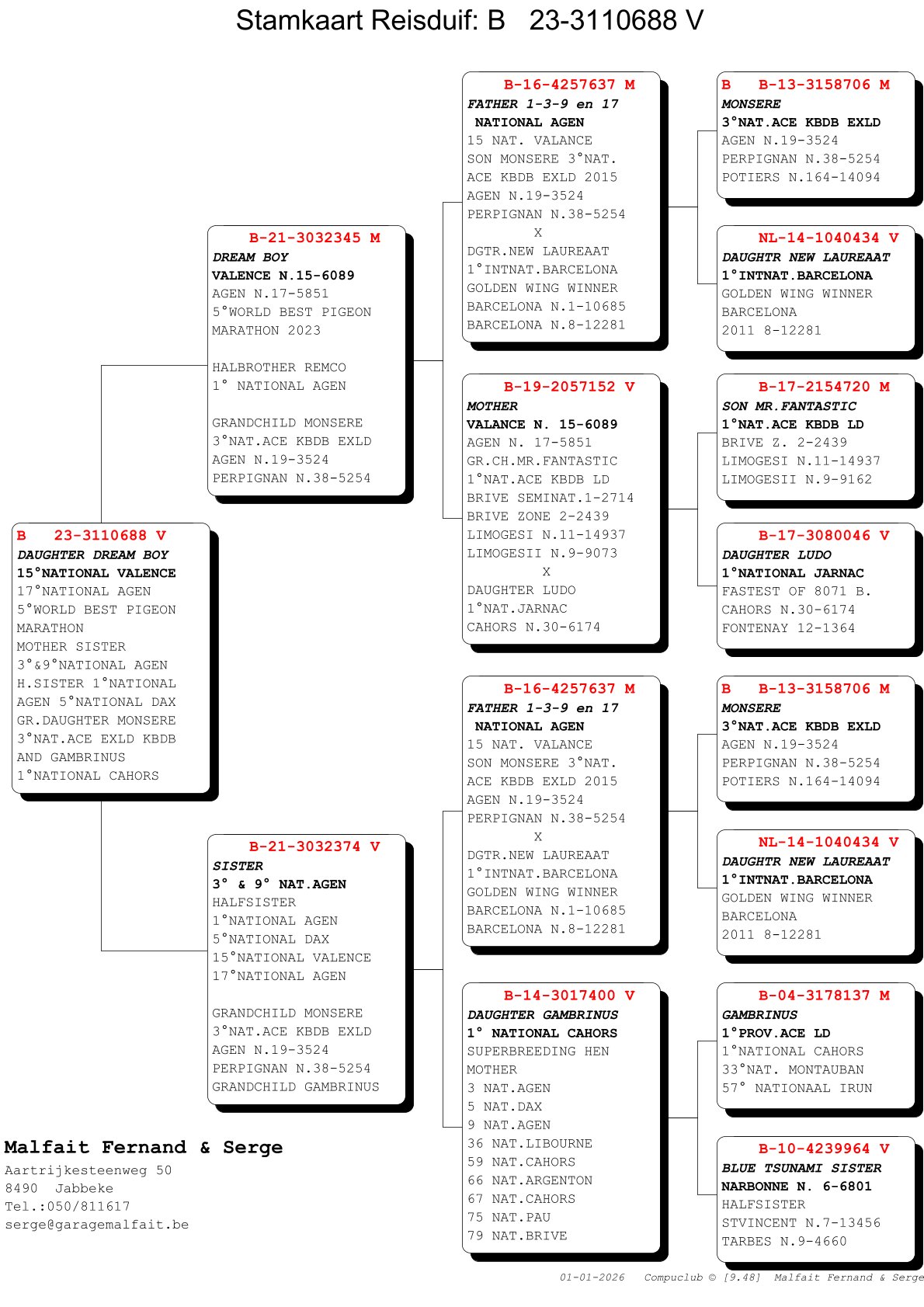 Father comes from “Remco”; 1st Nat Agen – fastest of 8579d and sister “Ludo”; 1st Nat Jarnac – fastest of 8071d