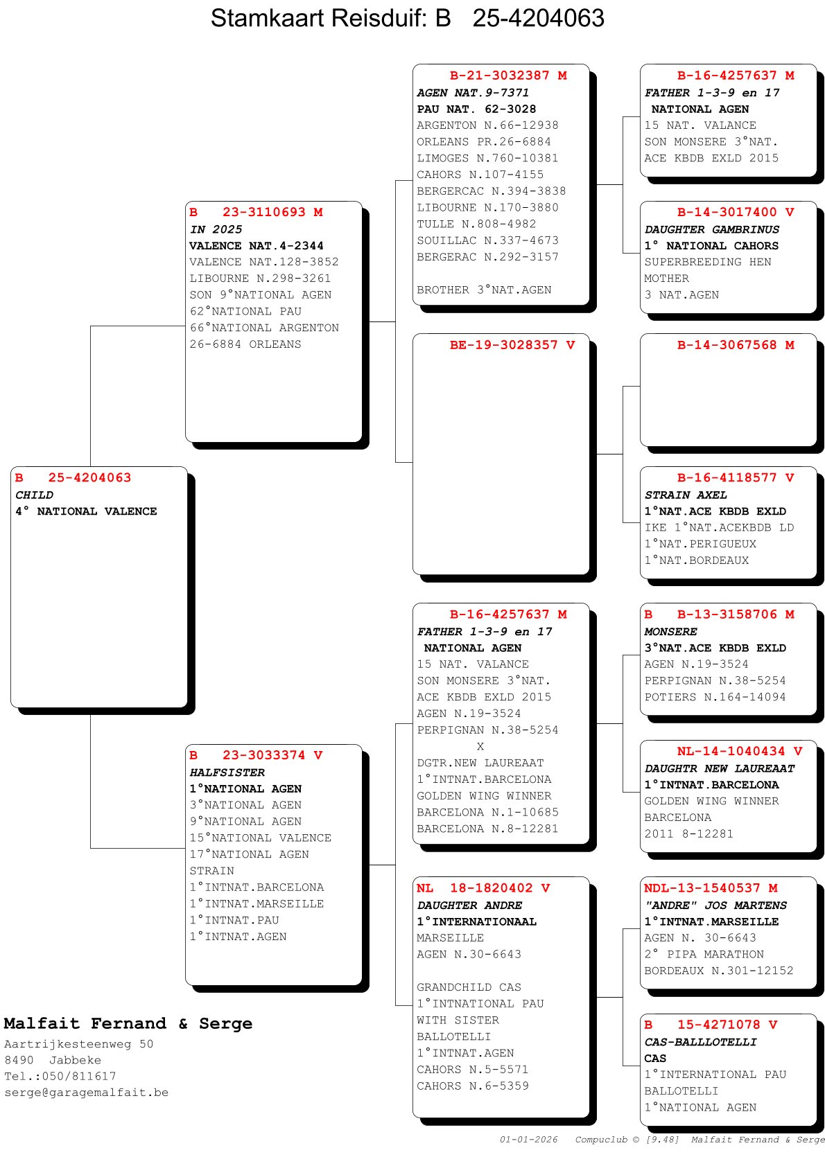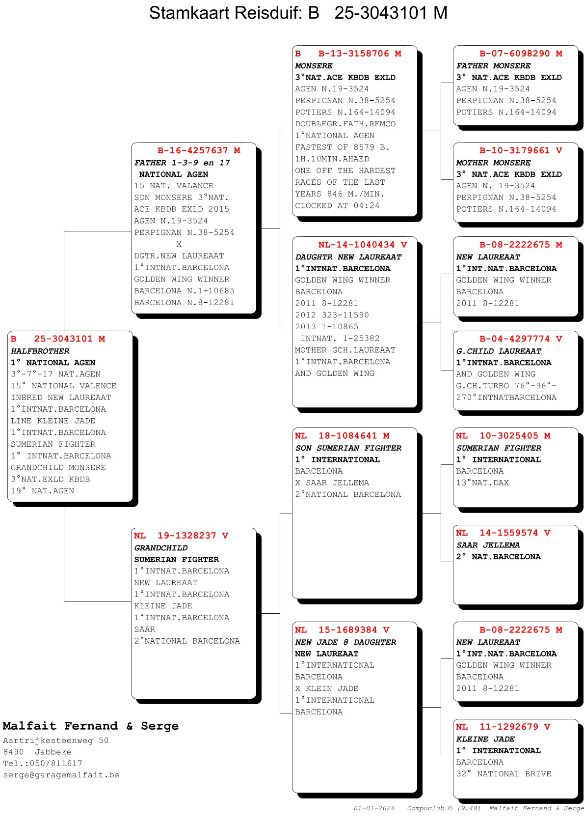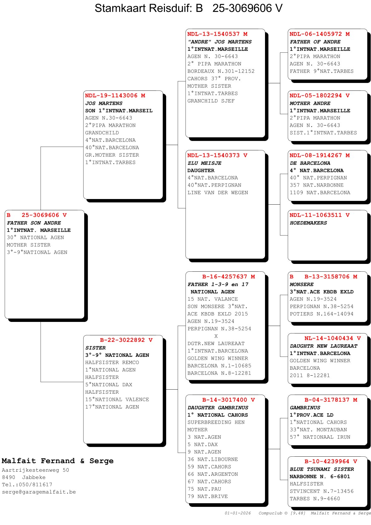 The national victories from Dax, Jarnac, and Agen are only the tip of the iceberg of what the Malfait pigeons have to offer. Because what an impressive list of top results they have already achieved! With the exceptionally strong bloodline in which top breeders “Monsere,” “Ludo,” and “Wout” serve as key pillars, Fernand and Serge Malfait have clearly found their way to the international elite and prove year after year that they are here to stay. They achieve this with an extremely simple care routine and a system that relies entirely on the intrinsic quality of the pigeon itself. A small offering this year, but one that can provide a magnificent future for the buyers!