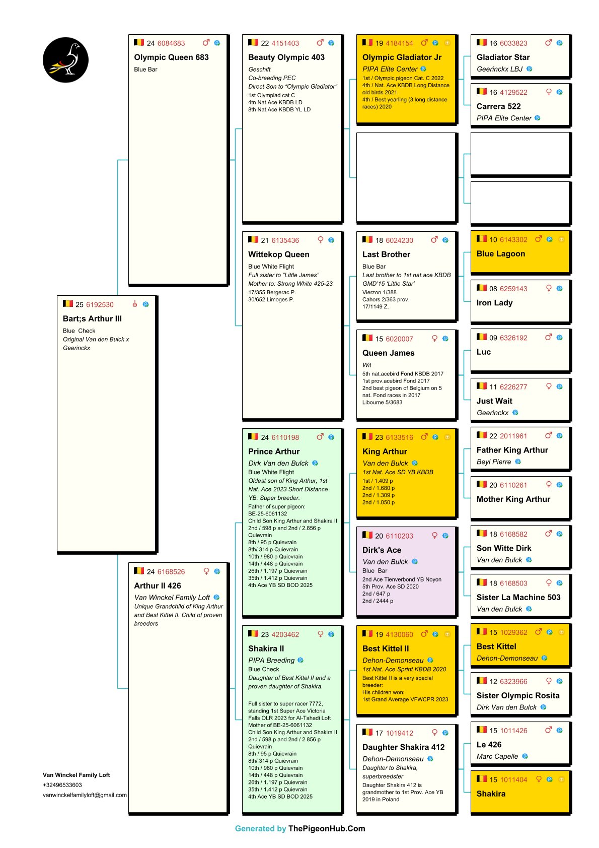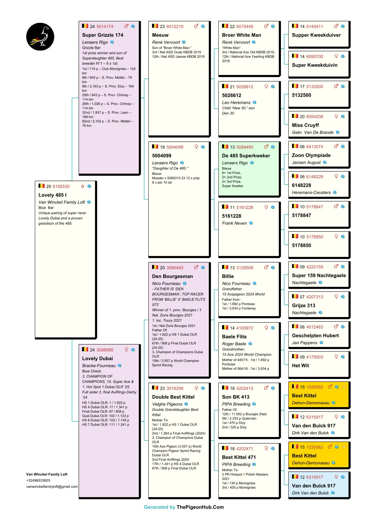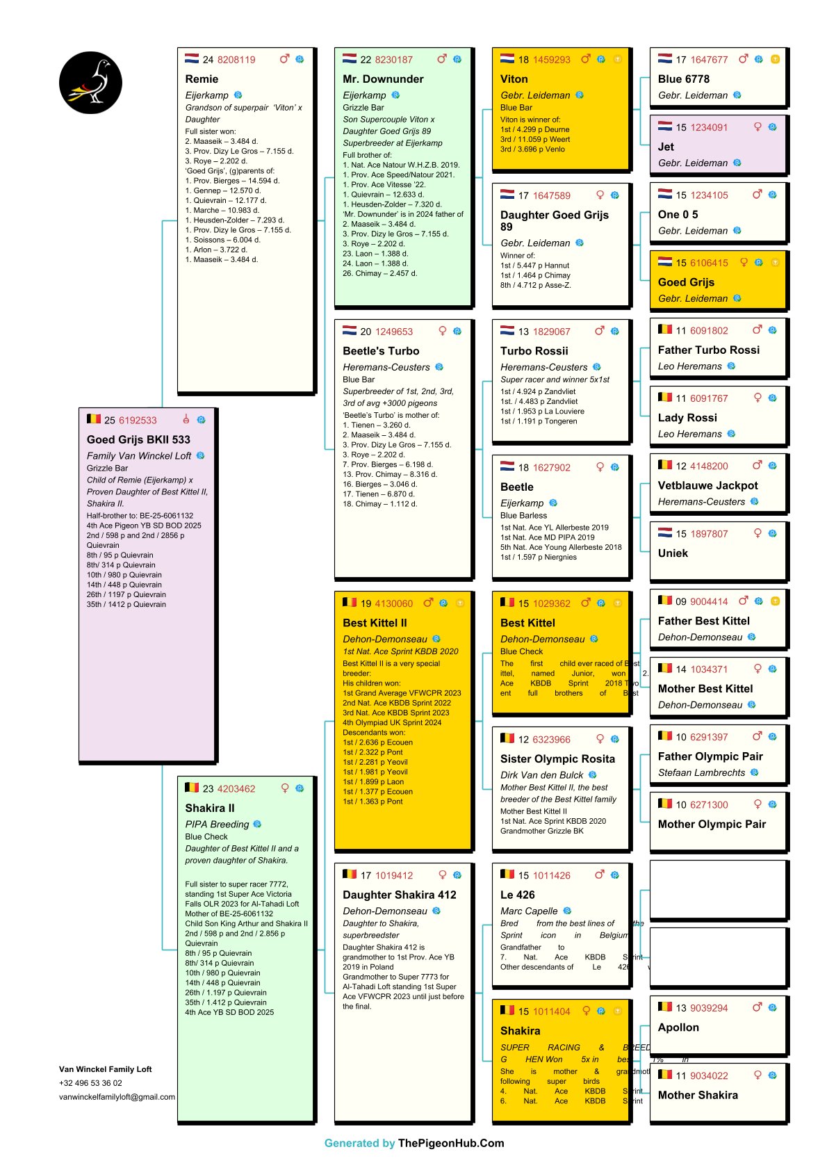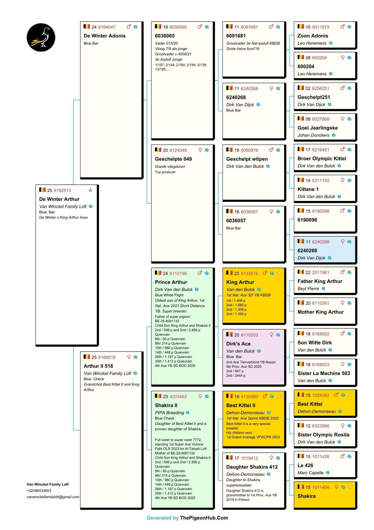 The Van Winckel family had a fantastic 2025 season, winning no fewer than 23 first prizes—without doubles. They also achieved international success under the name Noah Loft. They possess a unique collection of pigeons and are home to some of the best pigeons in the world. Among them are "Burj Khalifa", winner and icon of the Dubai OLR, and direct descendants of "Best Kittel II", one of the best breeders in modern pigeon racing. The family also owns direct descendants of some of the best racing pigeons from the famous Flanders Collection, such as direct descendants of "Blizzard King Kittel" and "Phantom Blizzard," as well as pigeons from renowned breeders Dirk Van den Bulck and Pierre Beyl. Other important breeders within the family include direct descendants of "Junior," "White Man," "Best Kittel," "Gargenton," "Blue Best Kittel," "Ernest," and "Grizzly Adams." These exceptional bloodlines form the strong foundation for breeding top-notch pigeons. Pitts is proud to offer its first selection for auction!