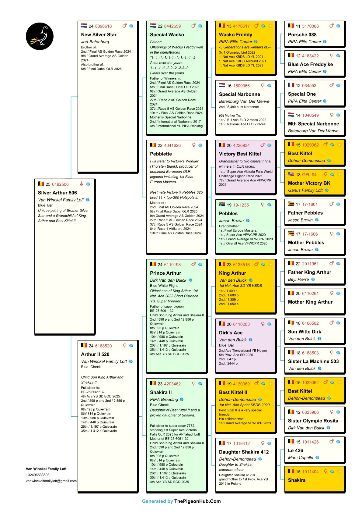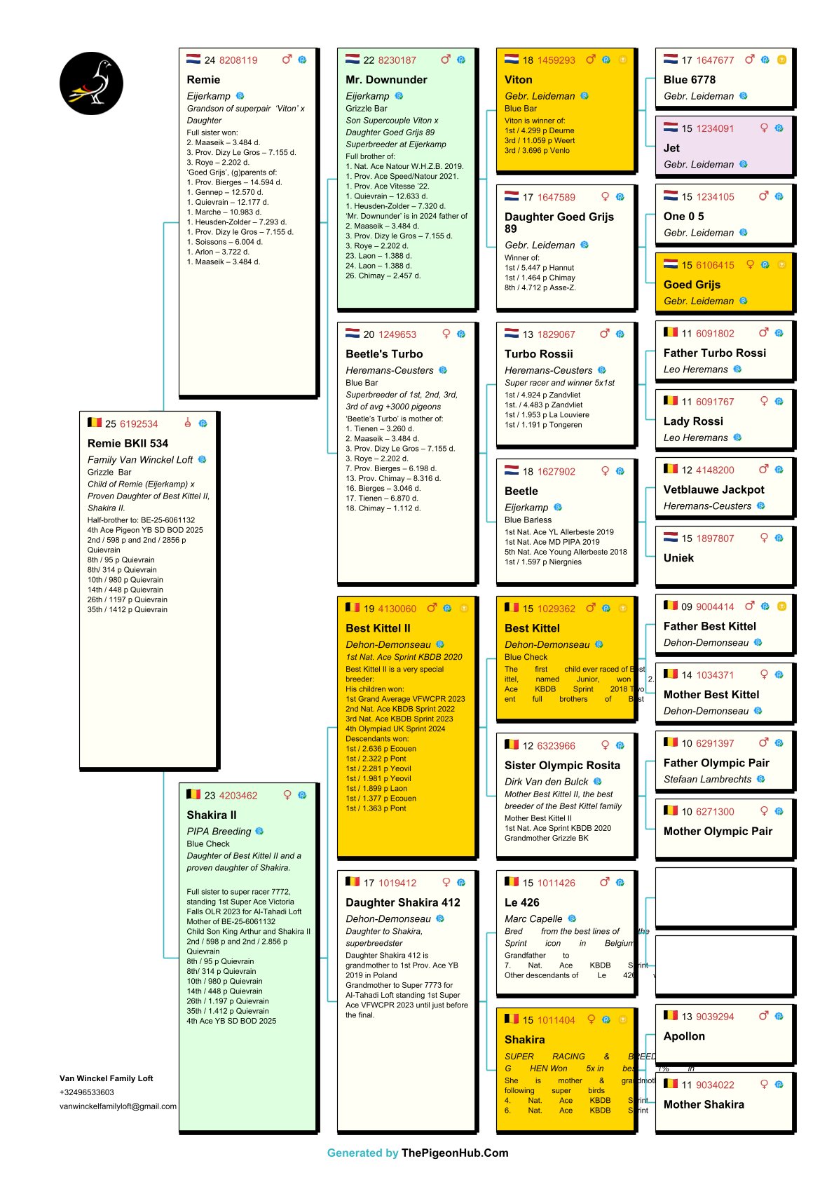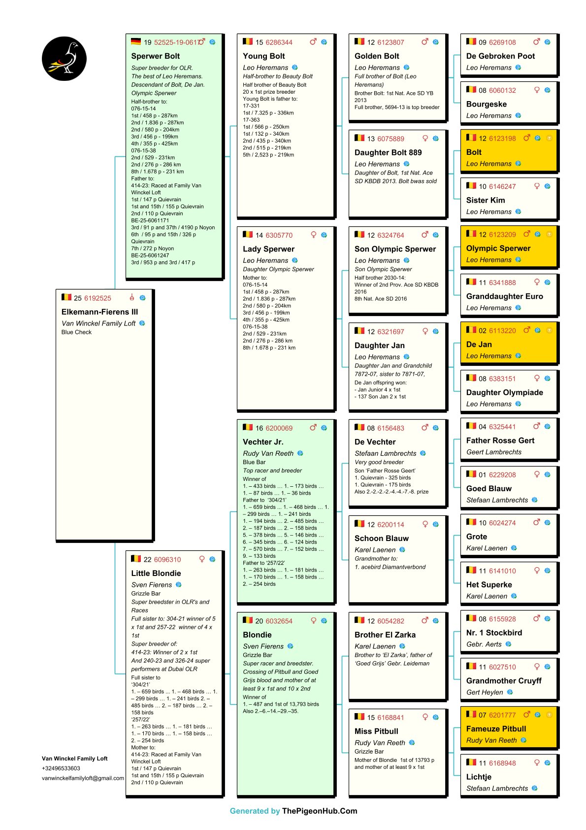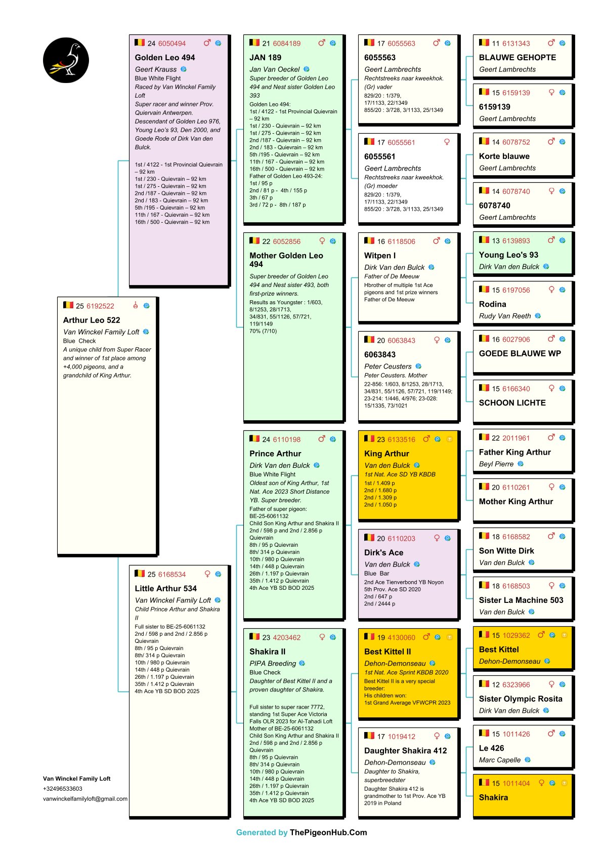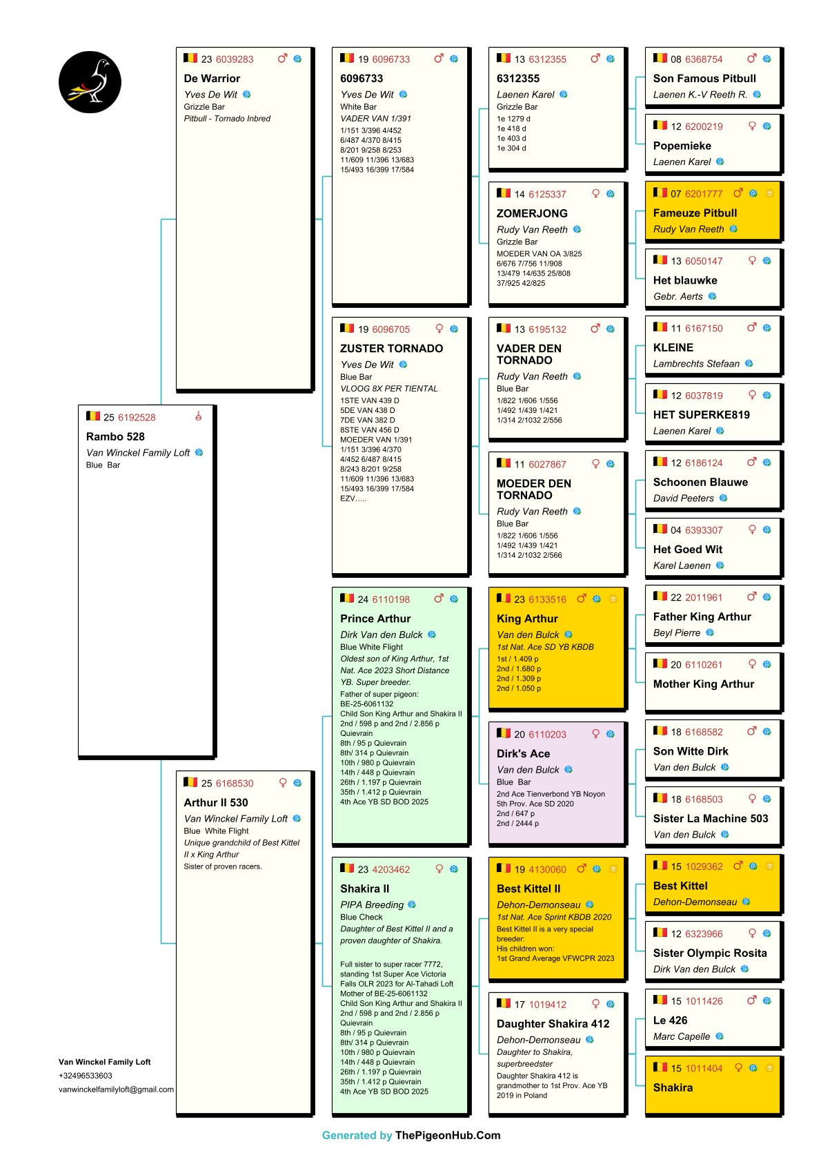 The Van Winckel family had a fantastic 2025 season, winning no fewer than 23 first prizes—without doubles. They also achieved international success under the name Noah Loft. They possess a unique collection of pigeons and are home to some of the best pigeons in the world. Among them are "Burj Khalifa", winner and icon of the Dubai OLR, and direct descendants of "Best Kittel II", one of the best breeders in modern pigeon racing. The family also owns direct descendants of some of the best racing pigeons from the famous Flanders Collection, such as direct descendants of "Blizzard King Kittel" and "Phantom Blizzard," as well as pigeons from renowned breeders Dirk Van den Bulck and Pierre Beyl. Other important breeders within the family include direct descendants of "Junior," "White Man," "Best Kittel," "Gargenton," "Blue Best Kittel," "Ernest," and "Grizzly Adams." These exceptional bloodlines form the strong foundation for breeding top-notch pigeons. Pitts is proud to offer its first selection for auction!