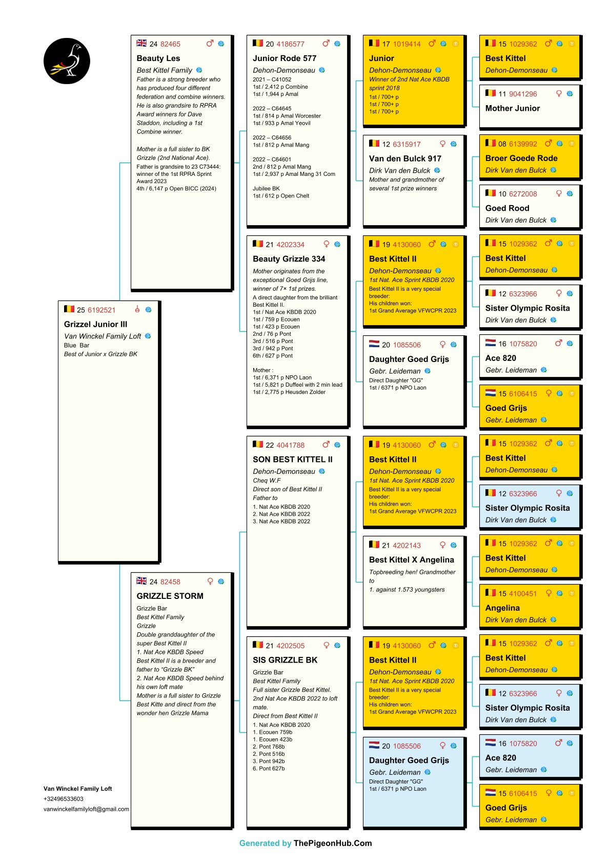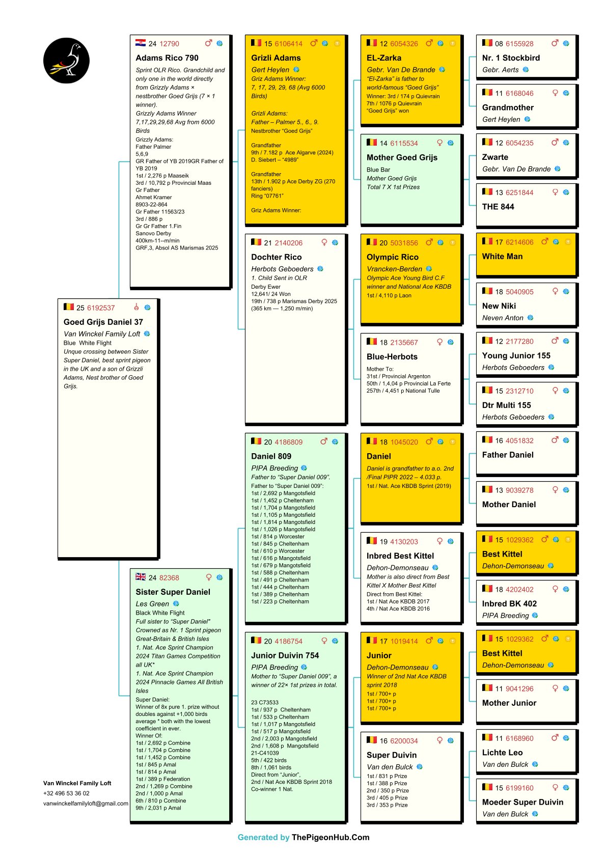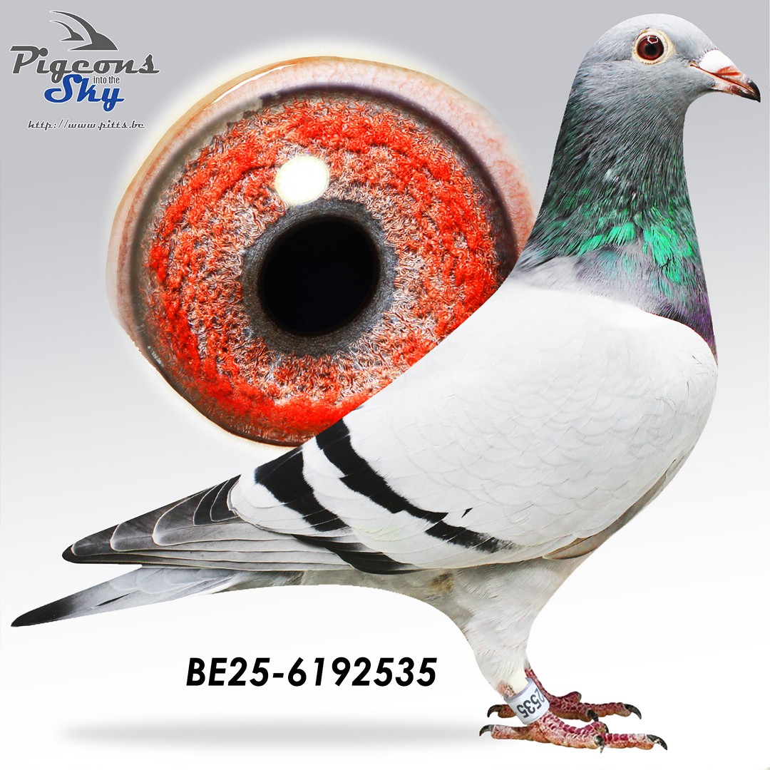 Unique cross between sister “Super Daniel”, best sprint pigeon in the UK, and a son of “Grizzli Adams”, nest brother of “Goed Grijs”; 7 x 1° prize