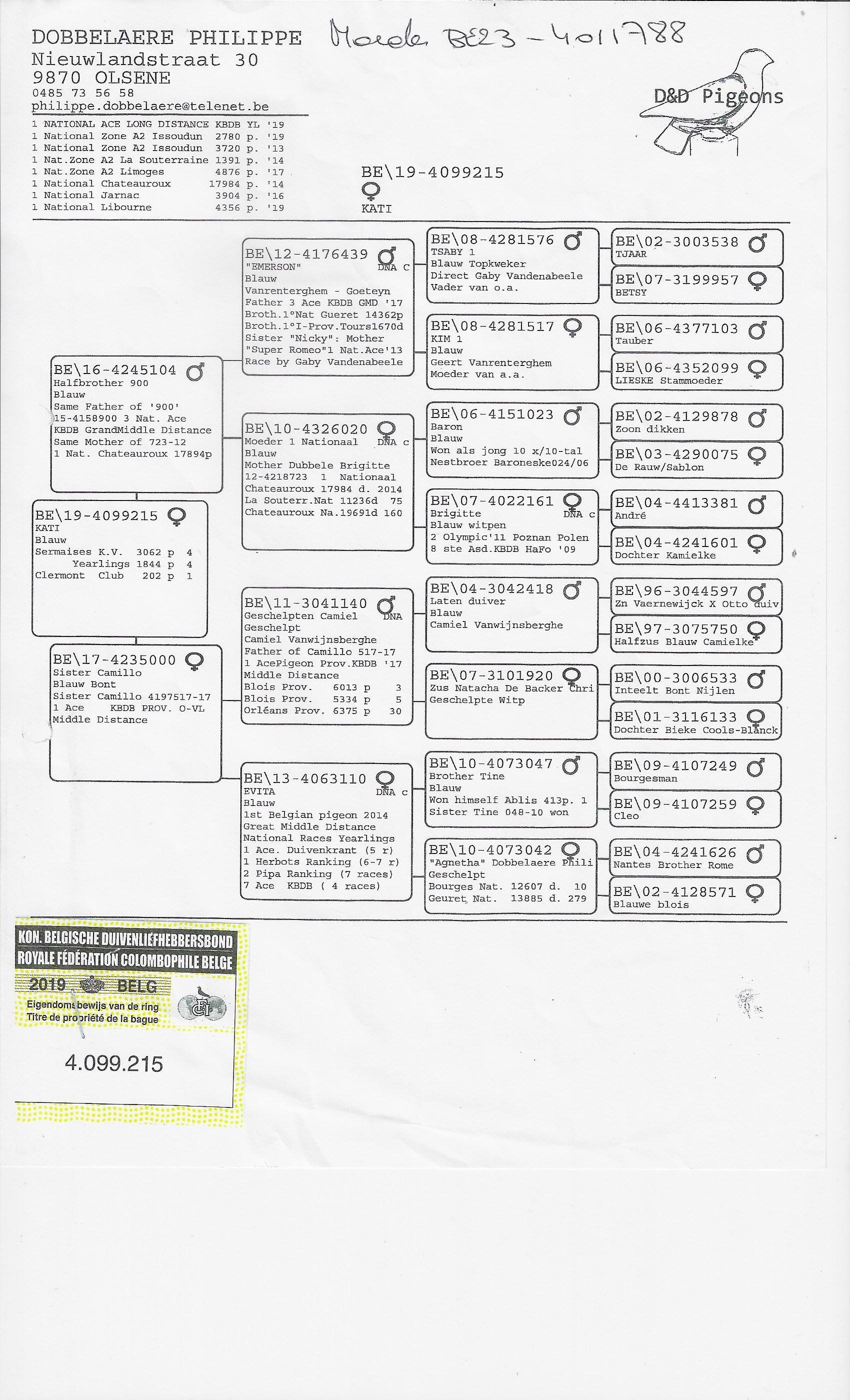 On the mother’s side, we see a full sister of Den Argenton (BE18‑4076082) and a half-sister of Golden Remco, 1st National Tulle. Mother 215/19 Kati herself flew 4th Provincial Sermaise (3,062 pigeons) and 1st Clermont (202 pigeons).