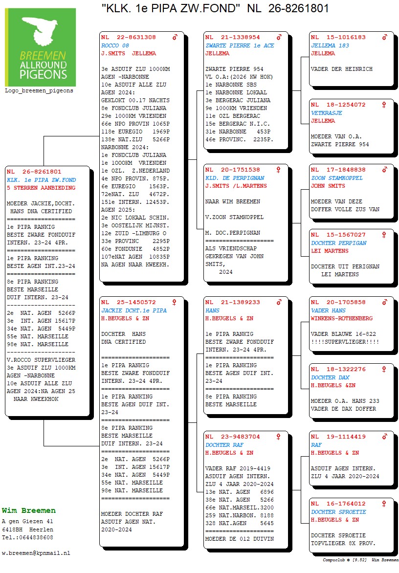 After health problems and several hospitalisations a few years back, Wim Breemen is back from - actually never!- being away. 2024 and 2025 were again brilliant seasons, in which he came knocking at the national and international window again. That Wim is a man of few frills, we have known for longer than today: ‘good pigeons and keeping them as close to nature as possible’ is his motto. A small auction, but brimming with quality, as we have come to expect from this ever-sympathetic Dutchman!