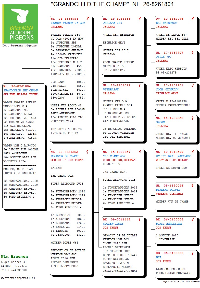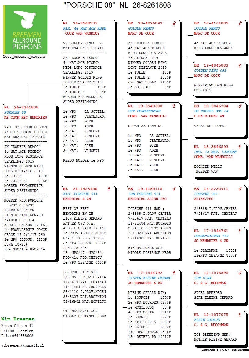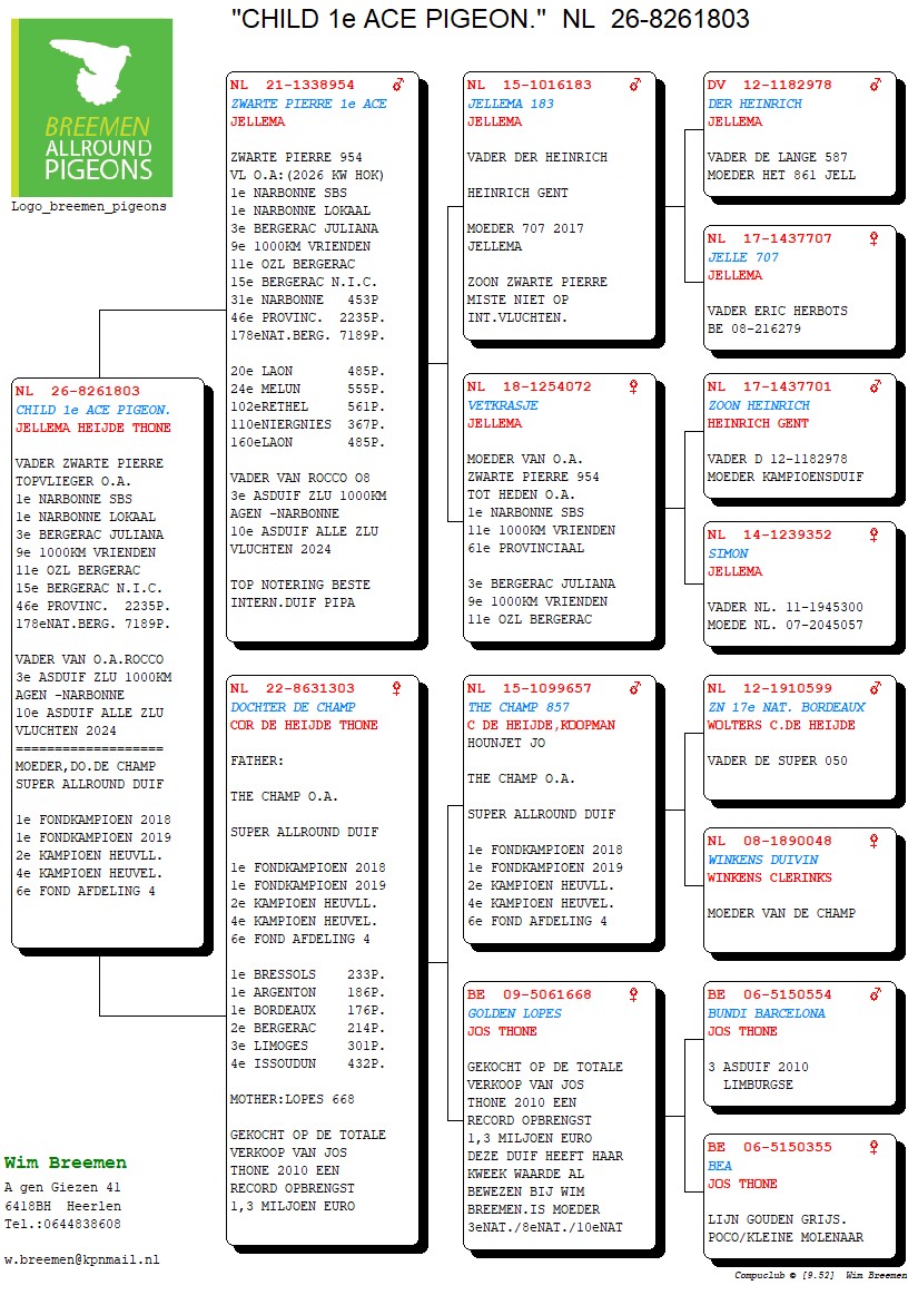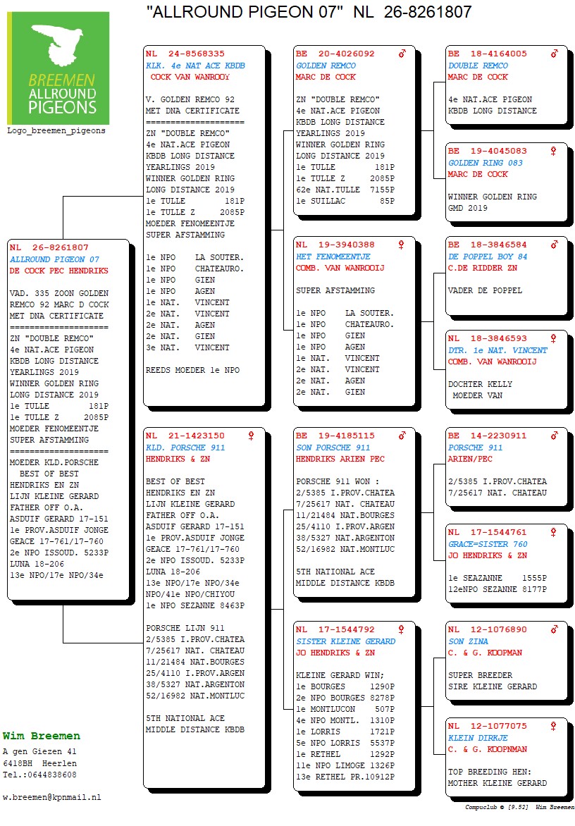 Line “Kleine Gerard”, father of among others “Asduif Gerard”; 1st Provincial Ace Young Birds, “Geace”; 2nd NPO Issoudun 5,233 birds and “Luna”; 13th, 17th and 34th NPO
