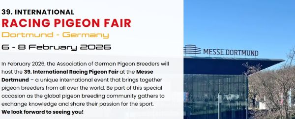 In February 2026, the Association of German Pigeon Breeders will host the 39. International Racing Pigeon Fair at the Messe Dortmund – a unique international event that brings together pigeon breeders from all over the world. Be part of this special occasion as the global pigeon breeding community gathers to exchange knowledge and share their passion for the sport.