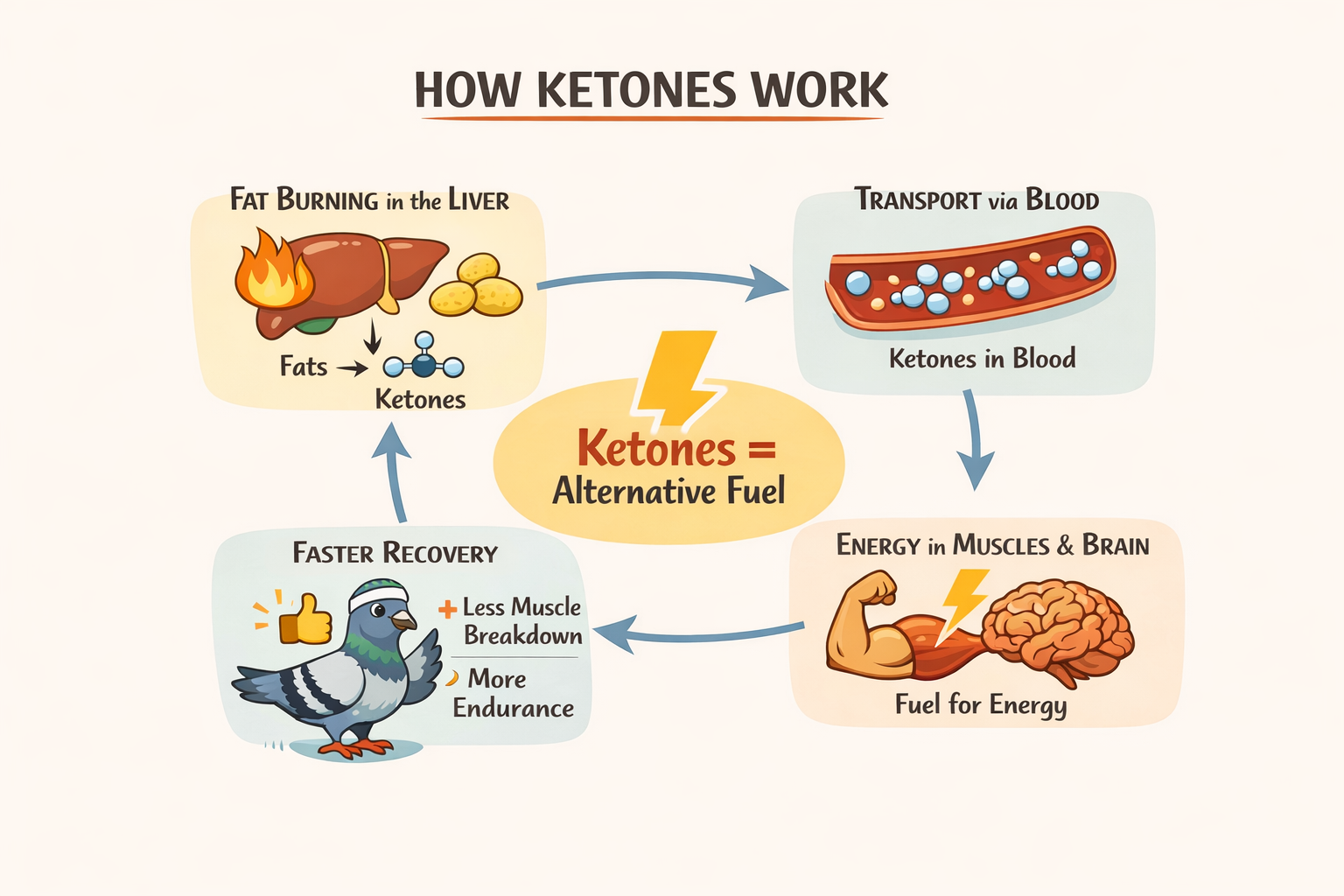 An important positive effect of ketones is their ability to protect muscle tissue. When energy becomes scarce, the body may break down proteins to produce glucose. Ketones reduce this need, helping preserve muscle mass. For racing pigeons, this means less muscle breakdown during demanding long-distance races and faster recovery afterward. Less muscle damage often translates into less fatigue and better condition in the weeks following a tough competition.