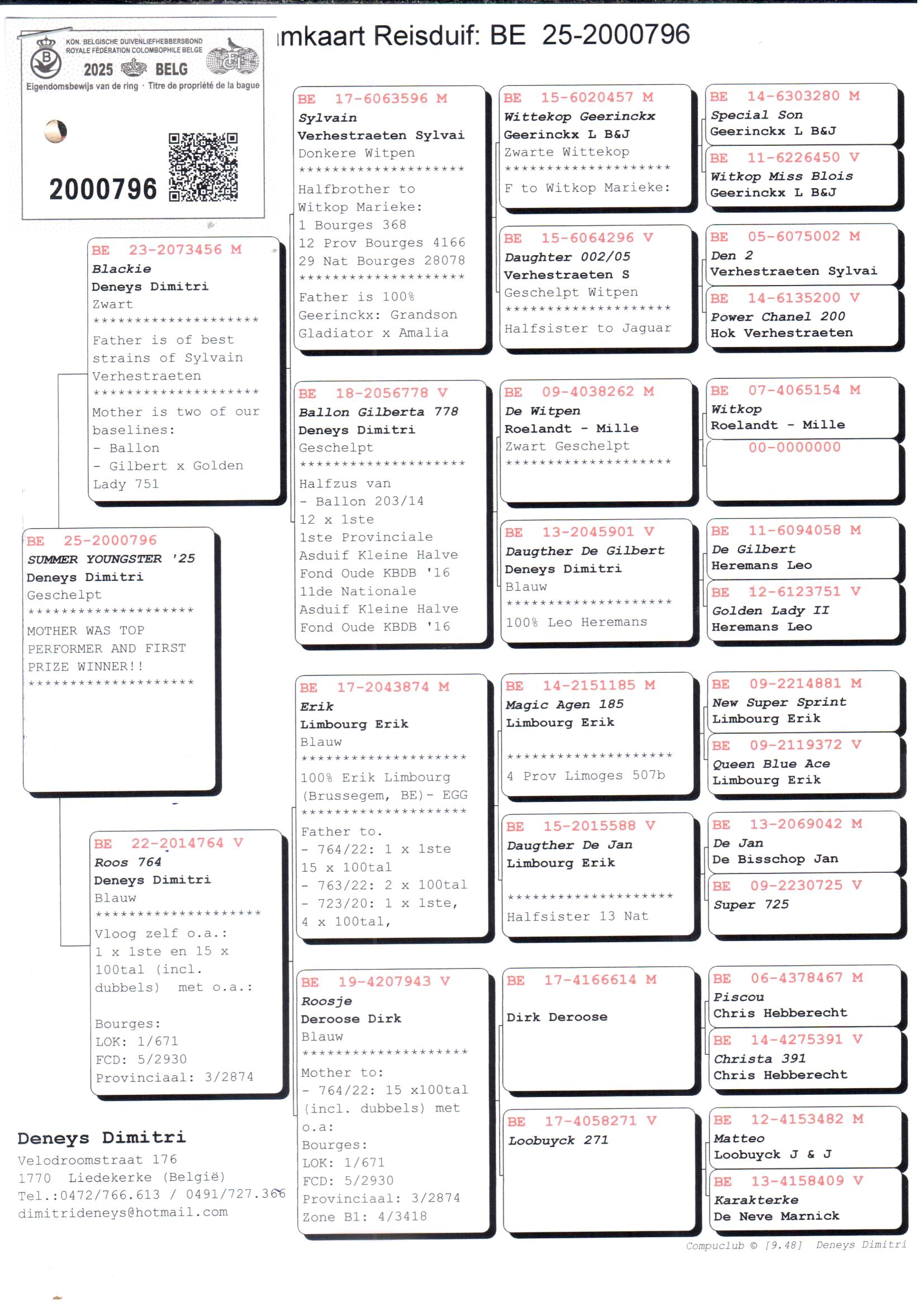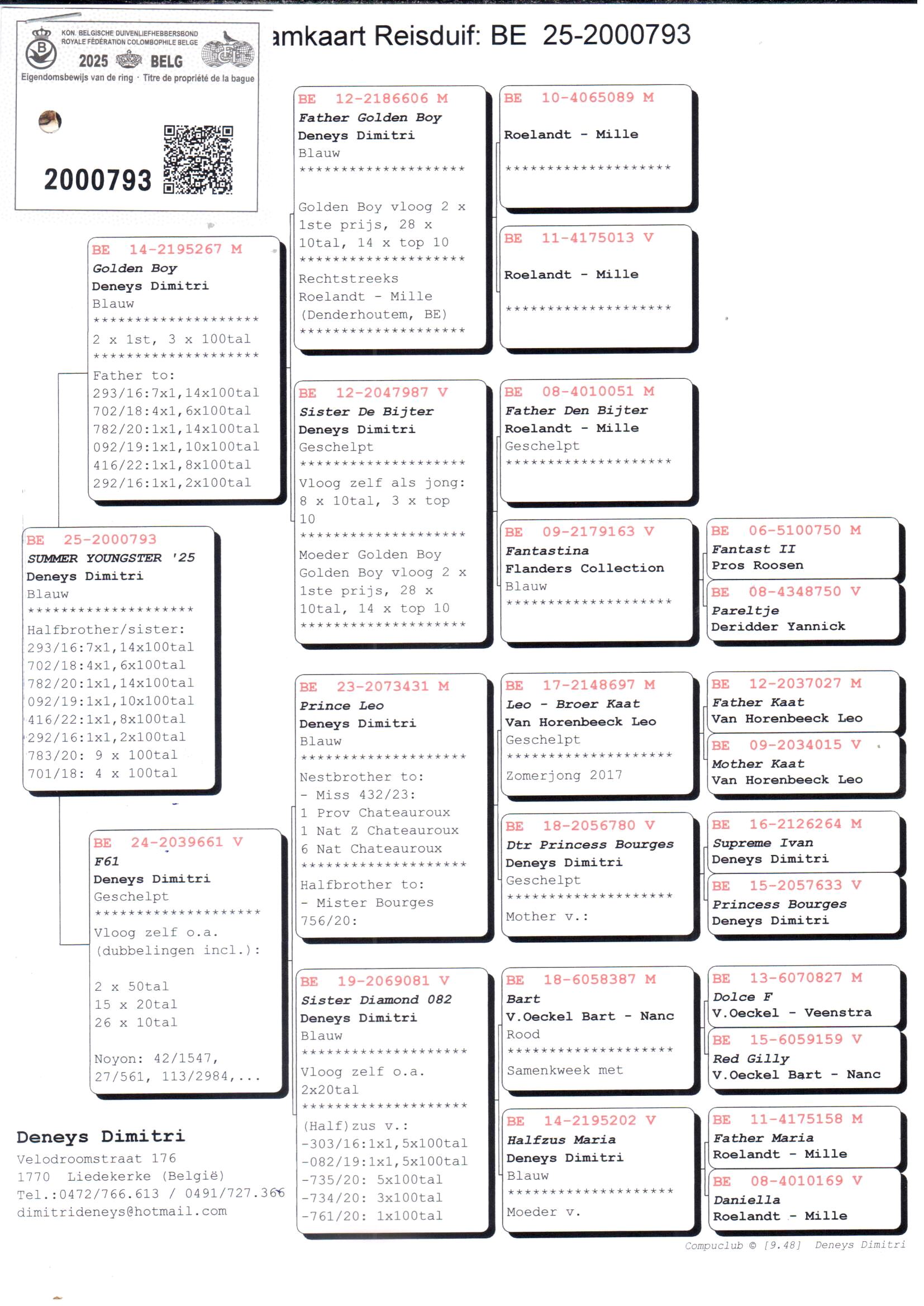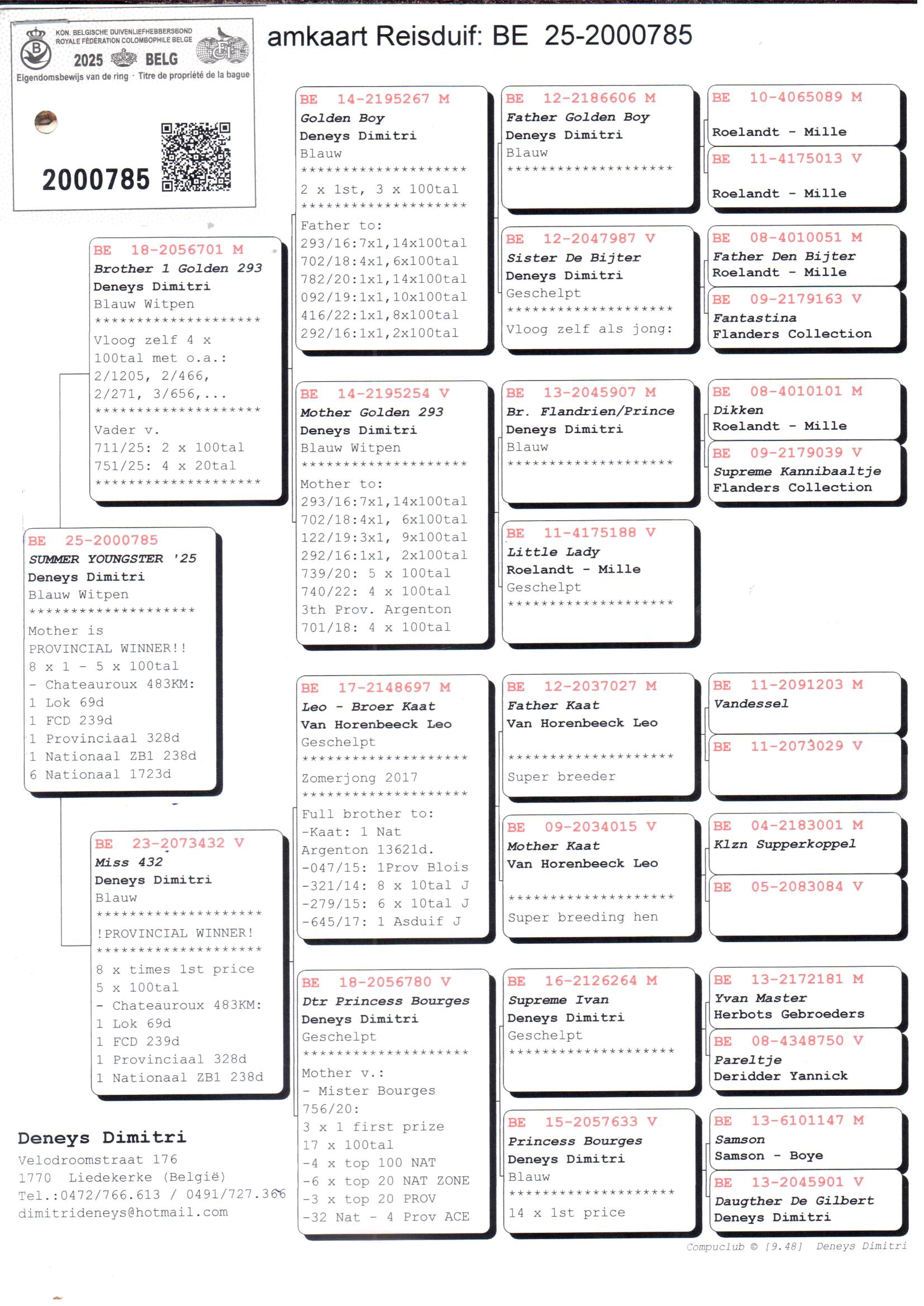 Le nom de Dimitri Deneys est depuis de nombreuses années indissociable des compétitions provinciales et nationales de demi-fond. Alors qu’autrefois l’accent était mis sur la vitesse et le petit demi-fond, le choix s’est aujourd’hui porté sur le demi-fond lourd. Et avec quel succès, notamment avec un 1er Zonal Bourges et le pigeon le plus rapide parmi 8.361 pigeons en 2021, ainsi que de nombreux autres résultats éclatants.