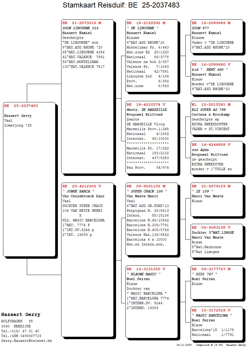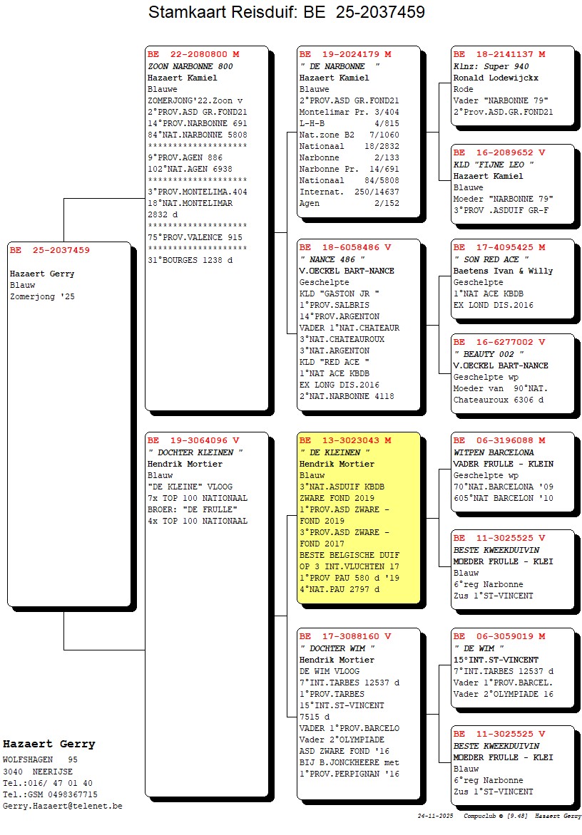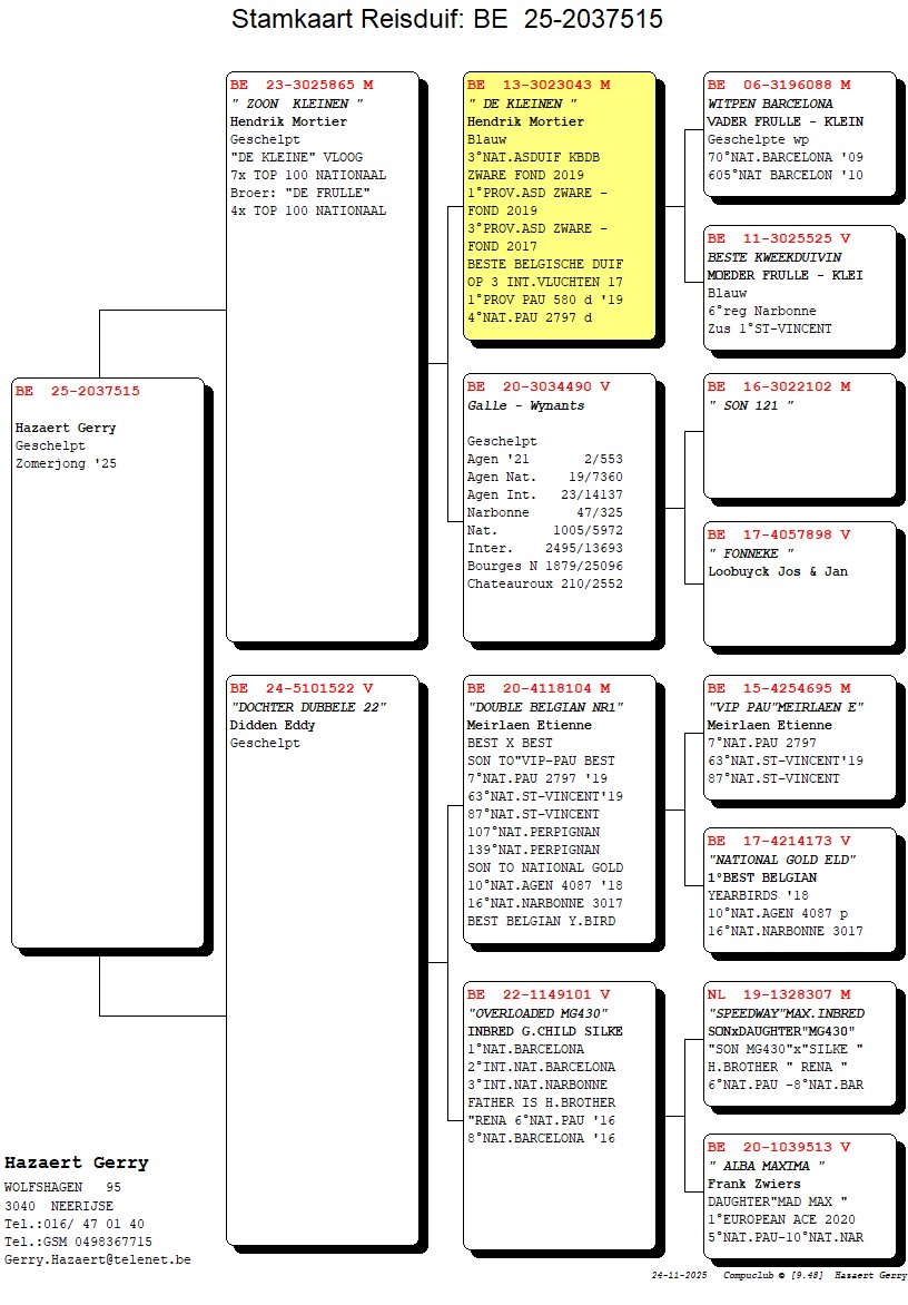 À l'origine, ils étaient mieux connus - voire très connus ! - sous le nom de duo père/fils Hazaert Kamiel & Gerry. Malgré leur situation géographique peu favorable, ils remportaient chaque année environ un titre provincial ou régional. Gerry préfère les courses de fond et de grand fond, mais ces pigeons peuvent également briller dans les courses plus courtes. Nous sommes donc fiers d'annoncer cette vente aux enchères, qui propose pas moins de 6 petits-enfants de « De Kleinen » de Hendrik Mortier, 1er Provincial & 3e As Pigeon Grand Fond 2019. Vous recherchez quelque chose qui se démarque nettement en termes de qualité ? Vous l'avez trouvé ici et maintenant !