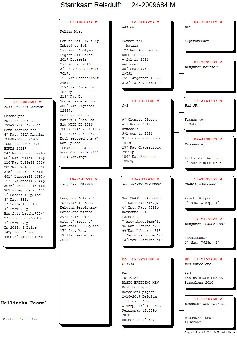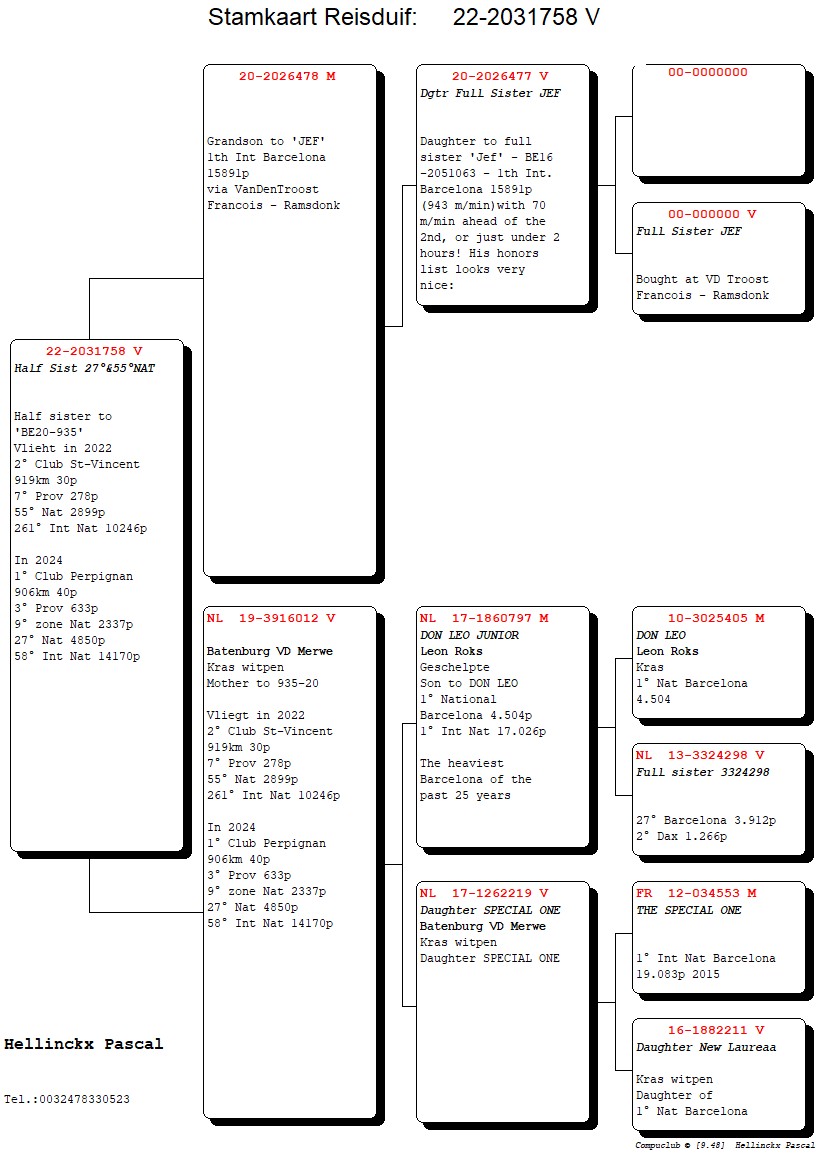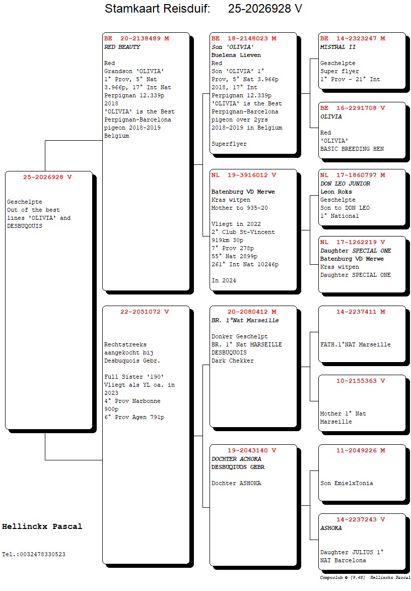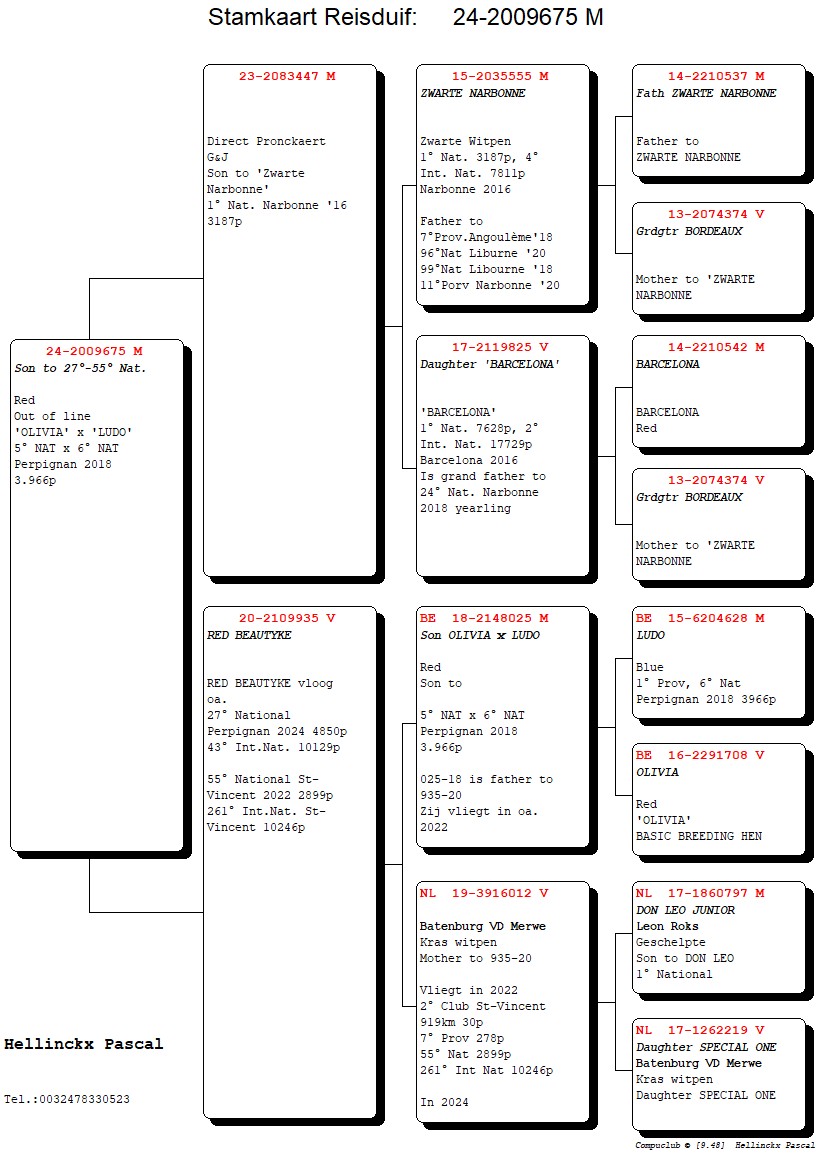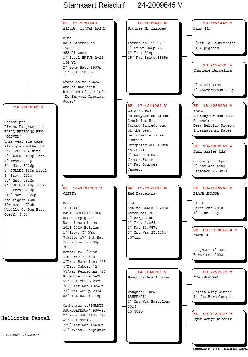 Avec « Olivia », lauréate provinciale à Perpignan, Pascal possède incontestablement un pigeon d'exception ! Son élevage est renforcé par des noms prestigieux tels que Gerard Schalkwijk, Pronckaert, Andy Quirynen, Devriendt, Van den Troost, De Smeyter-Restiaen, Germain D'hondt, Desbuquois en Batenburg-Van de Merwe. Par ailleurs, plusieurs colombophiles ont déjà renforcé leur effectif avec des pigeons de Pascal, et la lignée Hellinckx fait également ses débuts dans les concours de pigeons voyageurs ; à titre d'exemple, la mère du 1er As Pigeon du concours Moledo OLR 2025 est une femelle Hellinckx pure race, achetée chez Pitts l'an dernier ! Une vente aux enchères regorgeant de pigeons de fond de grande qualité, capables même de briller dans les concours préparatoires !