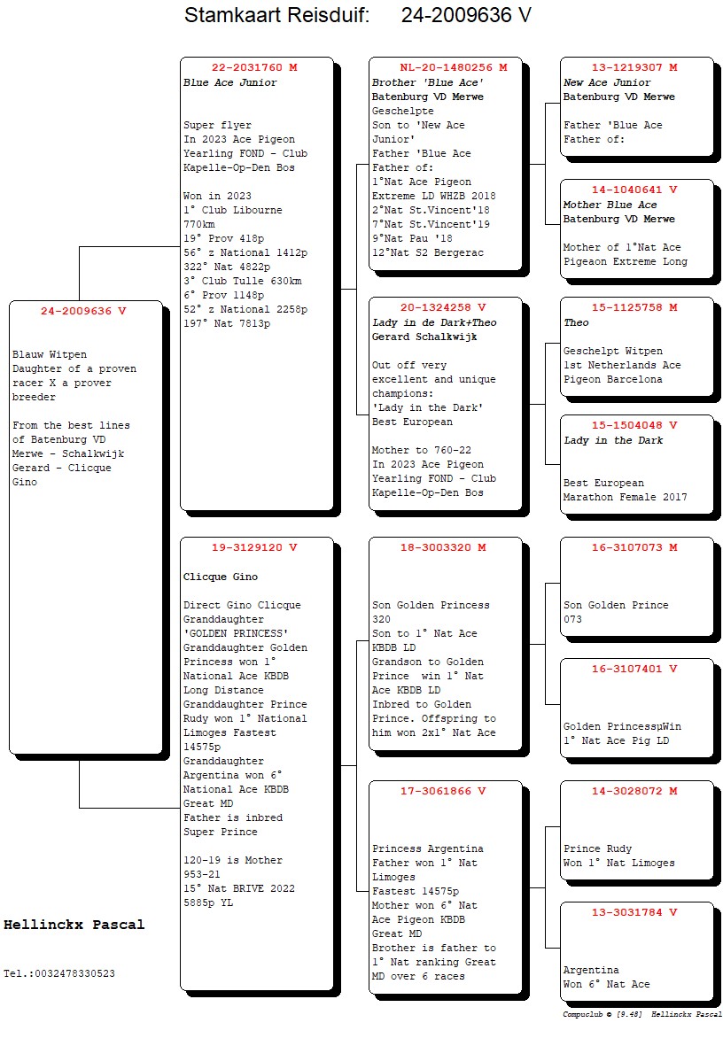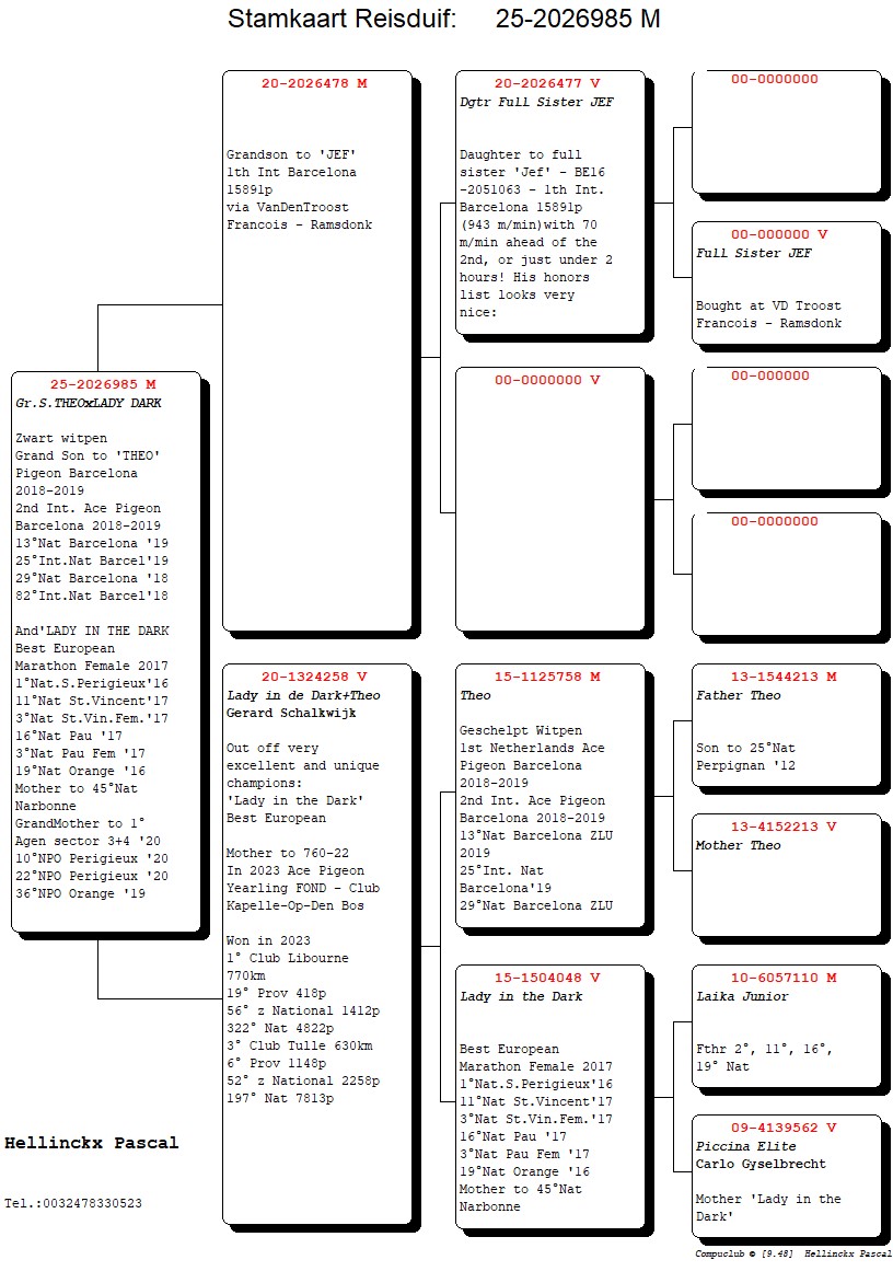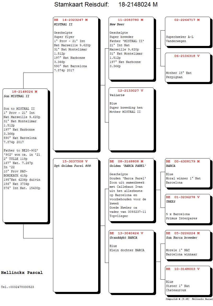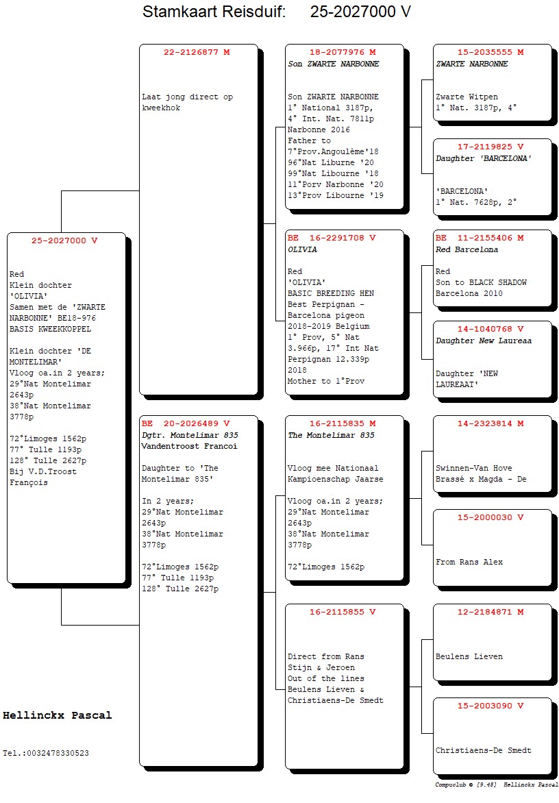 Avec « Olivia », lauréate provinciale à Perpignan, Pascal possède incontestablement un pigeon d'exception ! Son élevage est renforcé par des noms prestigieux tels que Gerard Schalkwijk, Pronckaert, Andy Quirynen, Devriendt, Van den Troost, De Smeyter-Restiaen, Germain D'hondt, Desbuquois en Batenburg-Van de Merwe. Par ailleurs, plusieurs colombophiles ont déjà renforcé leur effectif avec des pigeons de Pascal, et la lignée Hellinckx fait également ses débuts dans les concours de pigeons voyageurs ; à titre d'exemple, la mère du 1er As Pigeon du concours Moledo OLR 2025 est une femelle Hellinckx pure race, achetée chez Pitts l'an dernier ! Une vente aux enchères regorgeant de pigeons de fond de grande qualité, capables même de briller dans les concours préparatoires !