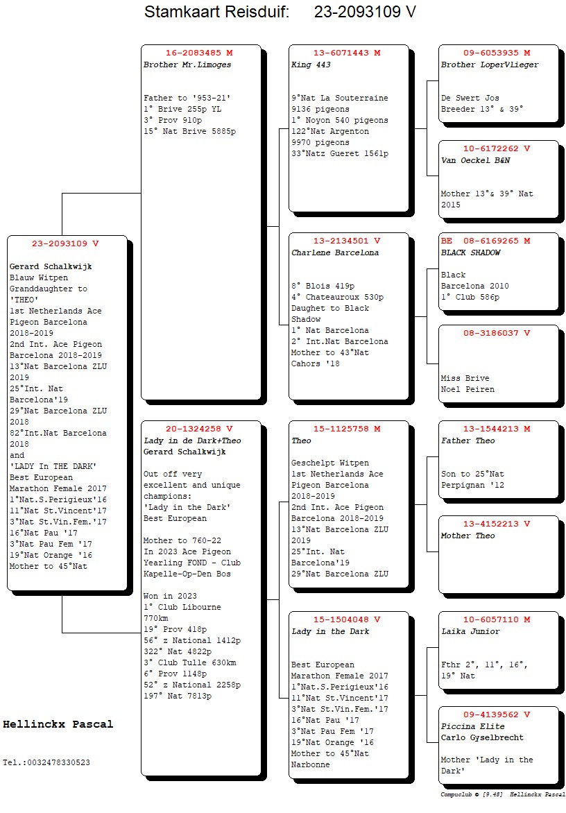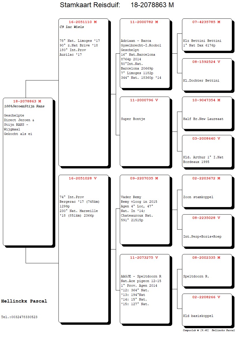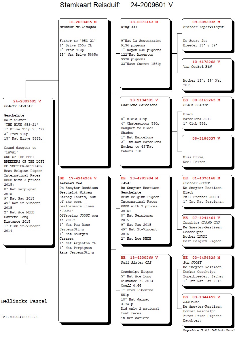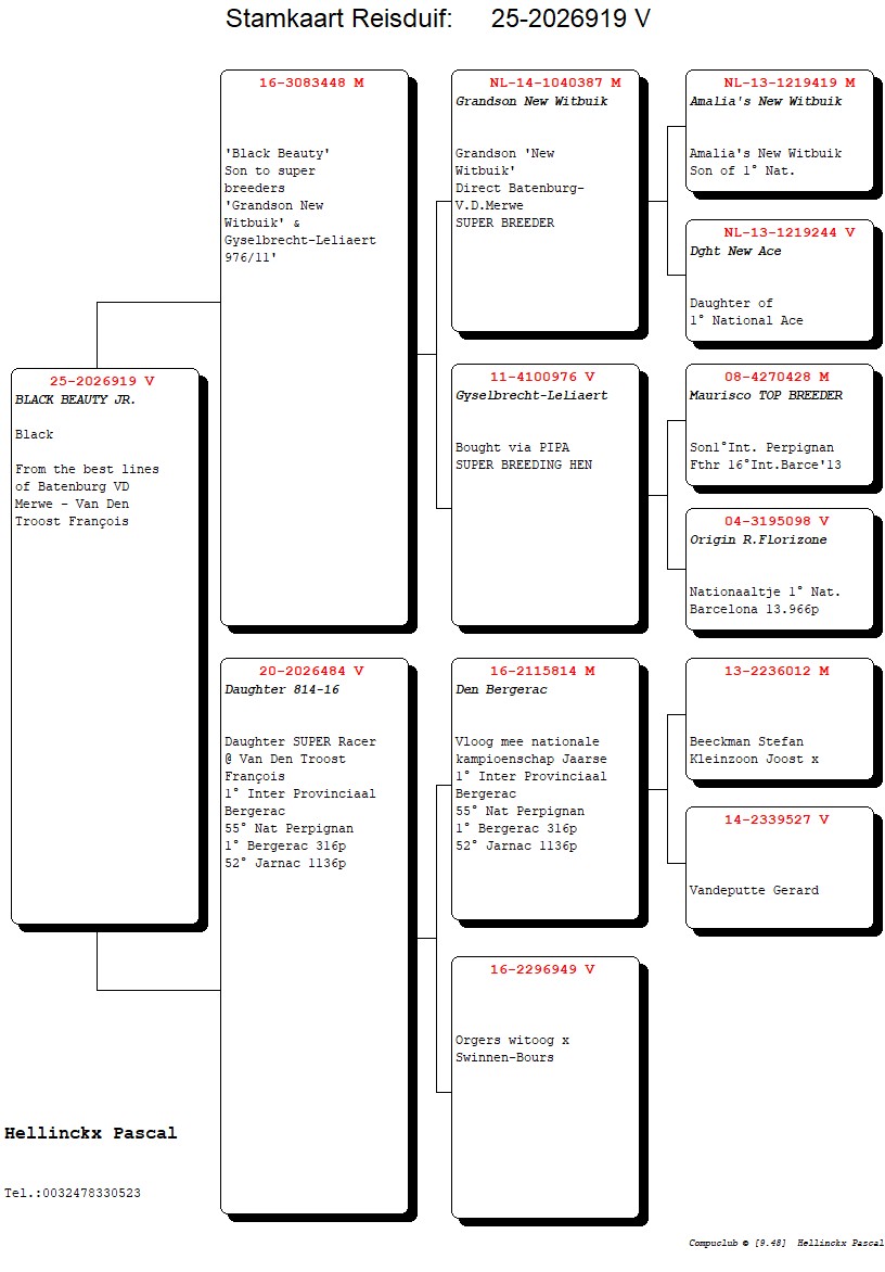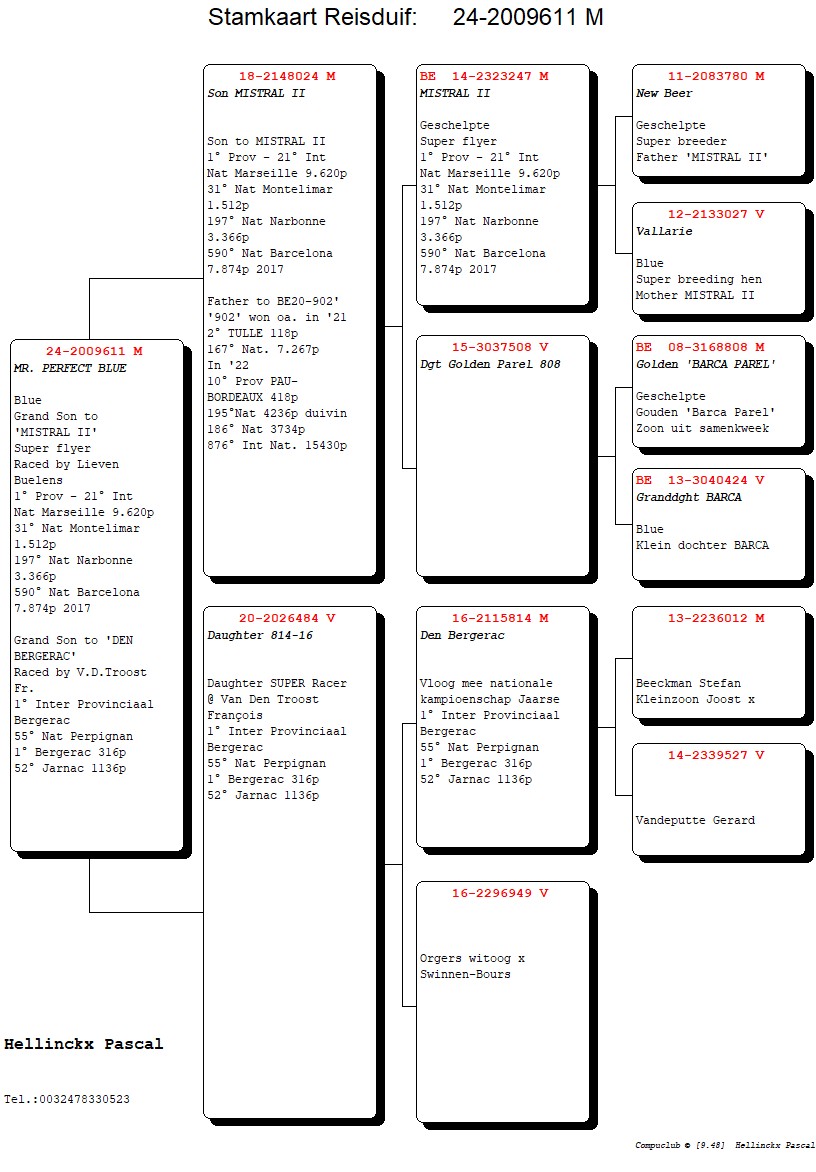 Avec « Olivia », lauréate provinciale à Perpignan, Pascal possède incontestablement un pigeon d'exception ! Son élevage est renforcé par des noms prestigieux tels que Gerard Schalkwijk, Pronckaert, Andy Quirynen, Devriendt, Van den Troost, De Smeyter-Restiaen, Germain D'hondt, Desbuquois en Batenburg-Van de Merwe. Par ailleurs, plusieurs colombophiles ont déjà renforcé leur effectif avec des pigeons de Pascal, et la lignée Hellinckx fait également ses débuts dans les concours de pigeons voyageurs ; à titre d'exemple, la mère du 1er As Pigeon du concours Moledo OLR 2025 est une femelle Hellinckx pure race, achetée chez Pitts l'an dernier ! Une vente aux enchères regorgeant de pigeons de fond de grande qualité, capables même de briller dans les concours préparatoires !