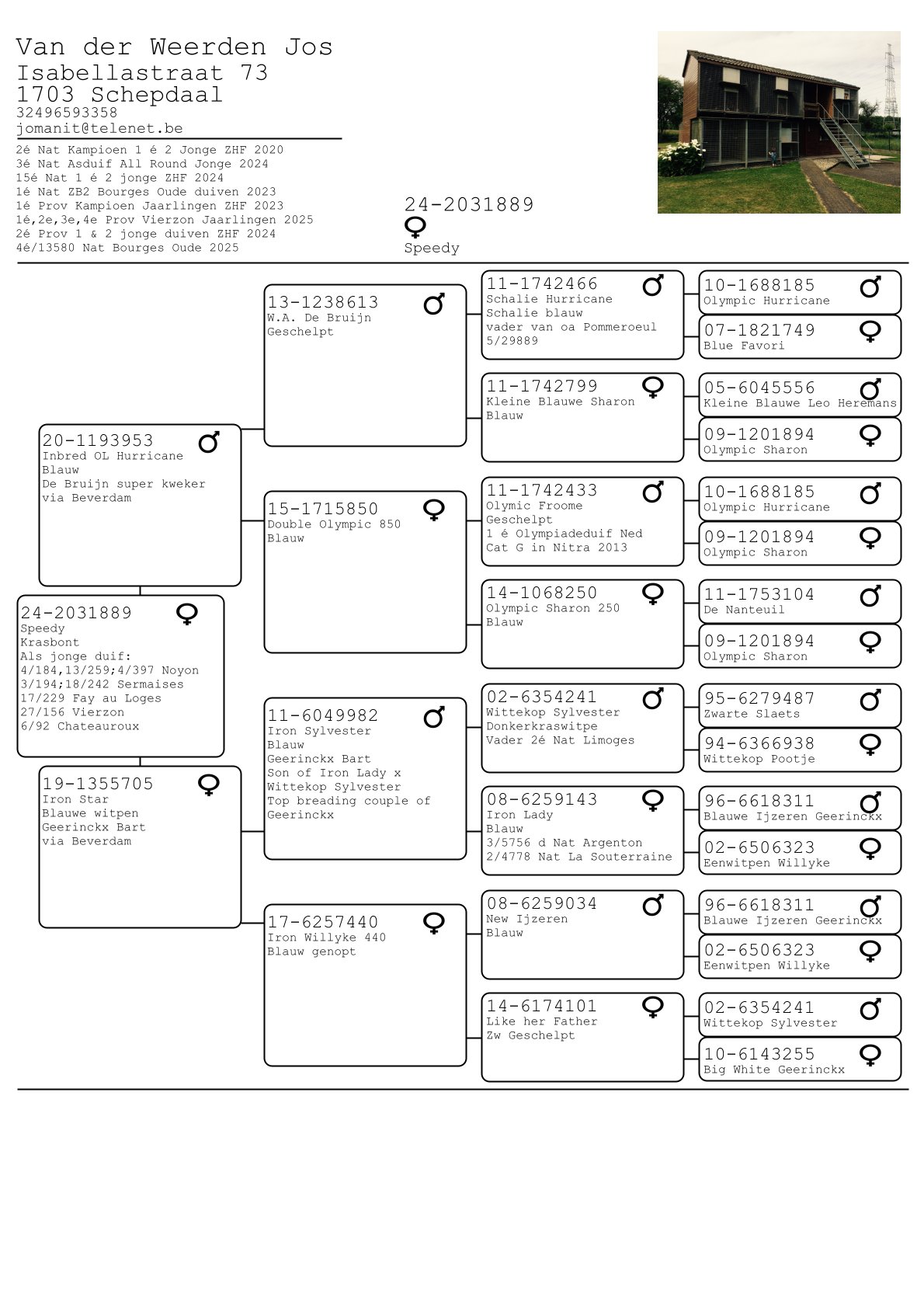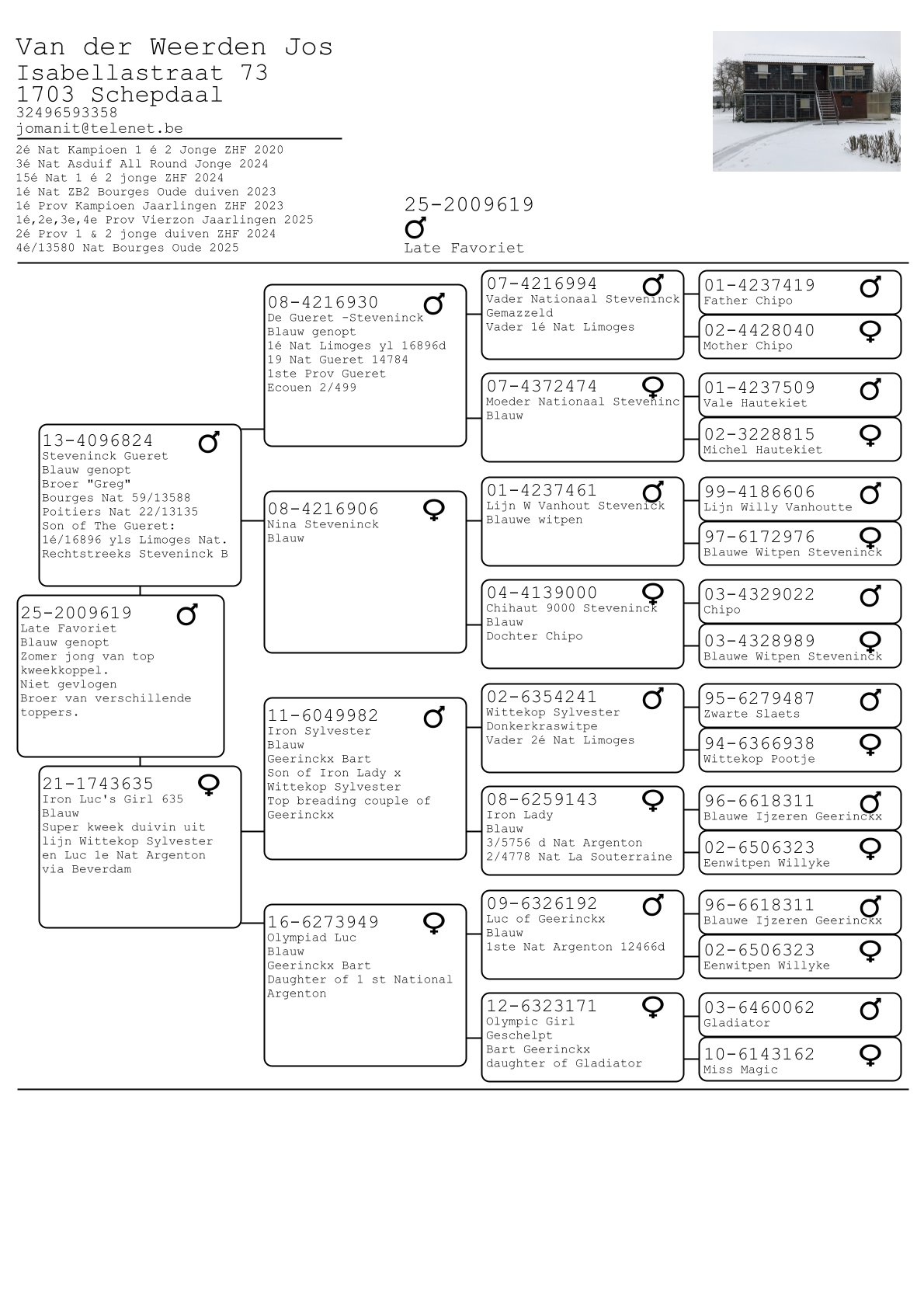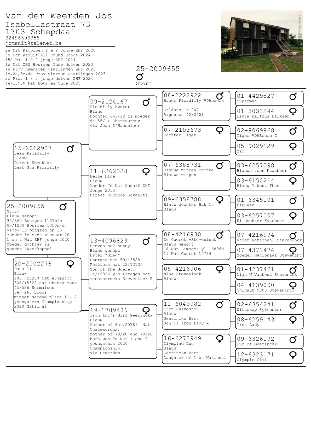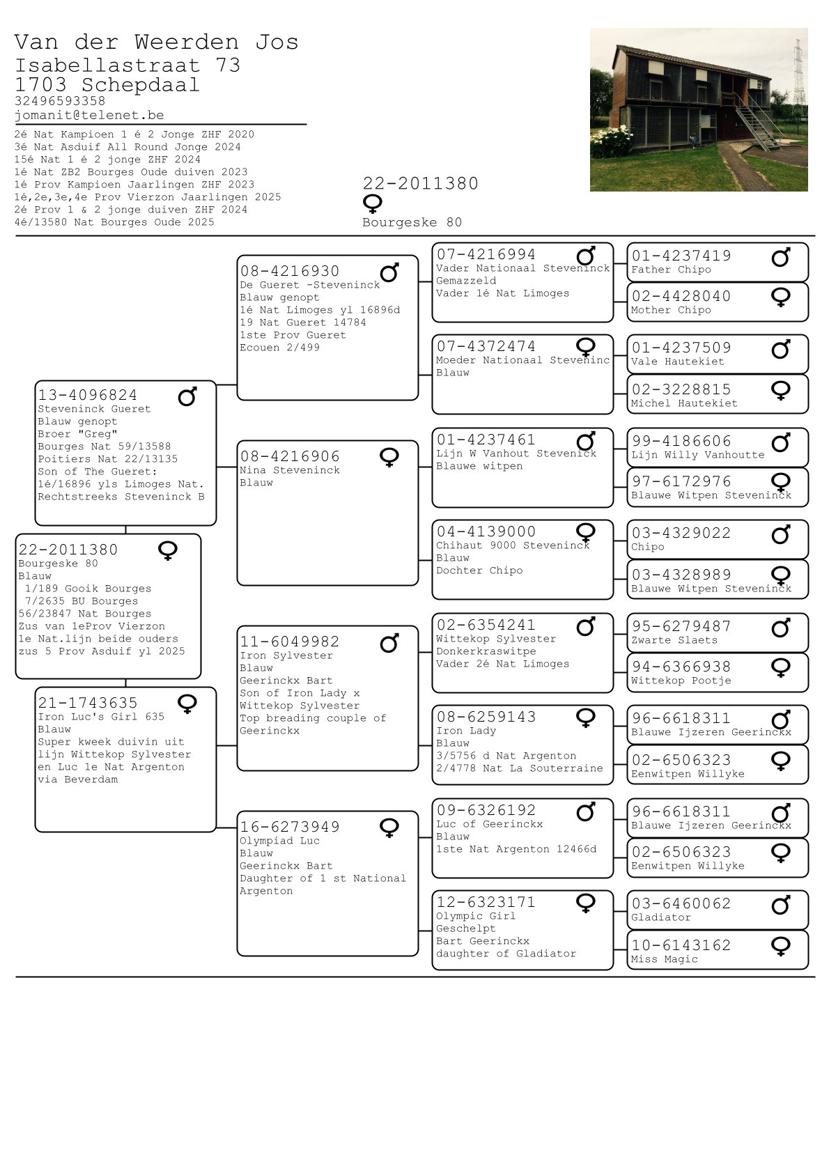 Depuis 2020, Jos participe exclusivement à des concours de femelles âgées et d'un an. Un choix délibéré de la part de Jos, qui refuse d'être esclave de sa passion et sélectionne ses pigeons avec une rigueur absolue. Chez les Van der Weerden, point de vantardise ni de grands gestes, mais la colombophilie à l'état pur, où seuls les meilleurs sont retenus. Depuis des années, il développe une race de pigeons qui allie vitesse, intelligence et caractère. Il a obtenu d'excellents résultats avec deux fils du « De Gueret » de Benny Steveninck, croisés avec la lignée Geerinckx, avec des vainqueurs nationaux dans les deux lignées ! De plus, le colombier d'élevage est principalement composé de pigeons issus des lignées de Willem De Bruijn, Tom Van Gaver, Gevaert-Lannoo et de son frère Jan Van der Weerden, un élevage de référence sur lequel Jos s'appuie depuis des années. La première vente aux enchères de ce colombier d'exception chez Pitts est un événement à ne pas manquer ! Amateurs de pigeons, ne ratez pas cette occasion !
