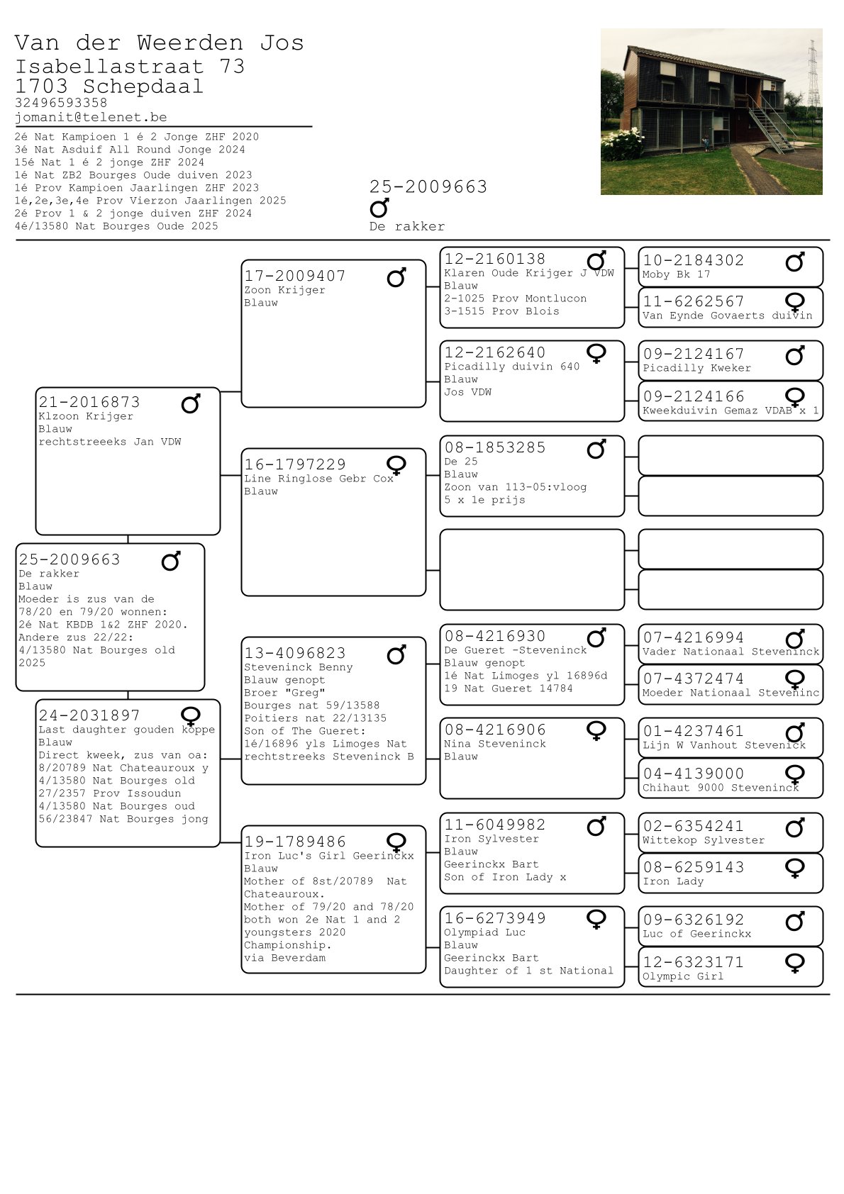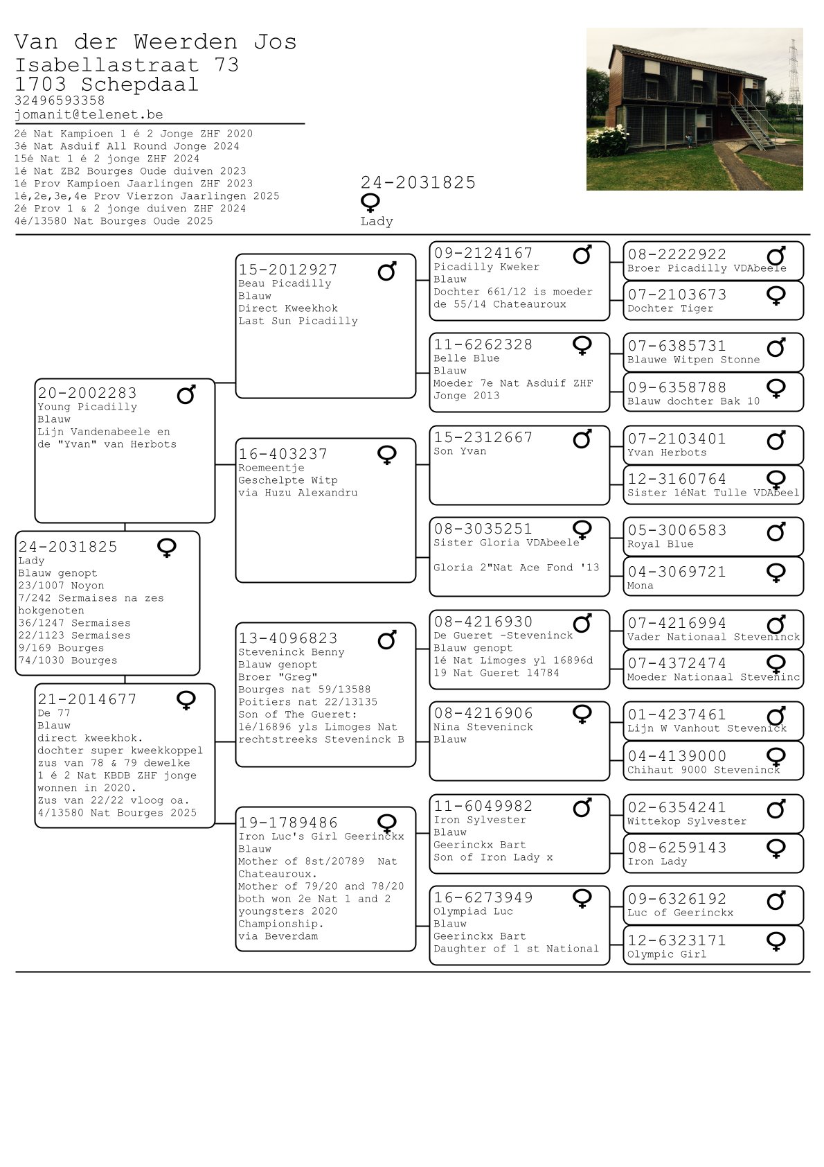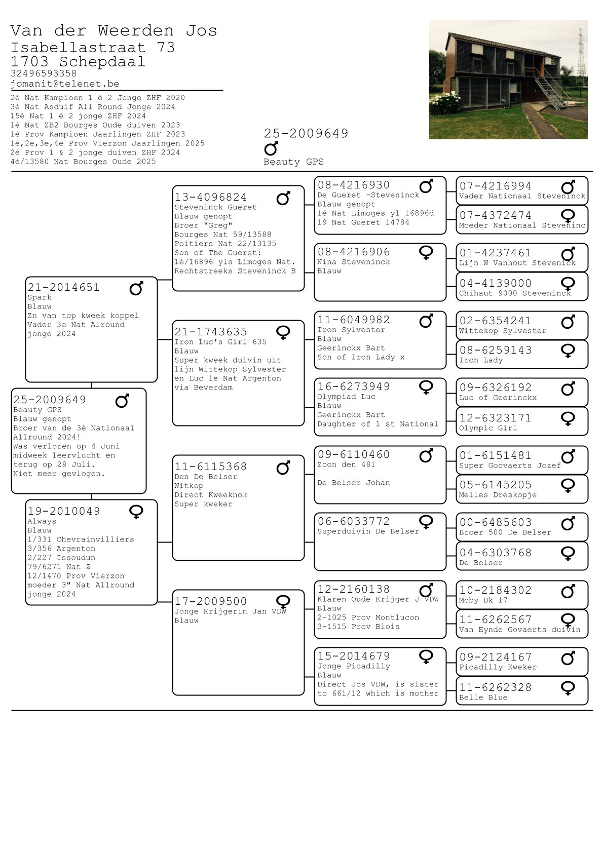 Depuis 2020, Jos participe exclusivement à des concours de femelles âgées et d'un an. Un choix délibéré de la part de Jos, qui refuse d'être esclave de sa passion et sélectionne ses pigeons avec une rigueur absolue. Chez les Van der Weerden, point de vantardise ni de grands gestes, mais la colombophilie à l'état pur, où seuls les meilleurs sont retenus. Depuis des années, il développe une race de pigeons qui allie vitesse, intelligence et caractère. Il a obtenu d'excellents résultats avec deux fils du « De Gueret » de Benny Steveninck, croisés avec la lignée Geerinckx, avec des vainqueurs nationaux dans les deux lignées ! De plus, le colombier d'élevage est principalement composé de pigeons issus des lignées de Willem De Bruijn, Tom Van Gaver, Gevaert-Lannoo et de son frère Jan Van der Weerden, un élevage de référence sur lequel Jos s'appuie depuis des années. La première vente aux enchères de ce colombier d'exception chez Pitts est un événement à ne pas manquer ! Amateurs de pigeons, ne ratez pas cette occasion !