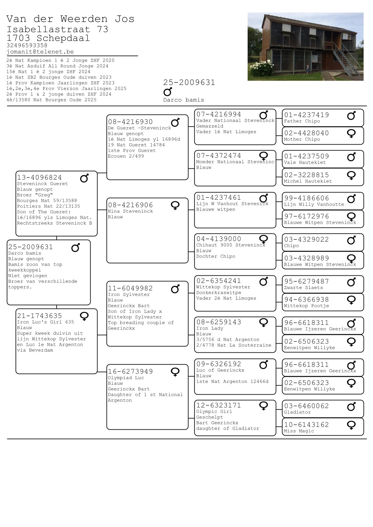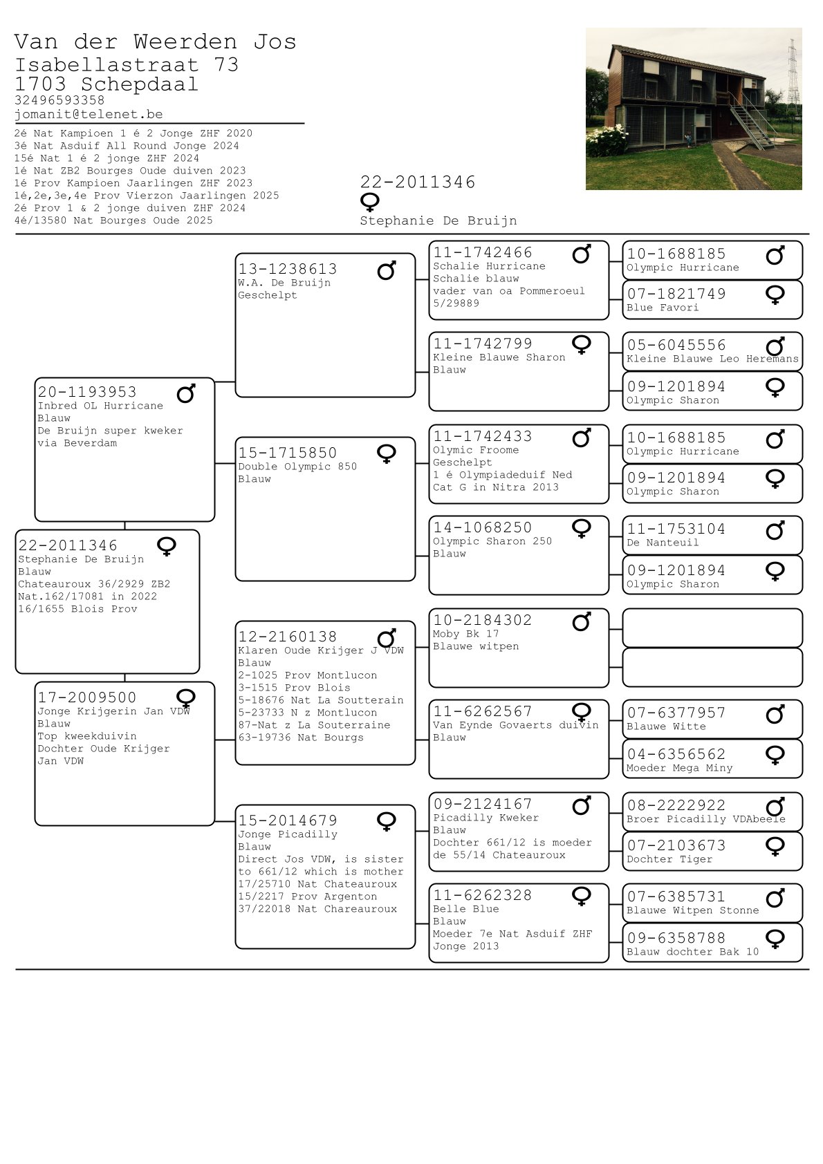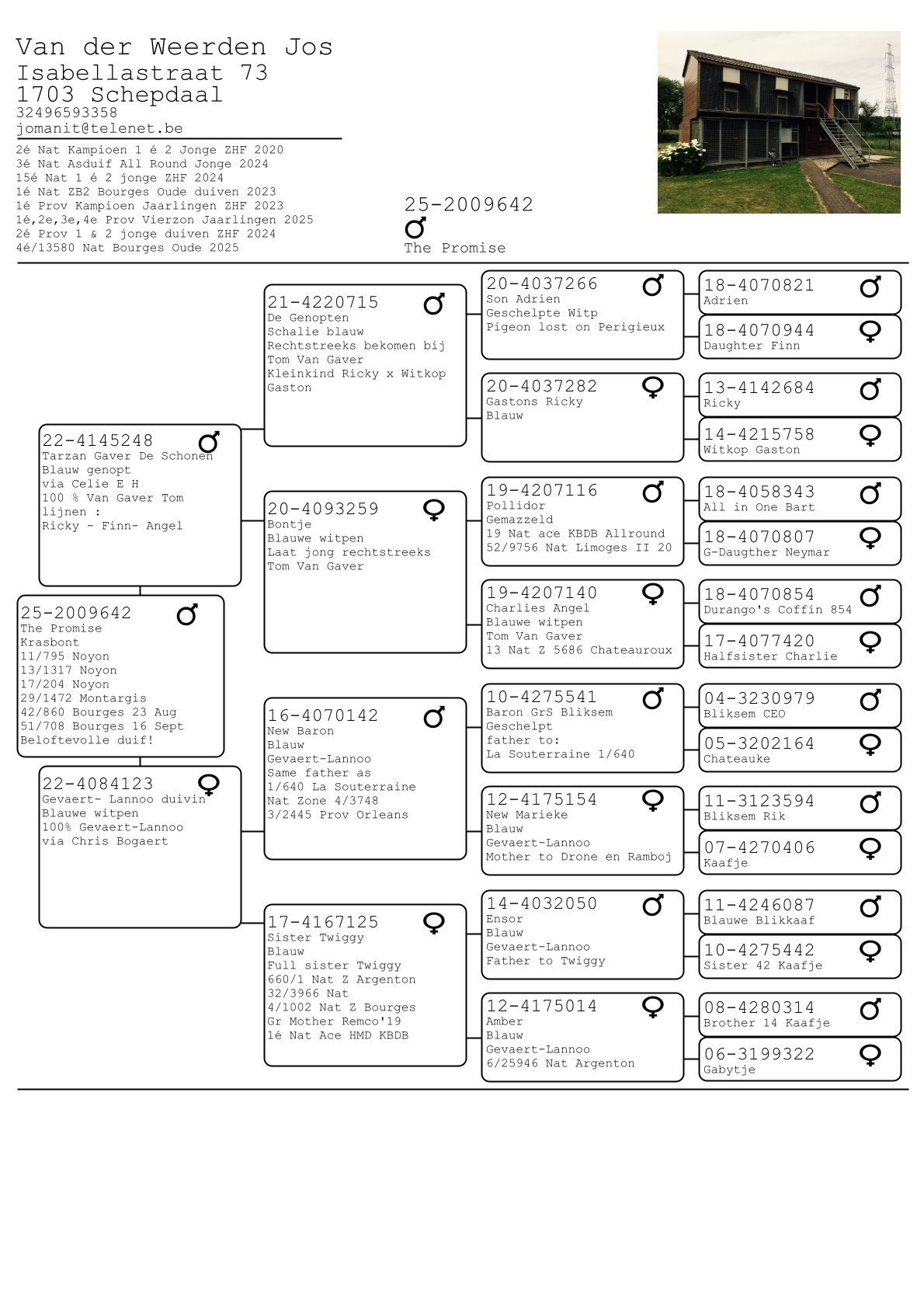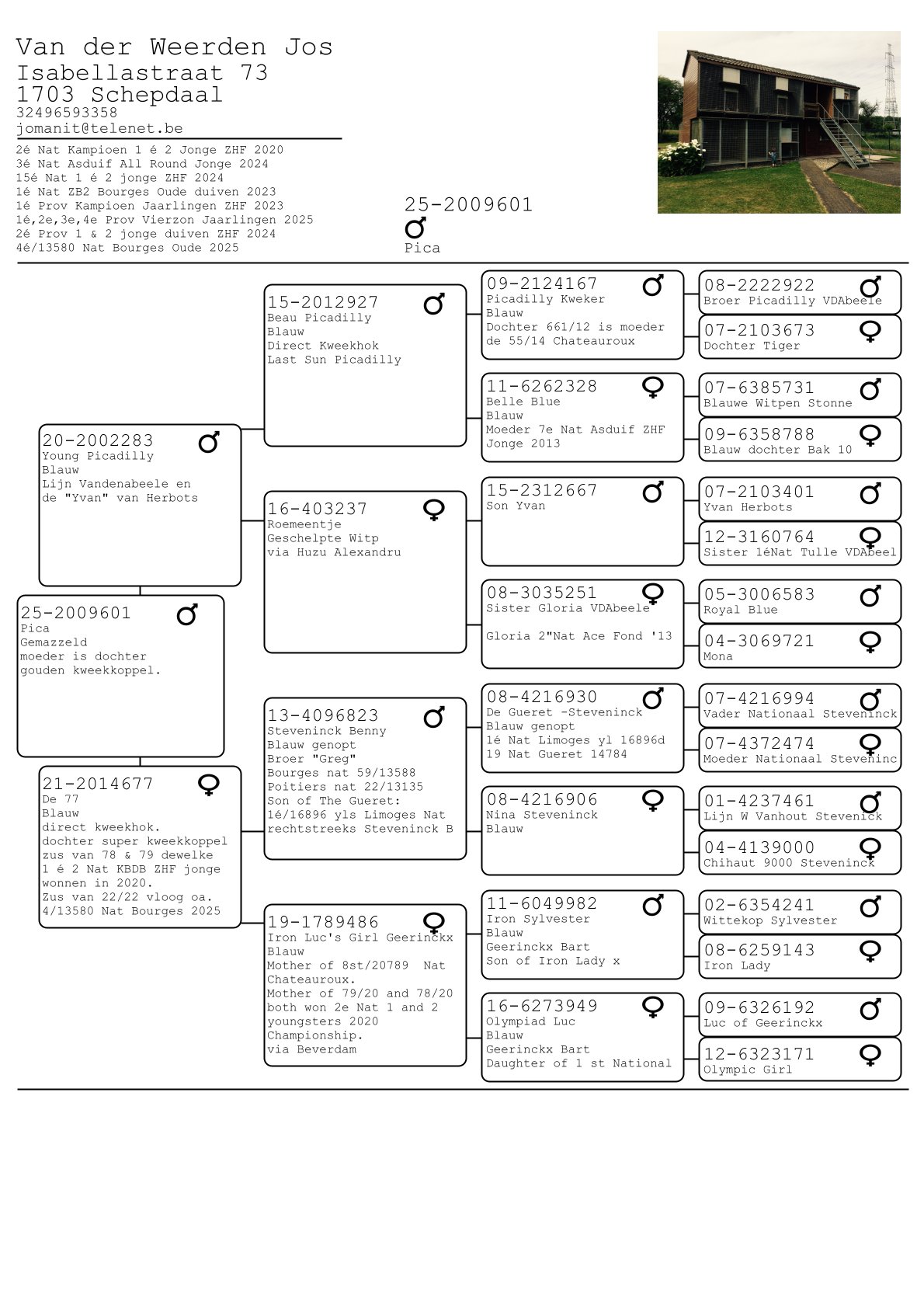Depuis 2020, Jos participe exclusivement à des concours de femelles âgées et d'un an. Un choix délibéré de la part de Jos, qui refuse d'être esclave de sa passion et sélectionne ses pigeons avec une rigueur absolue. Chez les Van der Weerden, point de vantardise ni de grands gestes, mais la colombophilie à l'état pur, où seuls les meilleurs sont retenus. Depuis des années, il développe une race de pigeons qui allie vitesse, intelligence et caractère. Il a obtenu d'excellents résultats avec deux fils du « De Gueret » de Benny Steveninck, croisés avec la lignée Geerinckx, avec des vainqueurs nationaux dans les deux lignées ! De plus, le colombier d'élevage est principalement composé de pigeons issus des lignées de Willem De Bruijn, Tom Van Gaver, Gevaert-Lannoo et de son frère Jan Van der Weerden, un élevage de référence sur lequel Jos s'appuie depuis des années. La première vente aux enchères de ce colombier d'exception chez Pitts est un événement à ne pas manquer ! Amateurs de pigeons, ne ratez pas cette occasion !