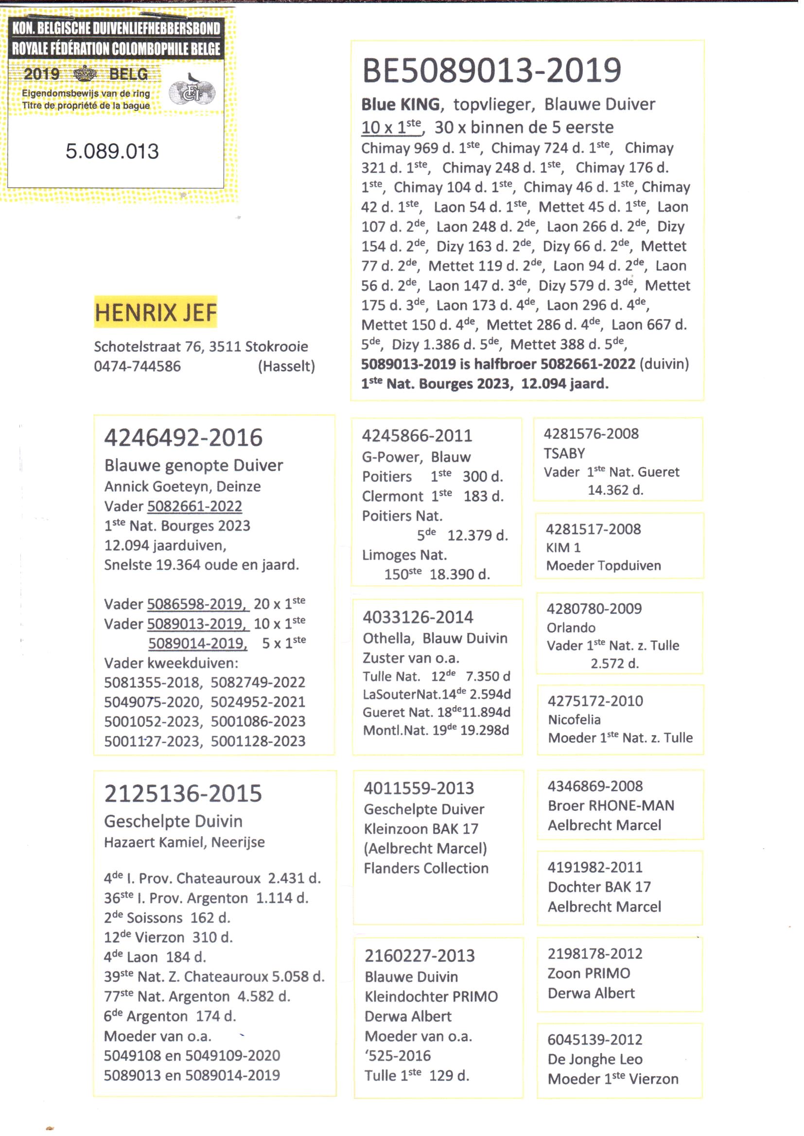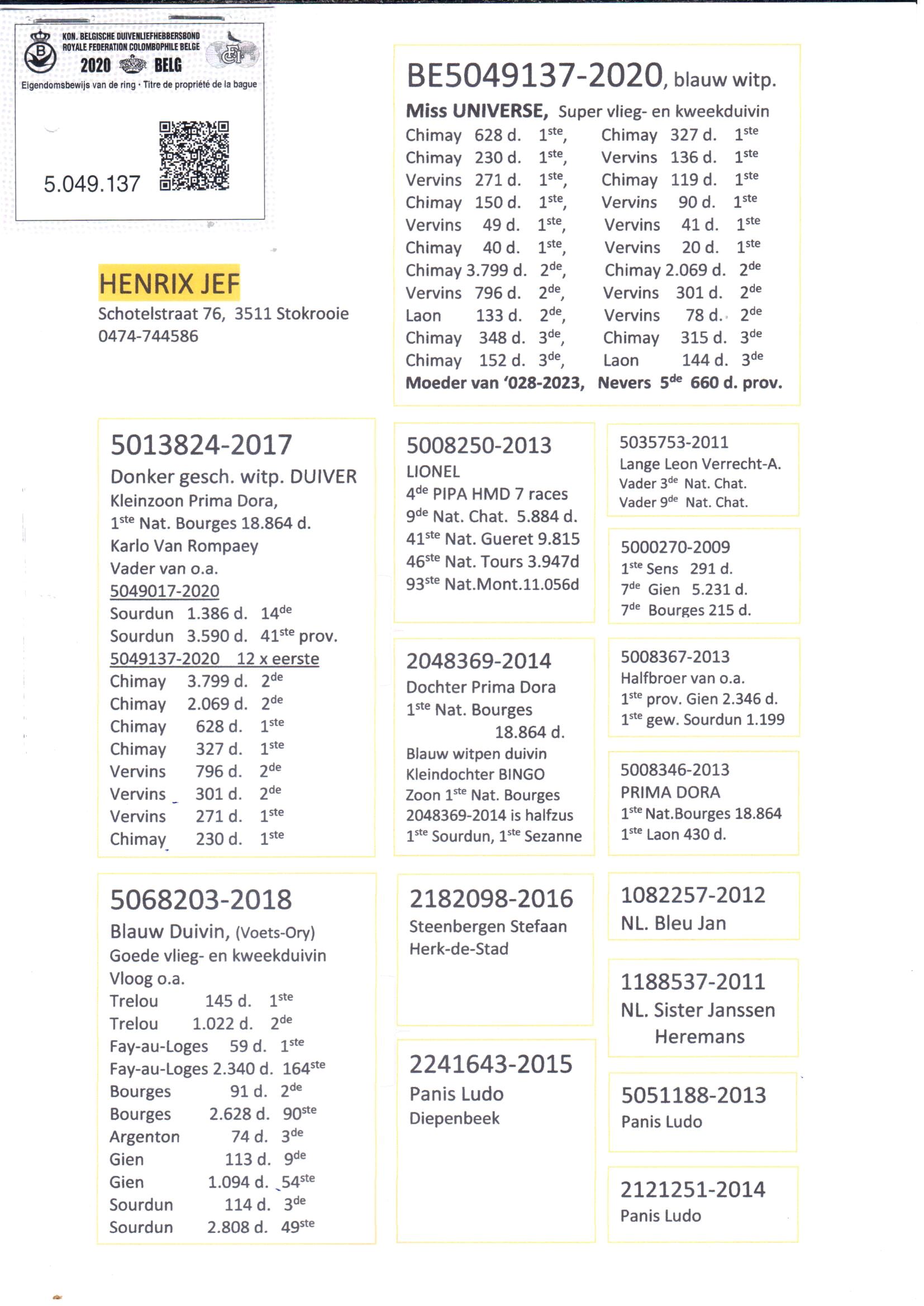 Chaque année, Jozef Henrix remporte environ 40 à 50 premiers prix, un chiffre que peu de gens parviennent à égaler. En 2025, ce chiffre a légèrement diminué, mais avec 37 premiers prix locaux, dont 4 dans la région du Midden-Limburg, nous n'allons pas nous plaindre, n'est-ce pas ? Malgré la « retraite » des meilleurs pigeons demi-fond à la fin de 2024, Jef a encore été sacré cette année 1er Champion Demi-Fond Vieux, 2e chez les jeunes pigeons et 2e Champion Général Petit Demi-Fond. Dans cette dernière discipline, il a également ajouté les 2e et 3e As-pigeons à son palmarès. Au cours des deux dernières années, plusieurs pigeons de demi-fond et de fond ont été achetés dans le but de participer davantage à ces concours et d'accorder moins d'importance aux concours de vitesse. C'est pourquoi certains des meilleurs pigeons de vitesse âgés sont vendus chaque hiver, en partie par crainte des nombreux rapaces qui rôdent dans les bois de Stokrooie. À partir de novembre, aucun pigeon n'est plus lâché pour cette raison. Dans cette vente aux enchères, deux champions absolus qui ont prouvé noir sur blanc ce dont ils sont capables, avec à eux deux pas moins de 22 premiers prix!
