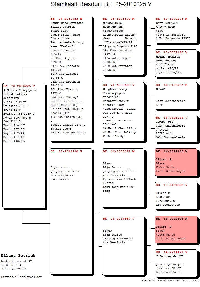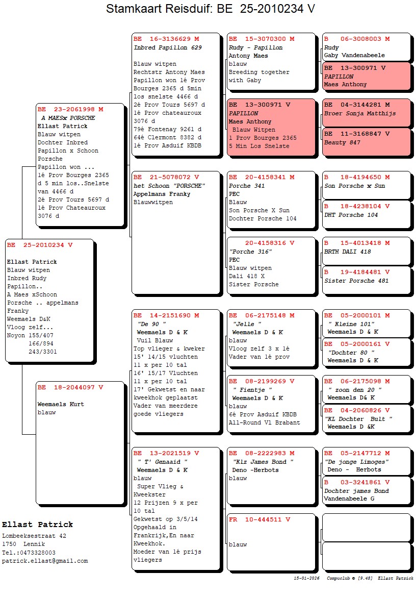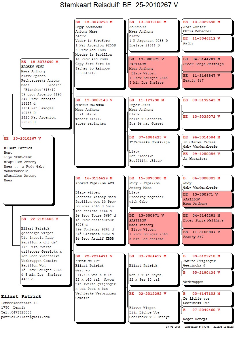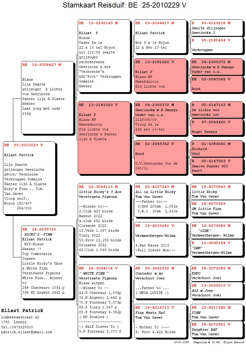 Comes from inbred “Rudy” – “Papillon” x Daughter “De 17” from “Black Grey-Eyed” Geerinckx x granddaughter “Poot” x “Vechterke” Gommaire Verbruggen