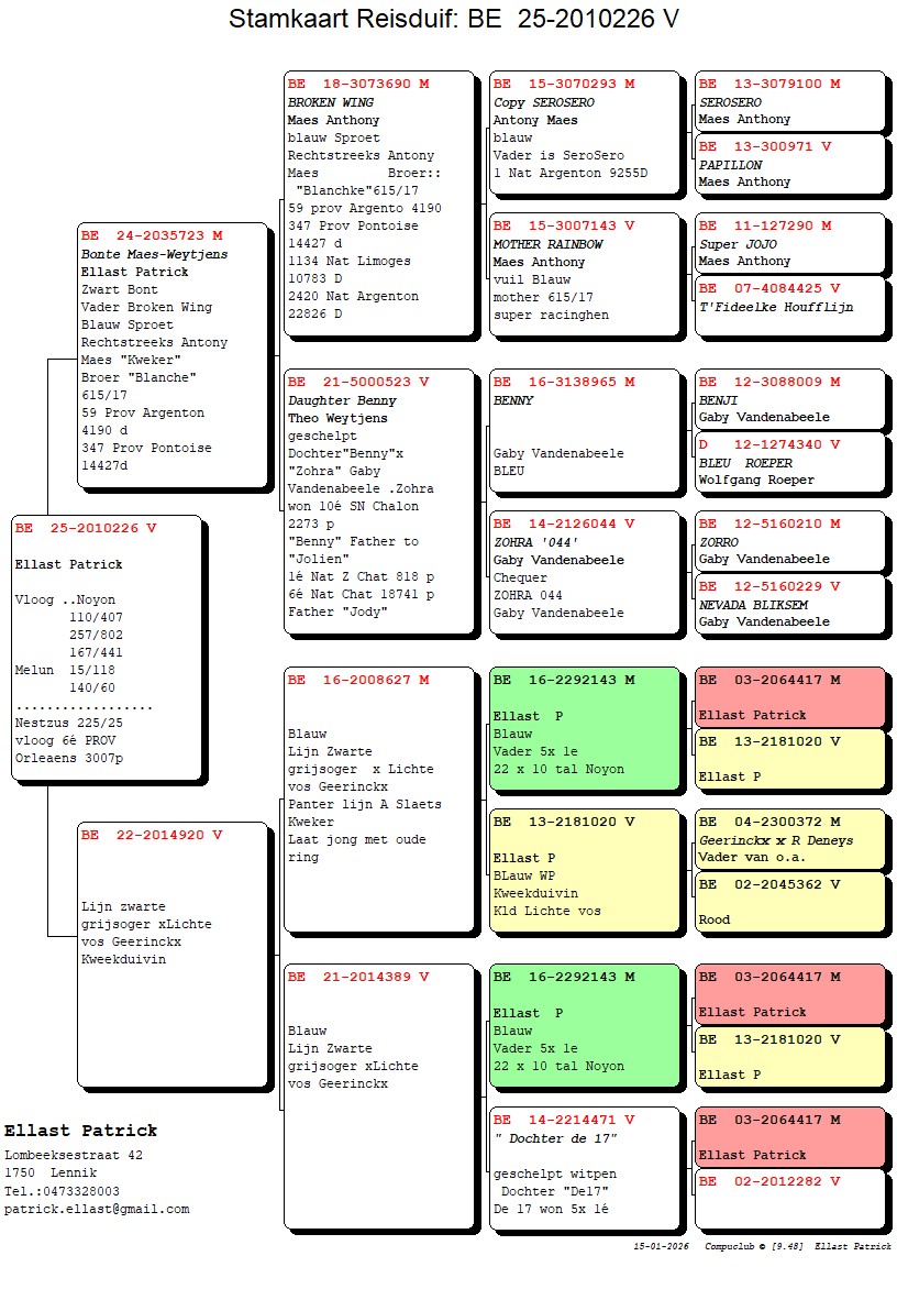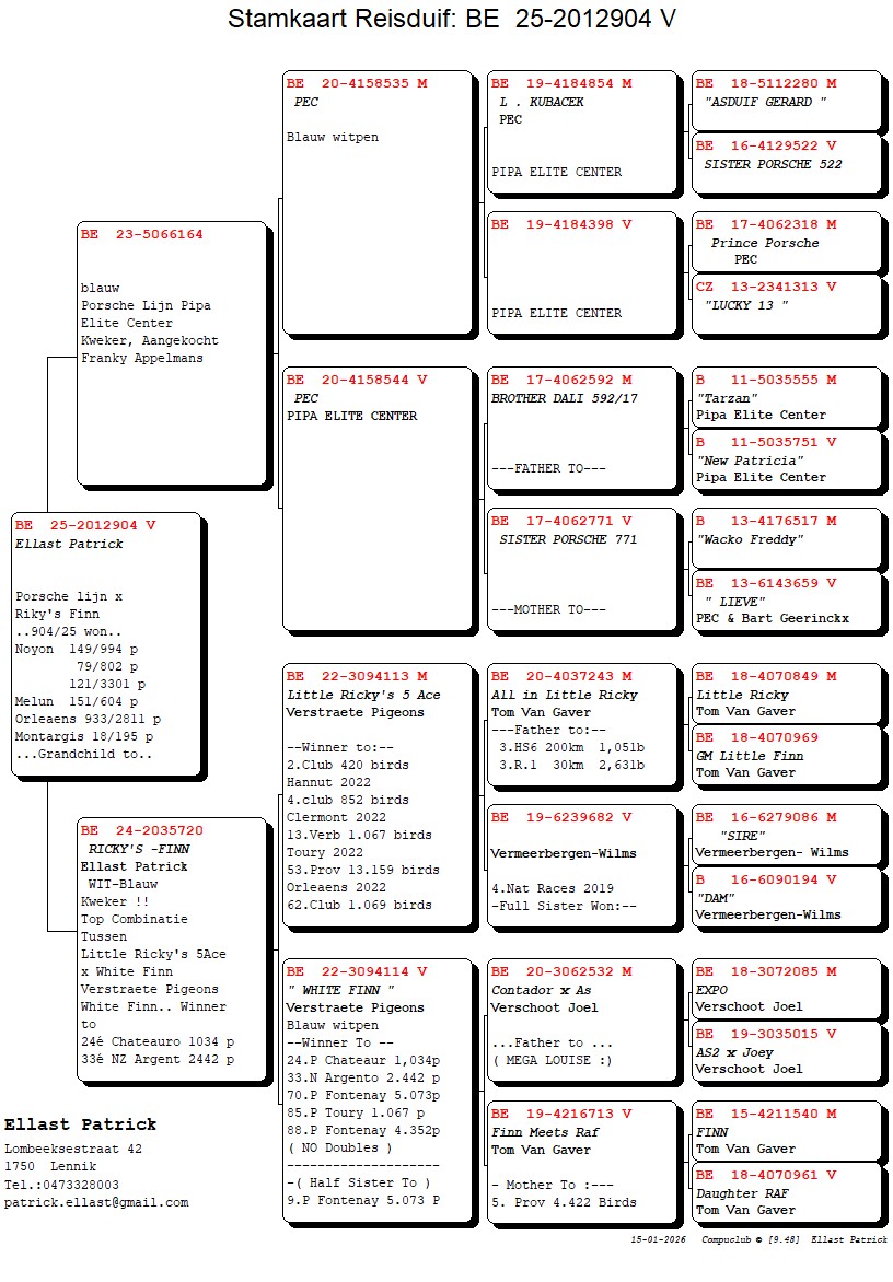 Après de nombreuses années d'excellentes performances en tant que spécialiste de Noyon, Patrick a temporairement raccroché son tablier et n'a pratiquement plus joué pendant plusieurs années. Mais comme pour la plupart des amateurs, le microbe des pigeons est invincible : il s'est remis à la compétition en choisissant le demi-fond (lourd). Les pigeons de vitesse ont été sélectionnés selon la tradition, mais de nouveaux investissements s'imposaient. Il a notamment frappé à la porte de Luc Luyckx, Franky Appelmans (PEC - lignée Porsche) et aussi du meilleur d'Anthony Maes. Il a obtenu une fille de son ancêtre « Bonten Provinciaal » et Patrick s'est également mis en quête du sang gagnant de « Papillon » et « Sero Sero ». Plus récemment, Brinkman et Verstraete ont également apporté leur renfort grâce au phénomène Tom Van Gaver, plus précisément issu des lignées « Finn », « Ricky » et « Charlie ». Le croisement avec les races susmentionnées a donné des résultats étonnants, avec notamment les 1re, 2e, 3e, 6e... places au Provincial Orléans et bien d'autres encore. 11 pièces sont prêtes à changer de propriétaire, tentez votre chance!