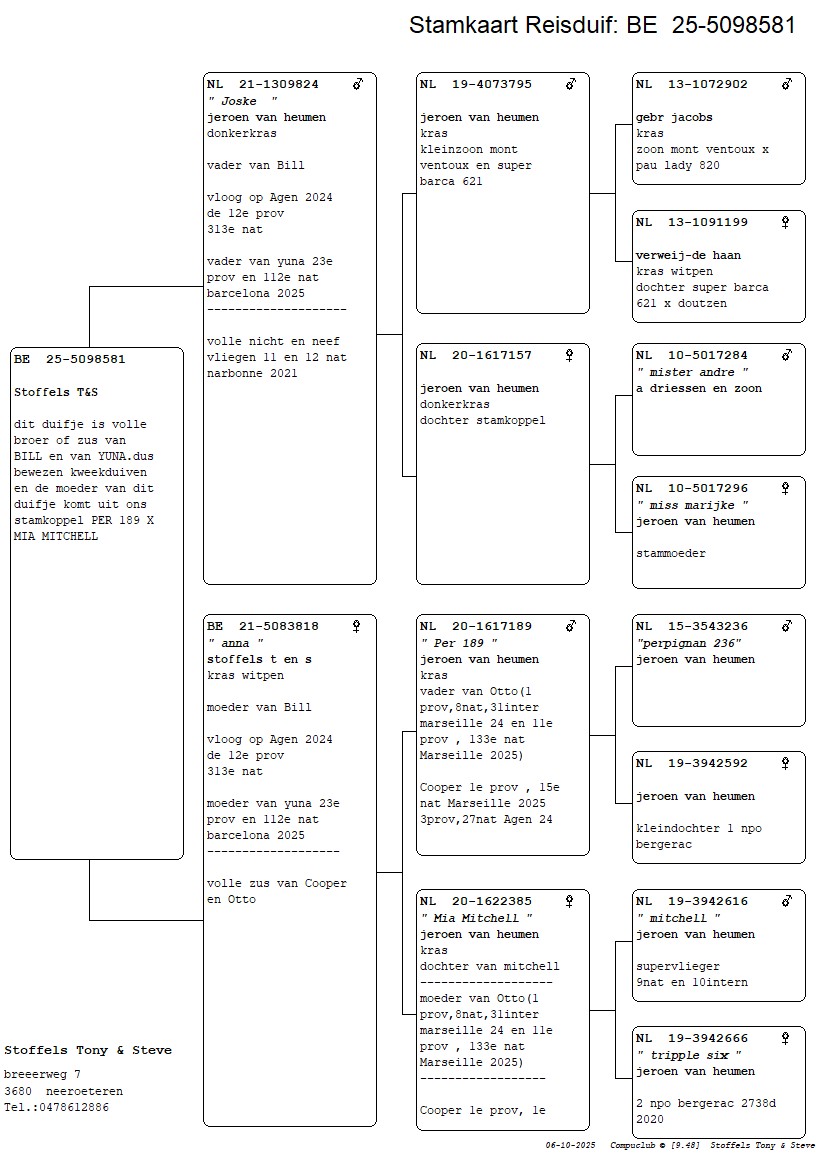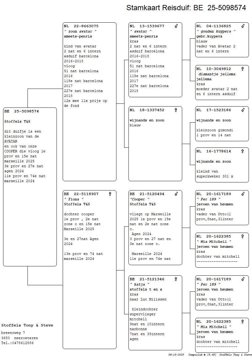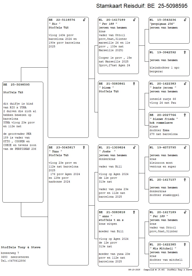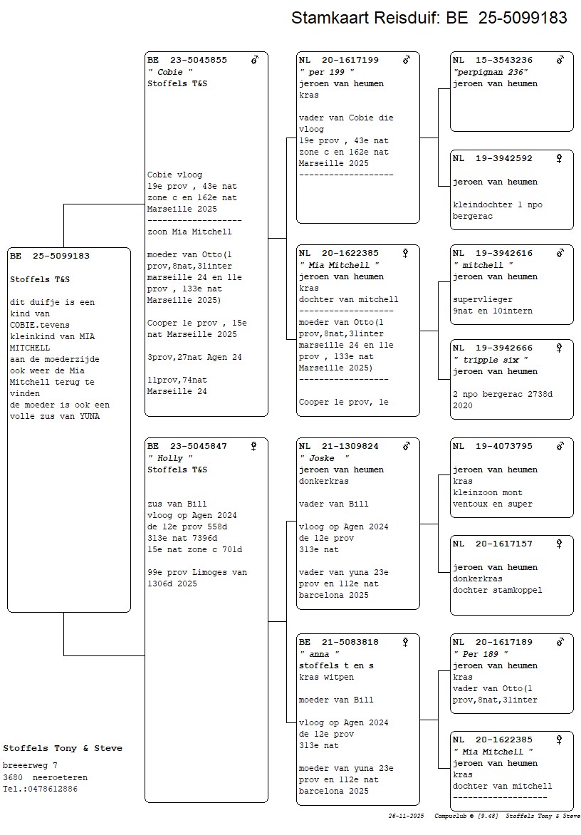 Is full brother/sister of “Bill” and “Yuna”, proven breeding pigeons, and the mother comes from the foundation pair “Per 189” x “Mia Mitchell”