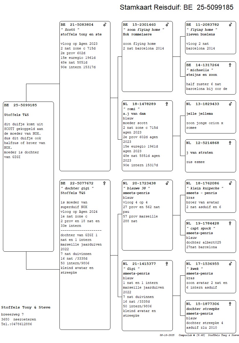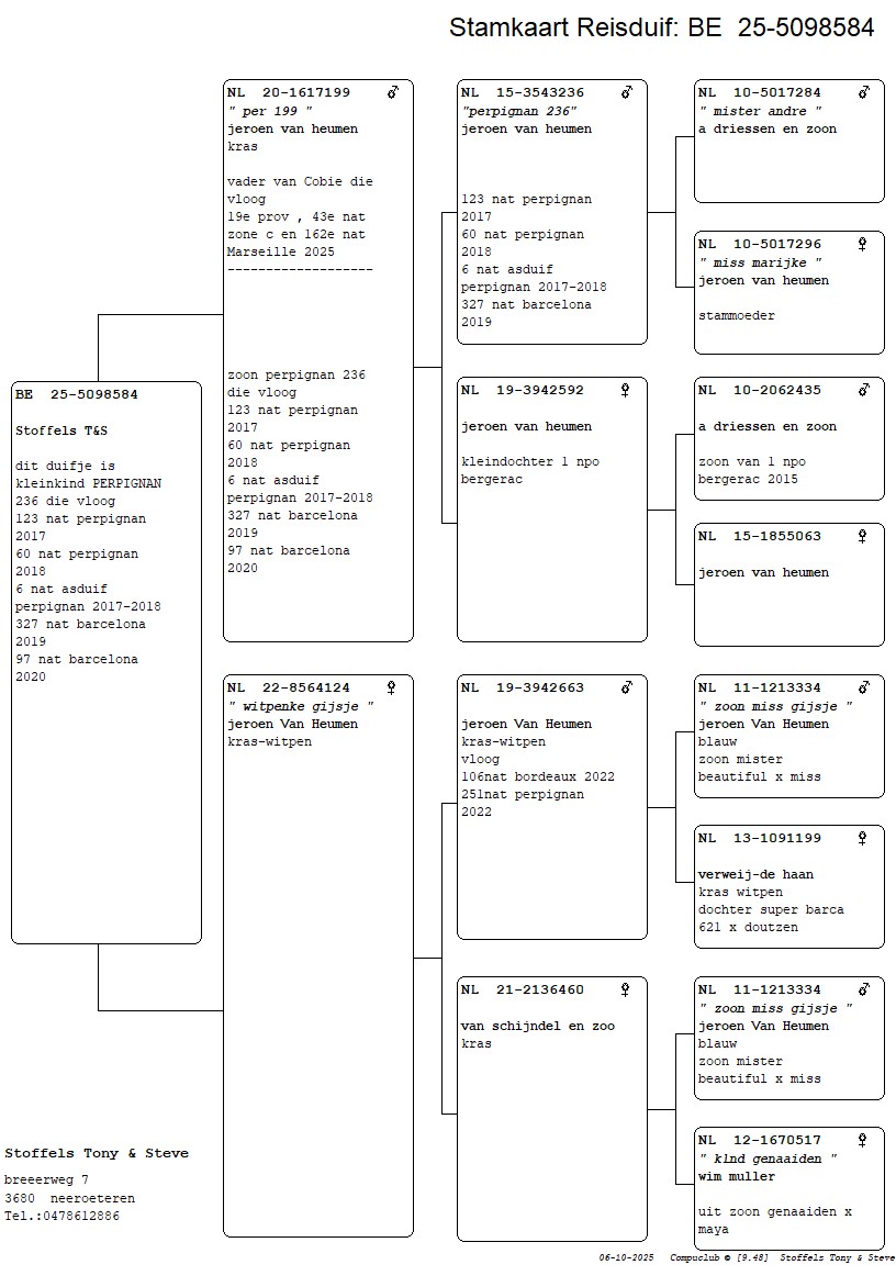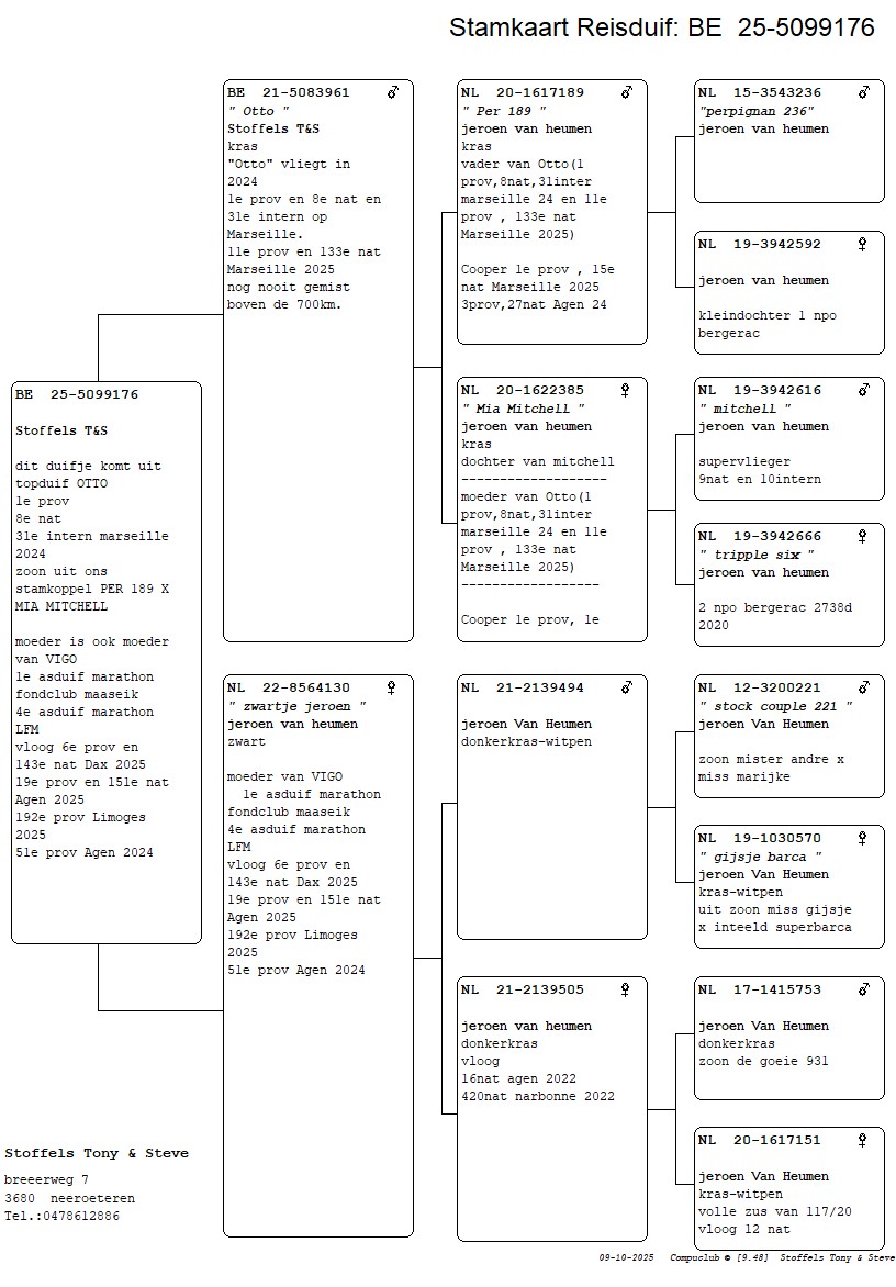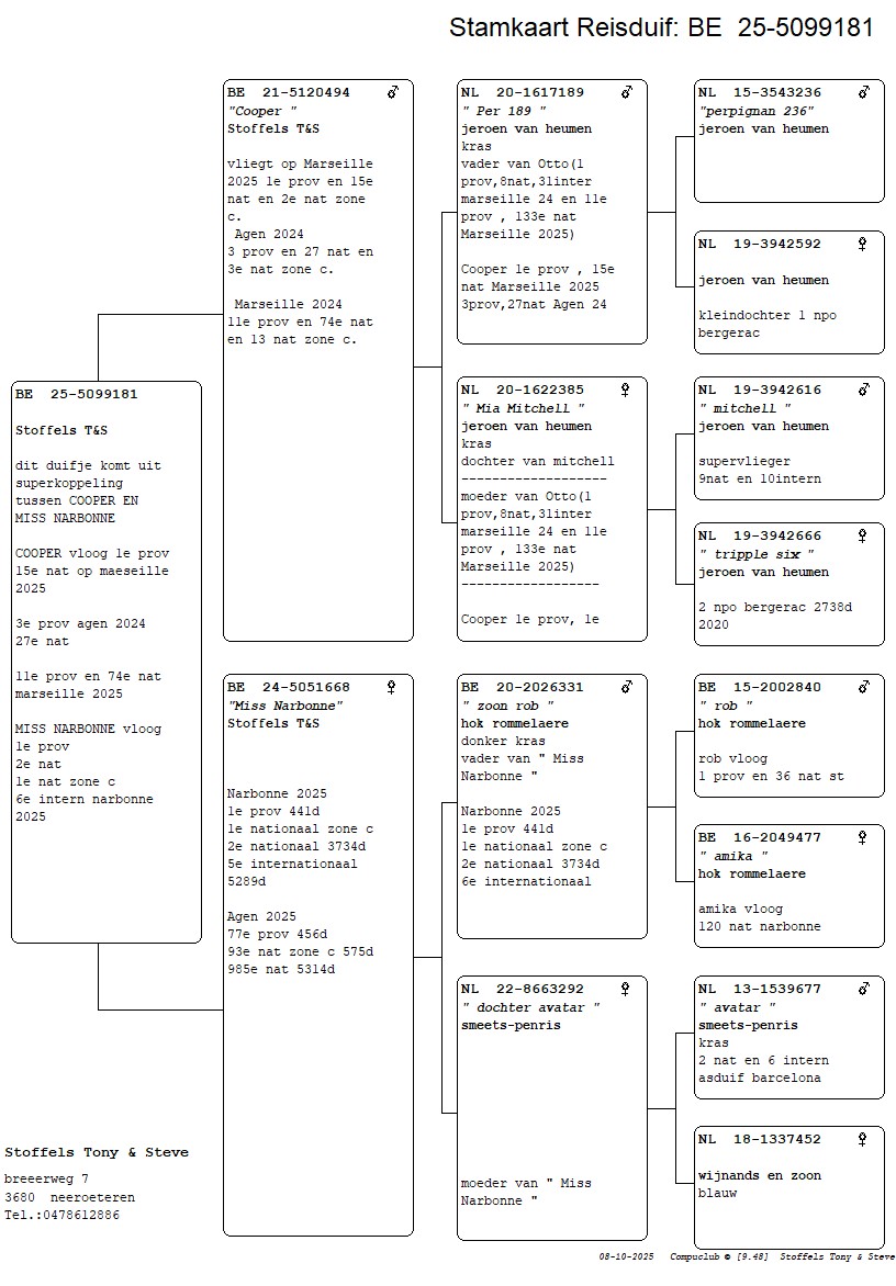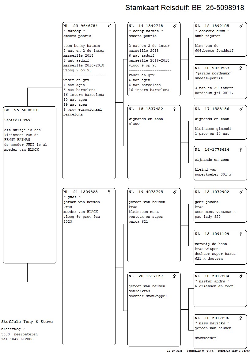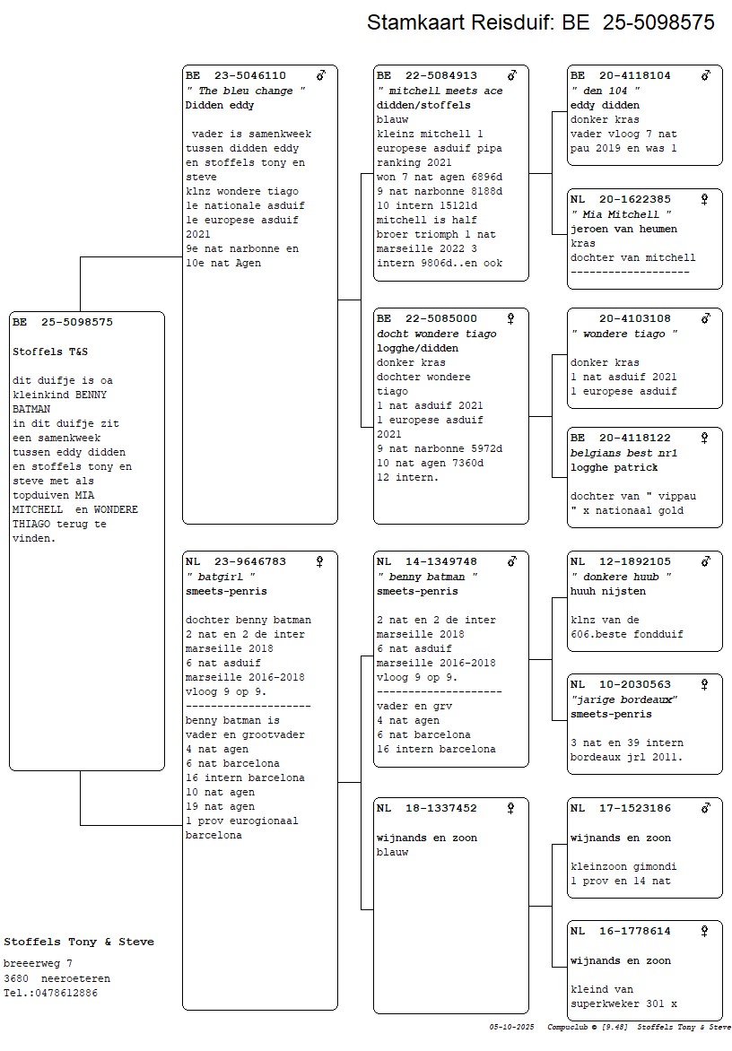 Is grandchild of “Benny Batman”, a joint breeding between Eddy Didden and Stoffels T&S with top pigeons “Mia Mitchell” and “Wondere Thiago”