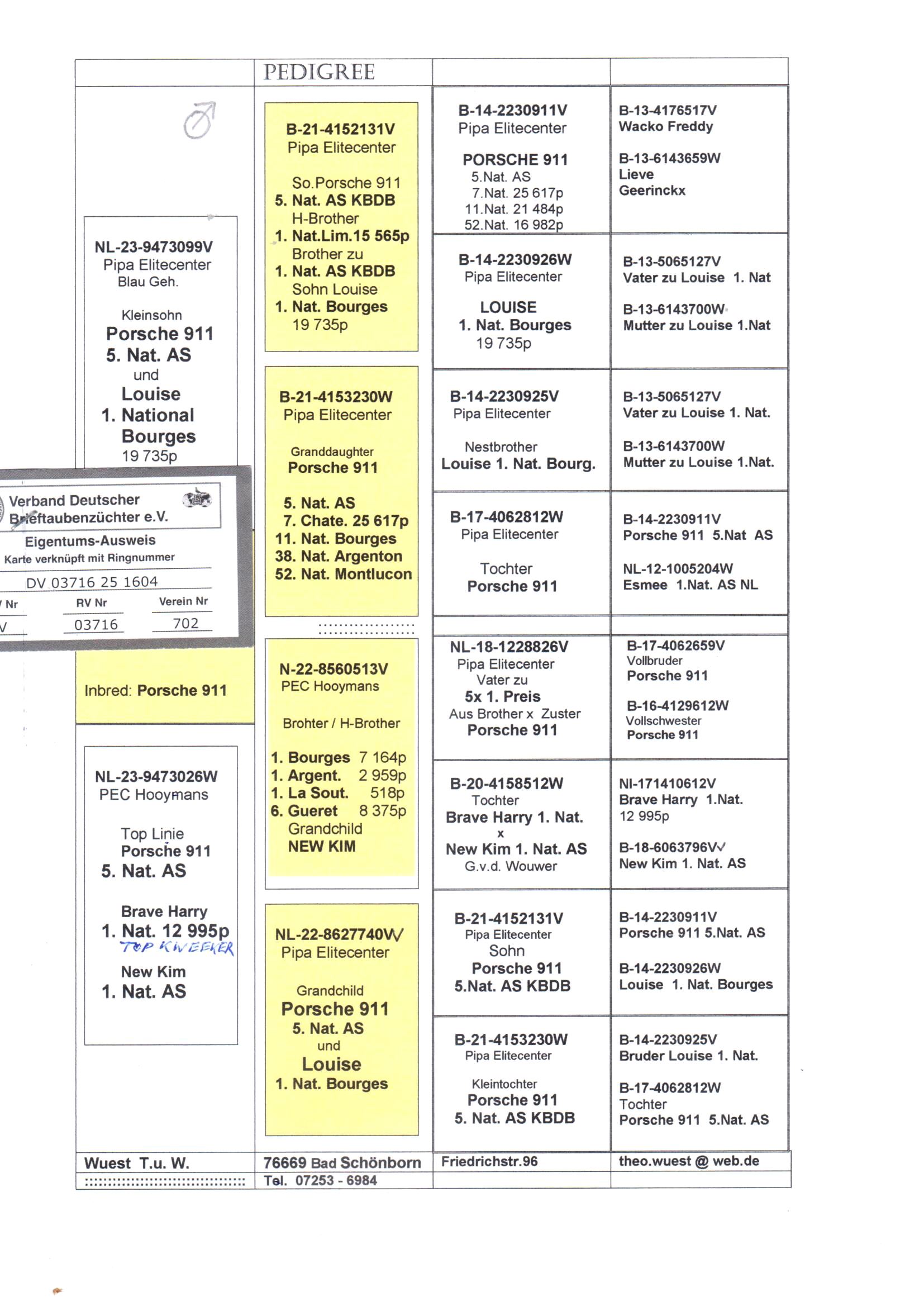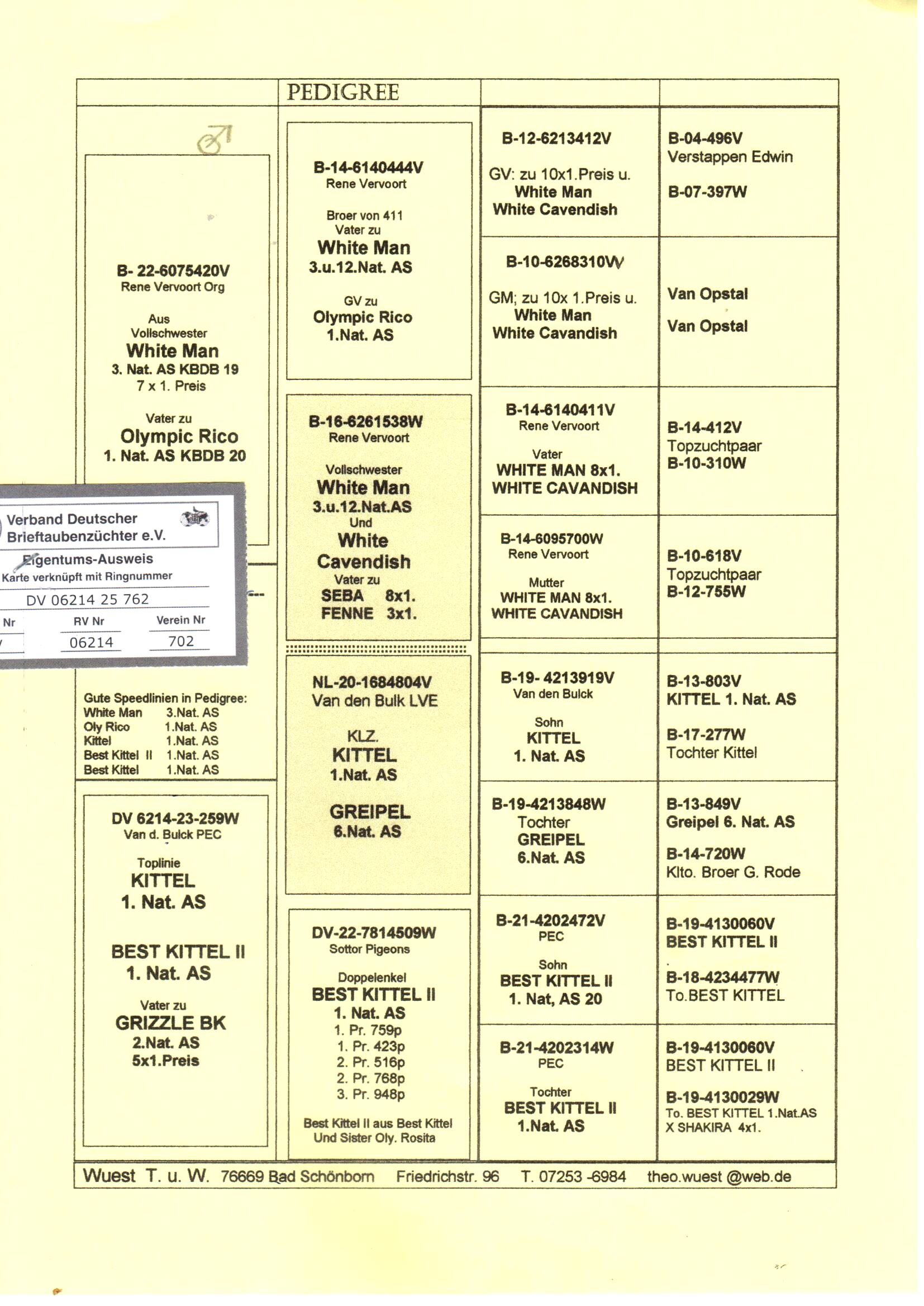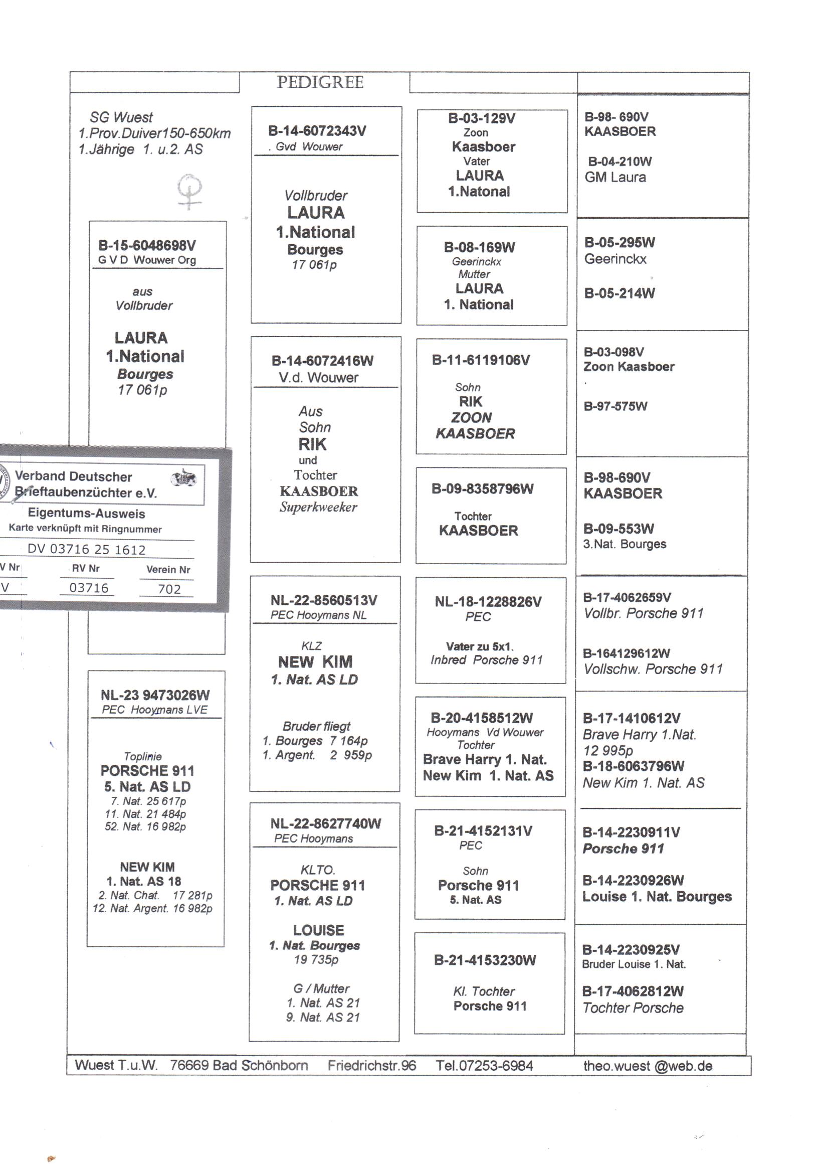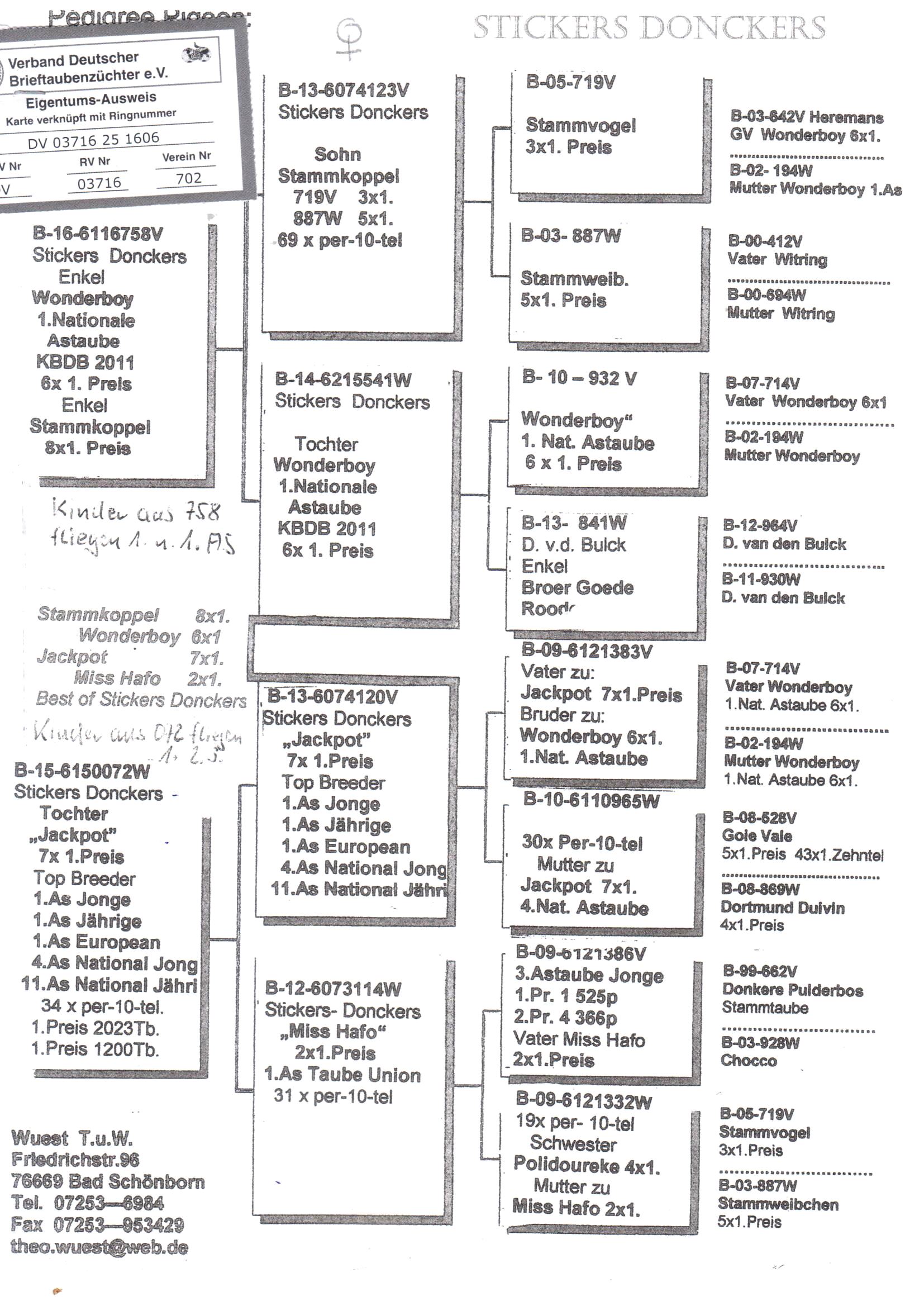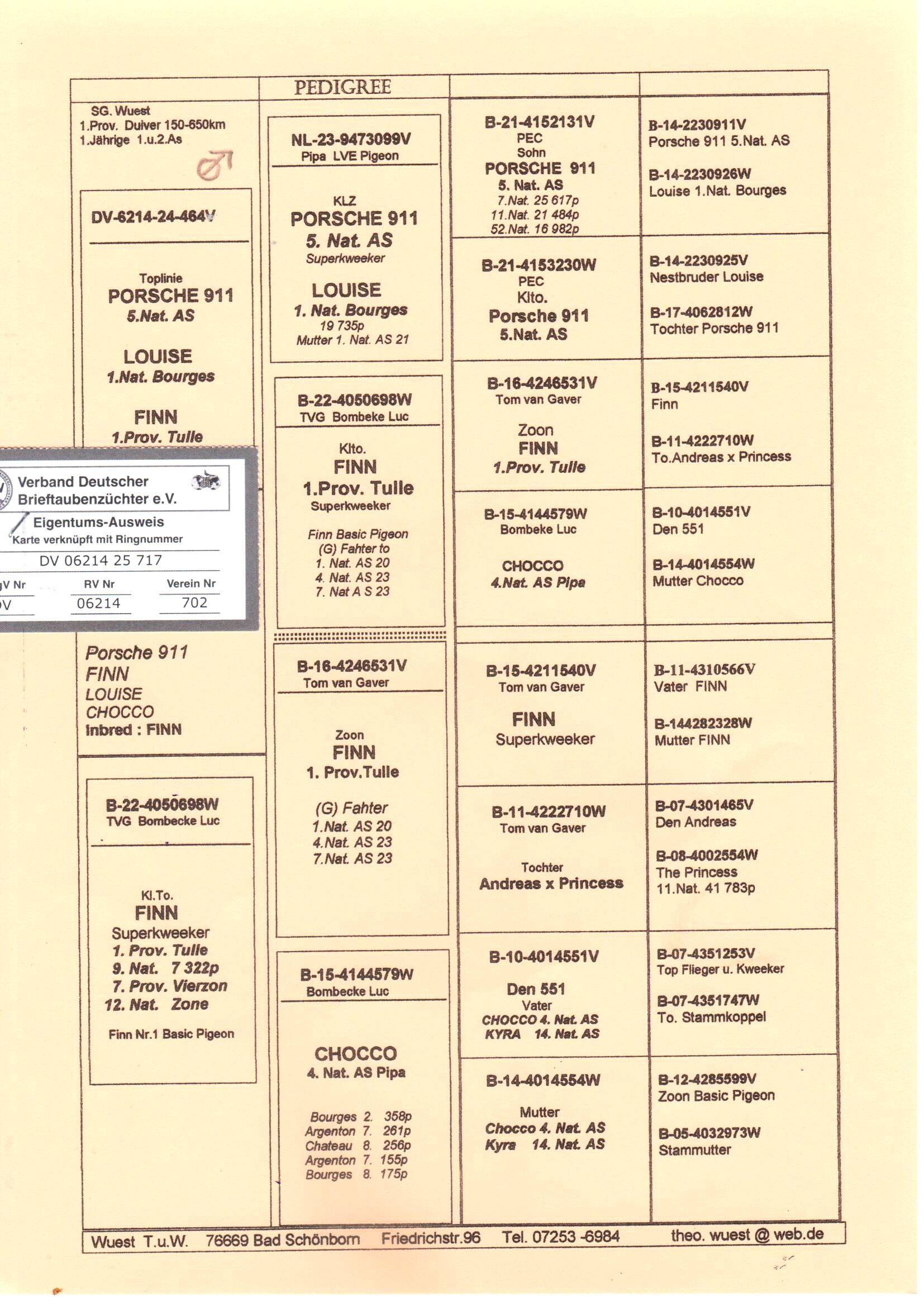 Les colombiers de Theo Wüst sont situés à Bad Schönborn, en Allemagne, à mi-chemin entre Francfort et Stuttgart. Depuis des années, il recherche les descendants des meilleurs pigeons du monde, ne lésinant pas sur les moyens pour les acquérir. Des noms de renommée mondiale tels que Kittel, Greipel, Porsche, White Man, Olympic Rico, Kaasboer, Wonderboy, Jackpot, Special One, Golden Prince, Harry, Jef, Champ, Murphy's Law et Di Caprio font la fierté de ses colombiers d'élevage. Son talent pour les meilleurs pigeons lui a permis de rencontrer les meilleurs amateurs du monde entier et a depuis fait de ses colombiers l'un des plus réputés, avec de nombreuses références en Allemagne et à l'étranger!