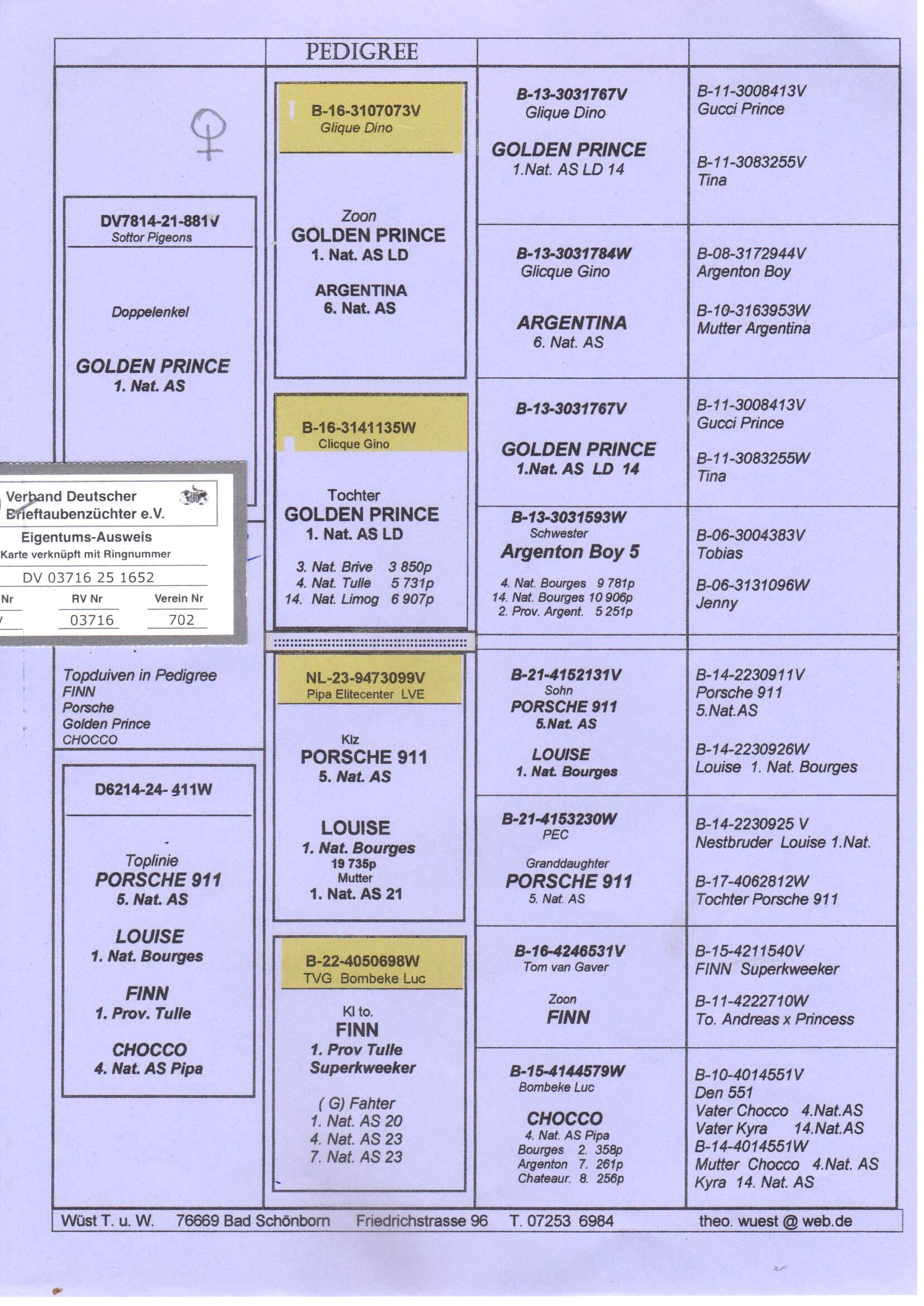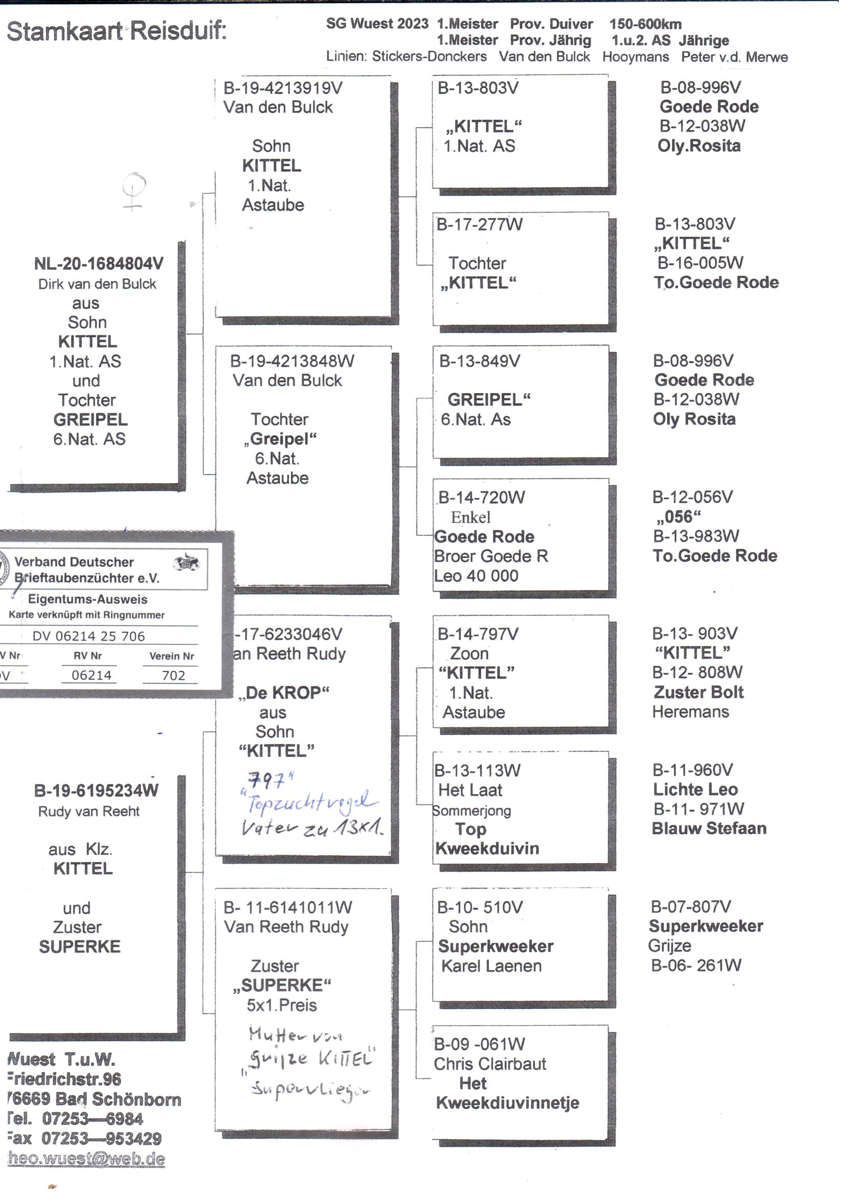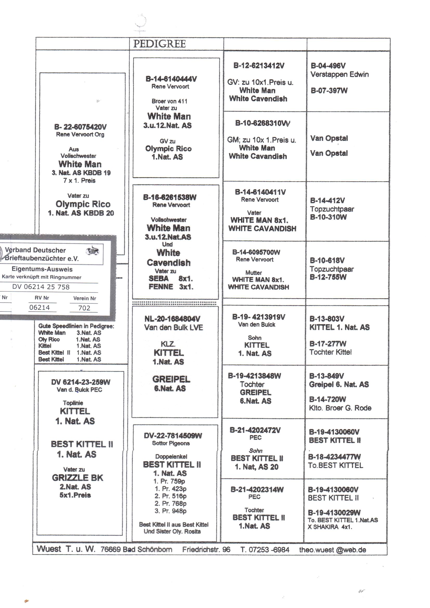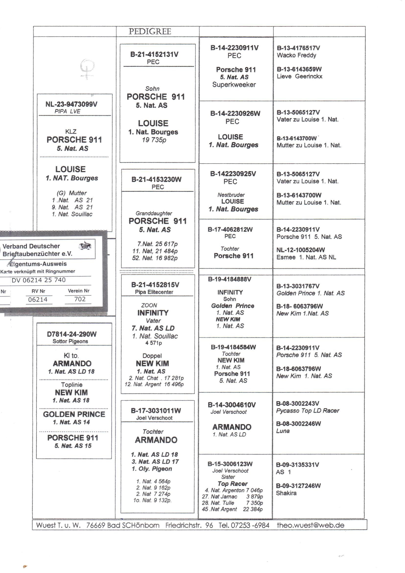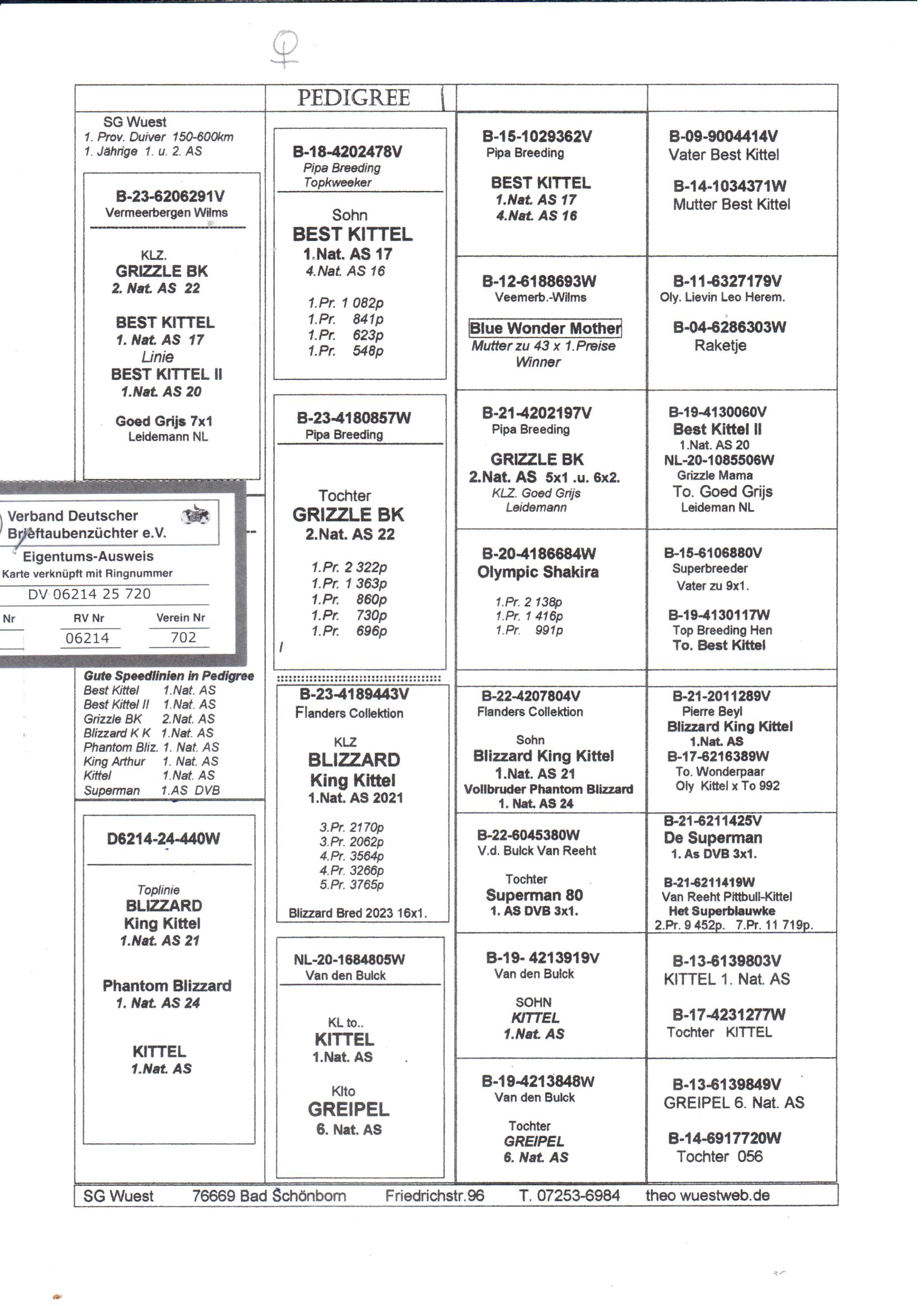 Les colombiers de Theo Wüst sont situés à Bad Schönborn, en Allemagne, à mi-chemin entre Francfort et Stuttgart. Depuis des années, il recherche les descendants des meilleurs pigeons du monde, ne lésinant pas sur les moyens pour les acquérir. Des noms de renommée mondiale tels que Kittel, Greipel, Porsche, White Man, Olympic Rico, Kaasboer, Wonderboy, Jackpot, Special One, Golden Prince, Harry, Jef, Champ, Murphy's Law et Di Caprio font la fierté de ses colombiers d'élevage. Son talent pour les meilleurs pigeons lui a permis de rencontrer les meilleurs amateurs du monde entier et a depuis fait de ses colombiers l'un des plus réputés, avec de nombreuses références en Allemagne et à l'étranger!