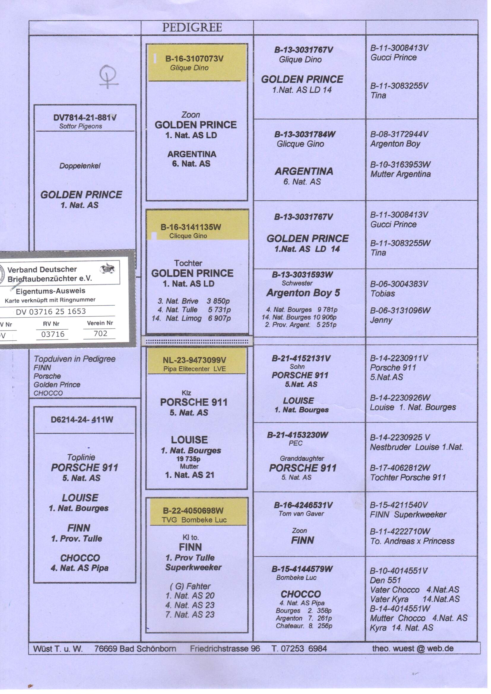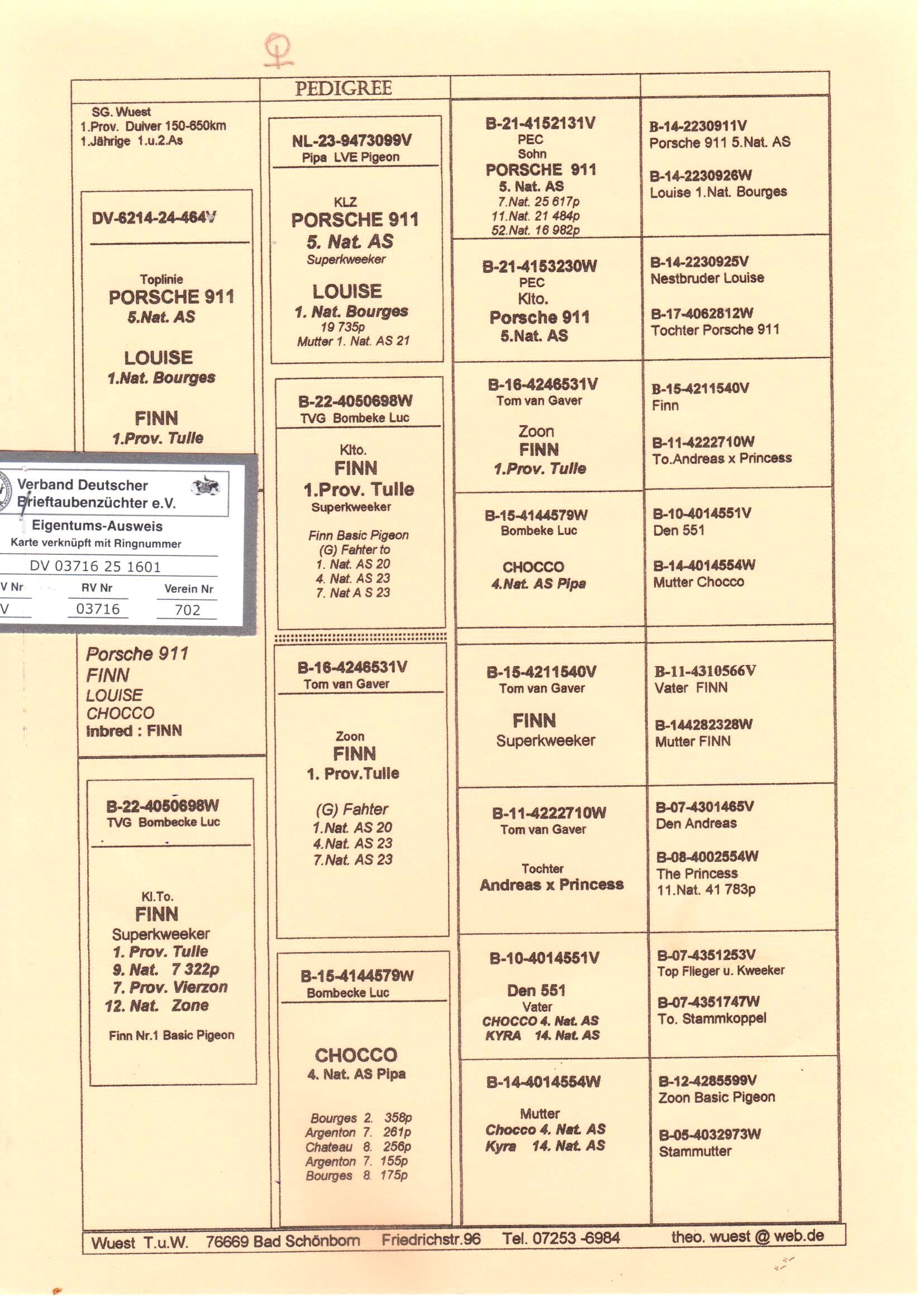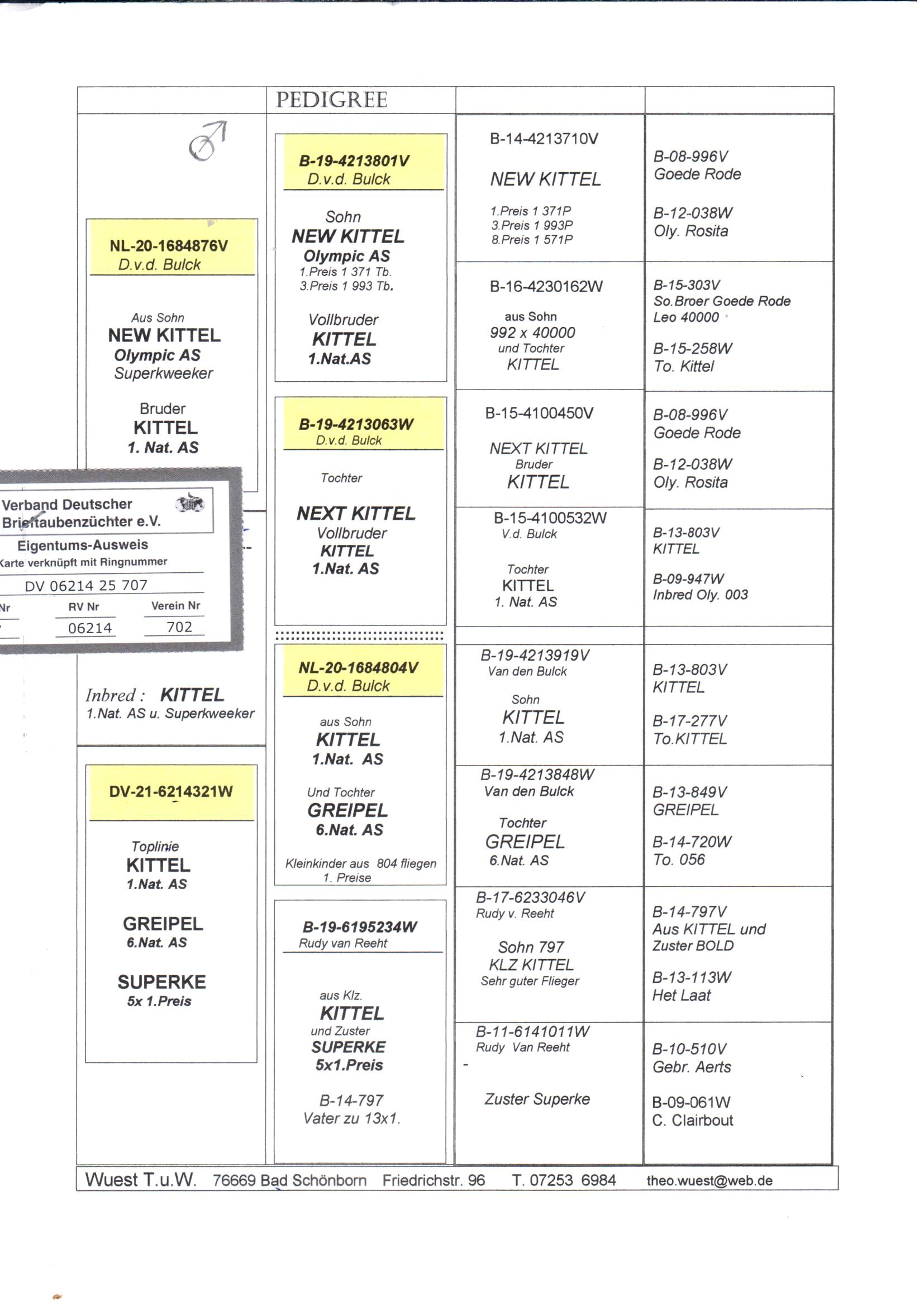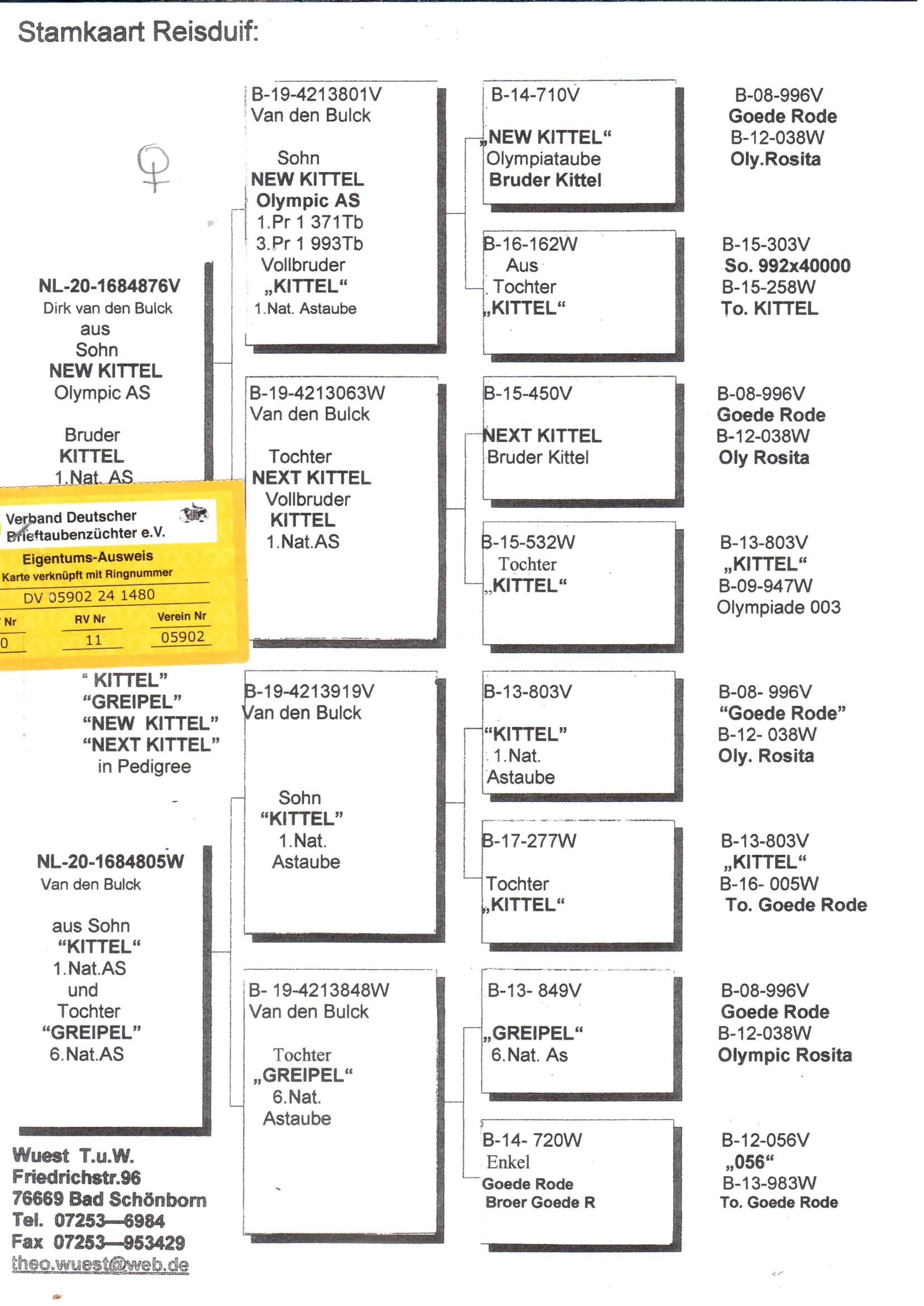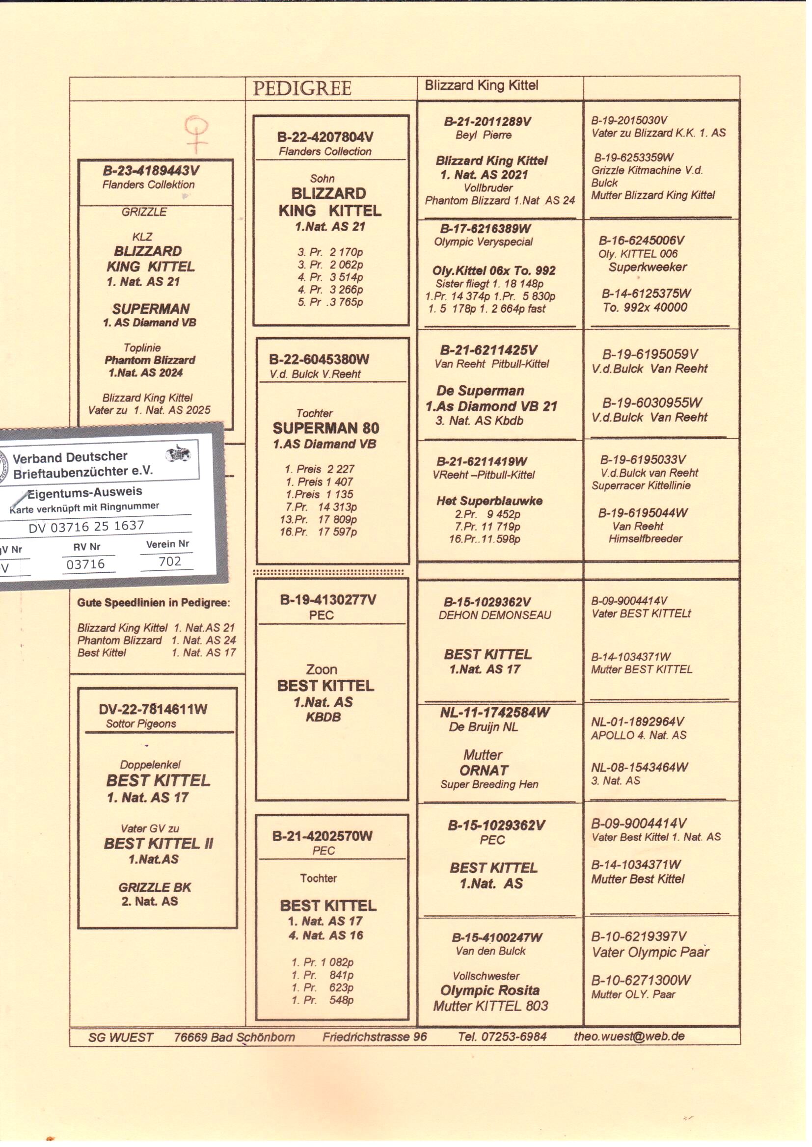 Les colombiers de Theo Wüst sont situés à Bad Schönborn, en Allemagne, à mi-chemin entre Francfort et Stuttgart. Depuis des années, il recherche les descendants des meilleurs pigeons du monde, ne lésinant pas sur les moyens pour les acquérir. Des noms de renommée mondiale tels que Kittel, Greipel, Porsche, White Man, Olympic Rico, Kaasboer, Wonderboy, Jackpot, Special One, Golden Prince, Harry, Jef, Champ, Murphy's Law et Di Caprio font la fierté de ses colombiers d'élevage. Son talent pour les meilleurs pigeons lui a permis de rencontrer les meilleurs amateurs du monde entier et a depuis fait de ses colombiers l'un des plus réputés, avec de nombreuses références en Allemagne et à l'étranger!