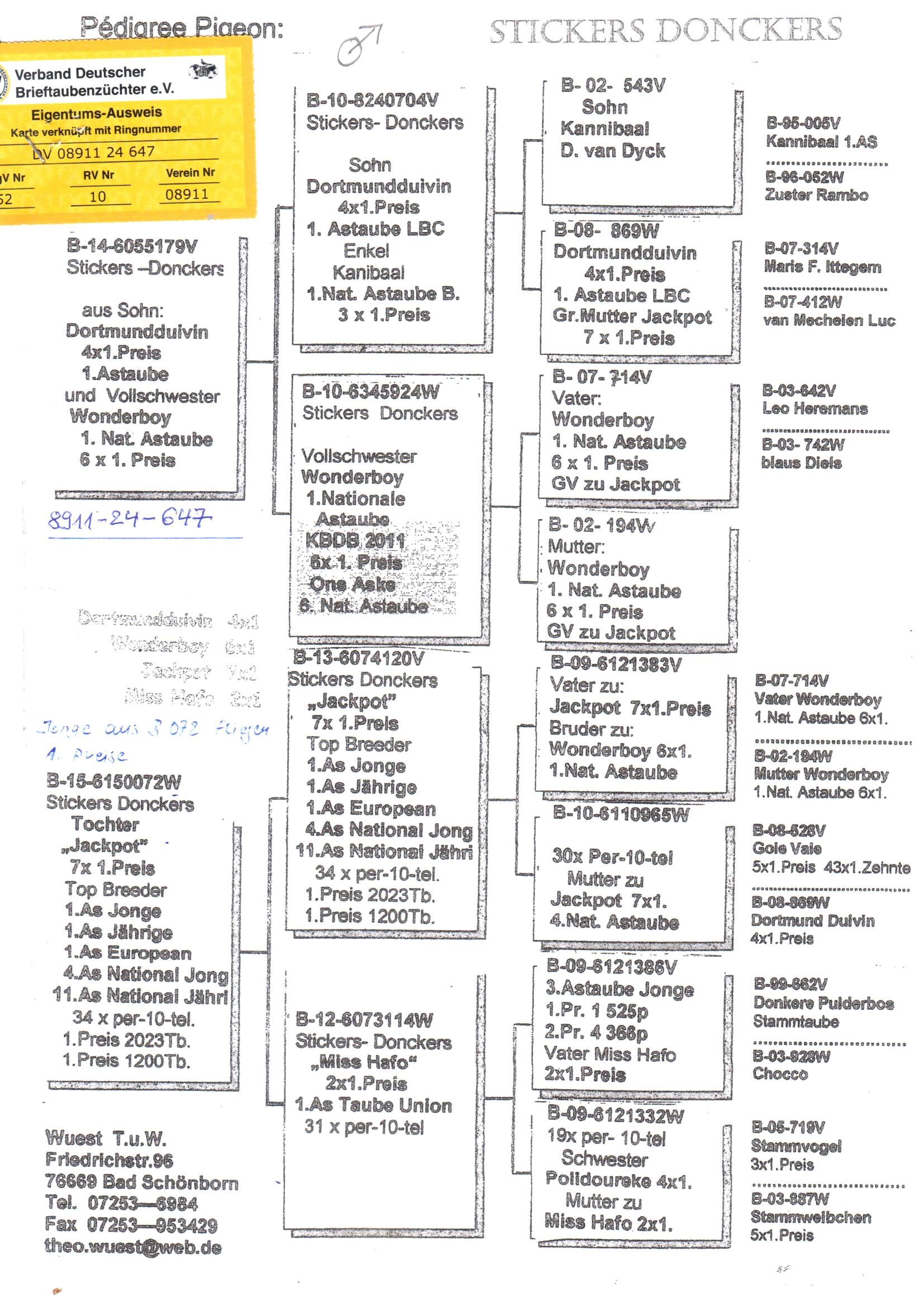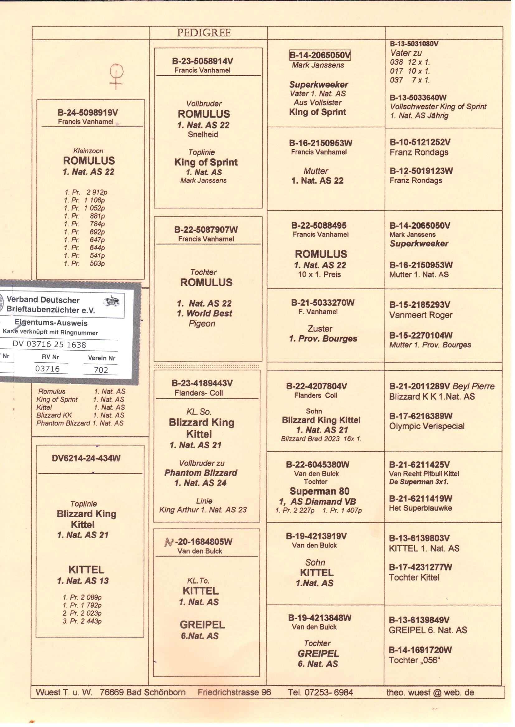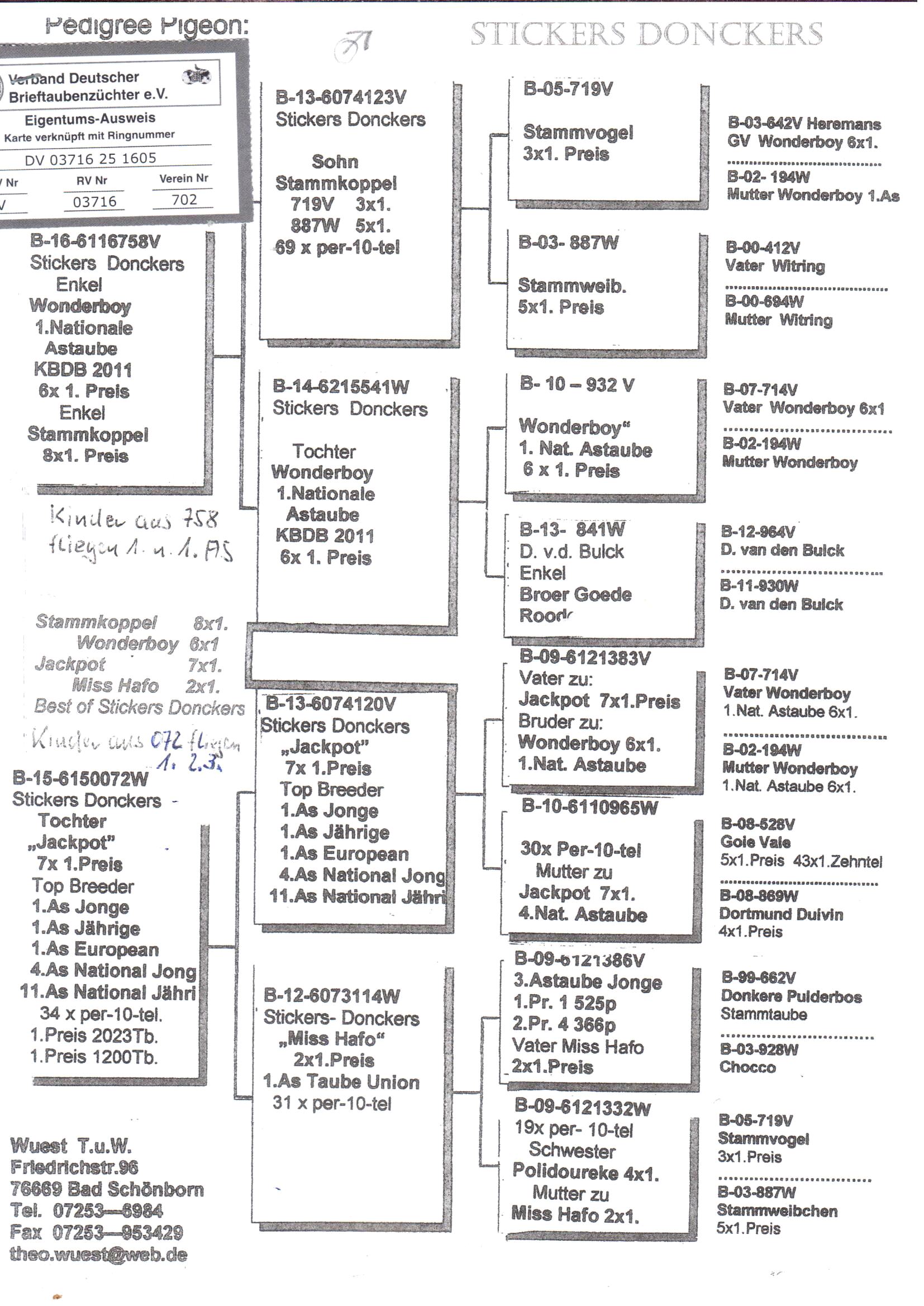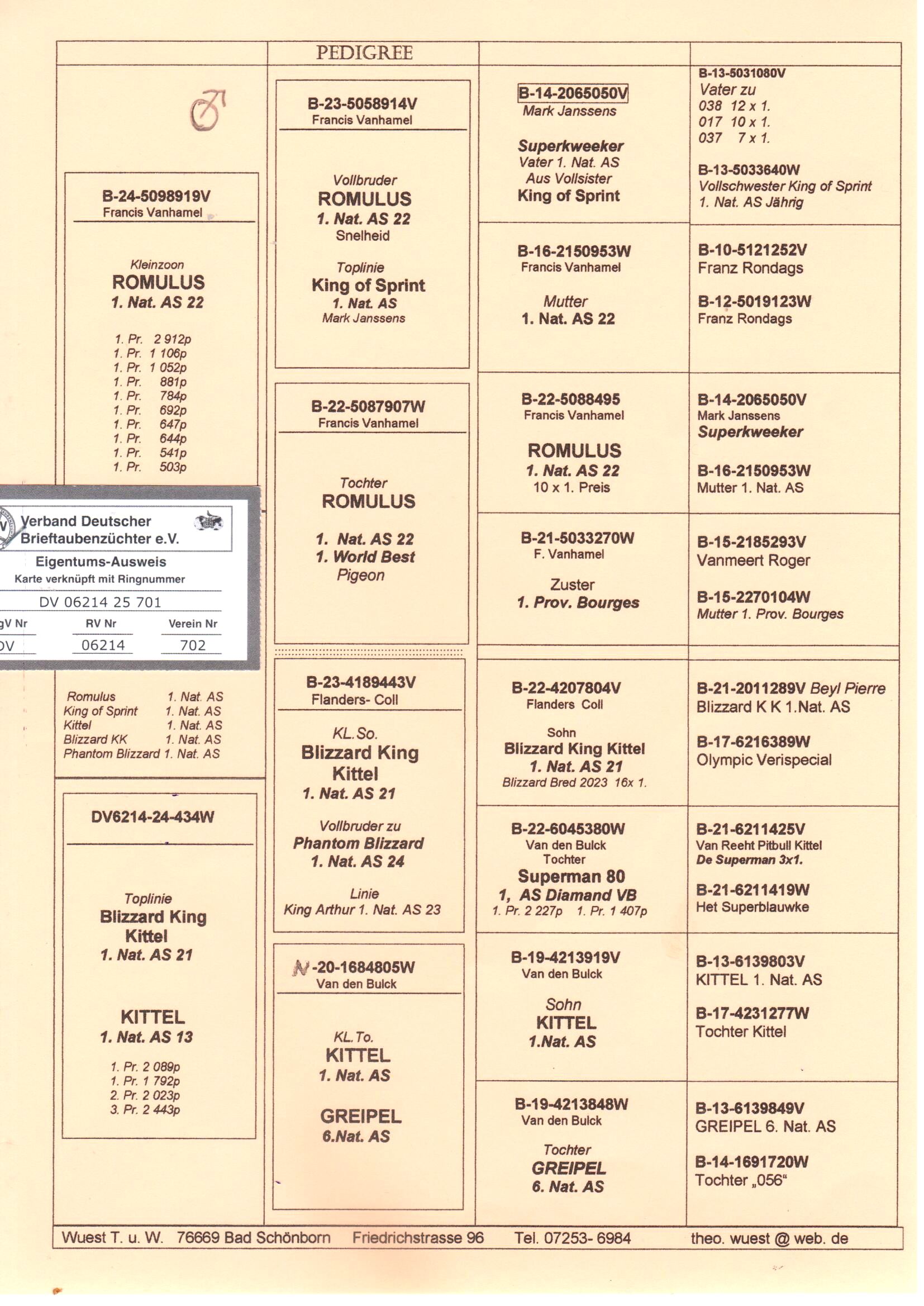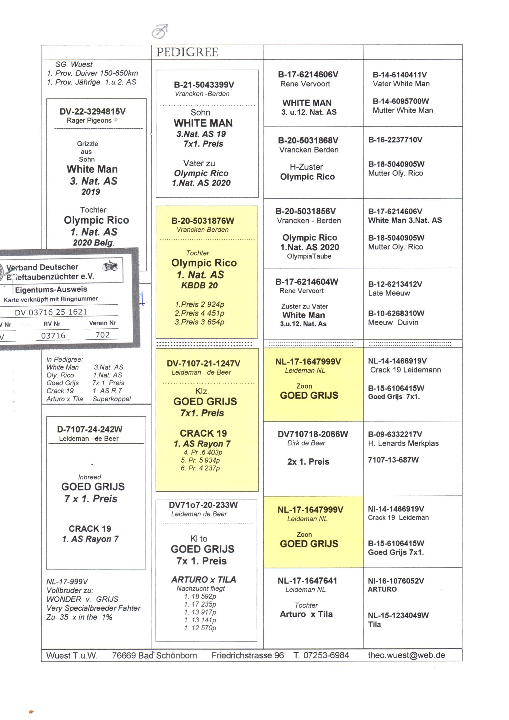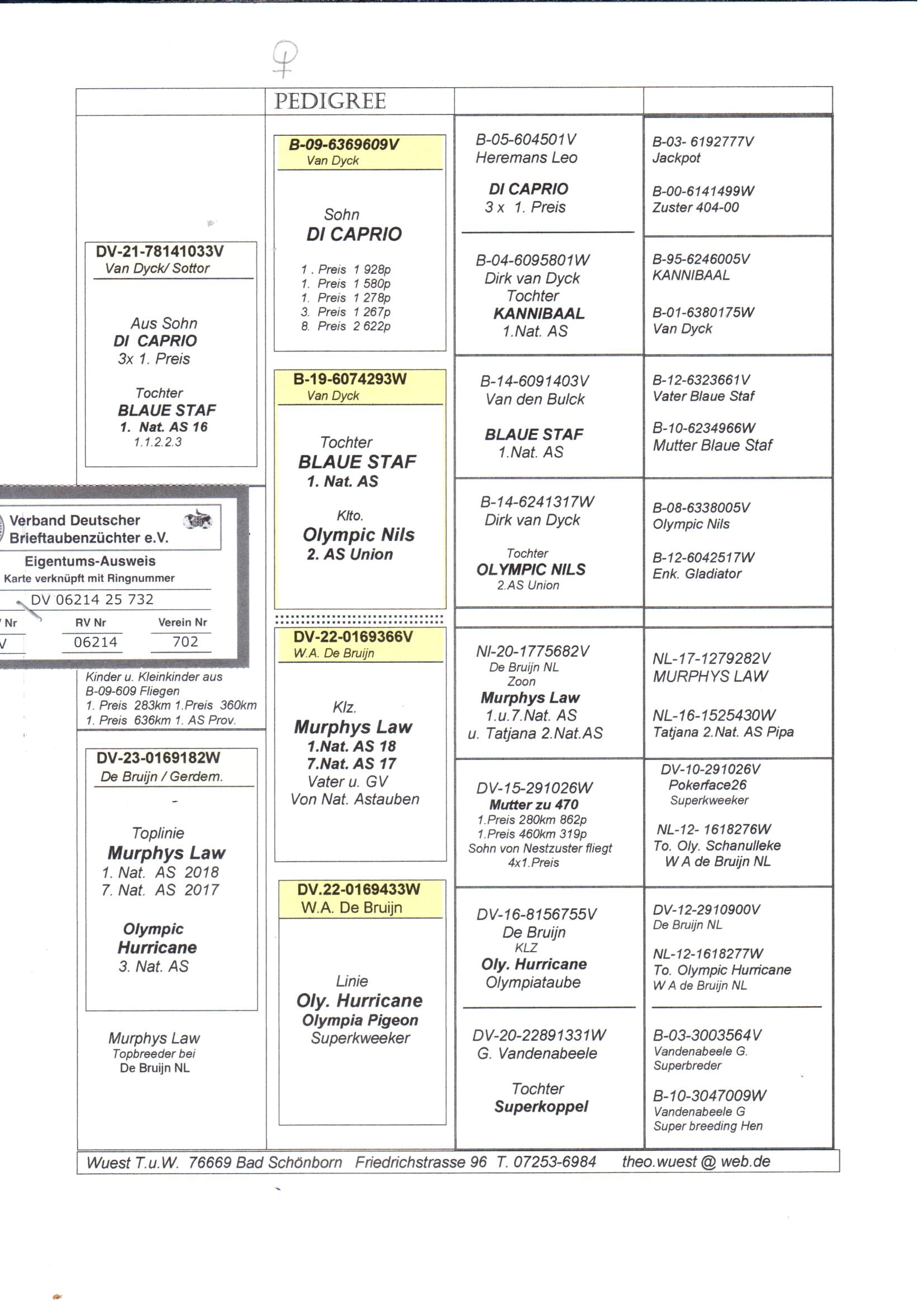 Les colombiers de Theo Wüst sont situés à Bad Schönborn, en Allemagne, à mi-chemin entre Francfort et Stuttgart. Depuis des années, il recherche les descendants des meilleurs pigeons du monde, ne lésinant pas sur les moyens pour les acquérir. Des noms de renommée mondiale tels que Kittel, Greipel, Porsche, White Man, Olympic Rico, Kaasboer, Wonderboy, Jackpot, Special One, Golden Prince, Harry, Jef, Champ, Murphy's Law et Di Caprio font la fierté de ses colombiers d'élevage. Son talent pour les meilleurs pigeons lui a permis de rencontrer les meilleurs amateurs du monde entier et a depuis fait de ses colombiers l'un des plus réputés, avec de nombreuses références en Allemagne et à l'étranger!