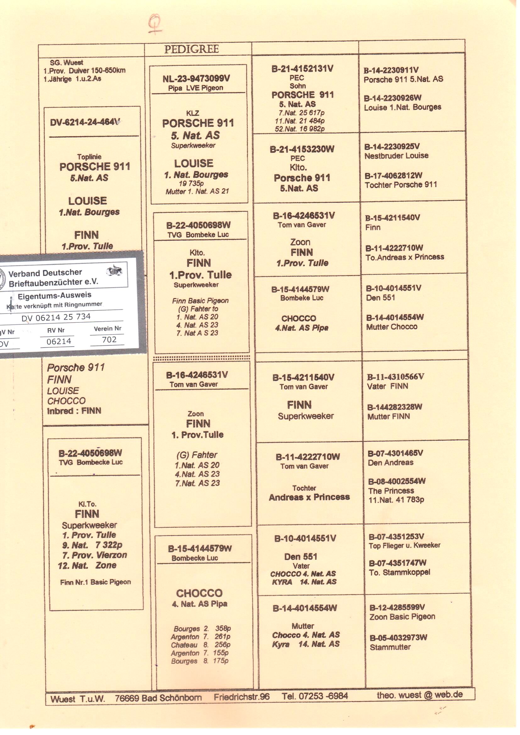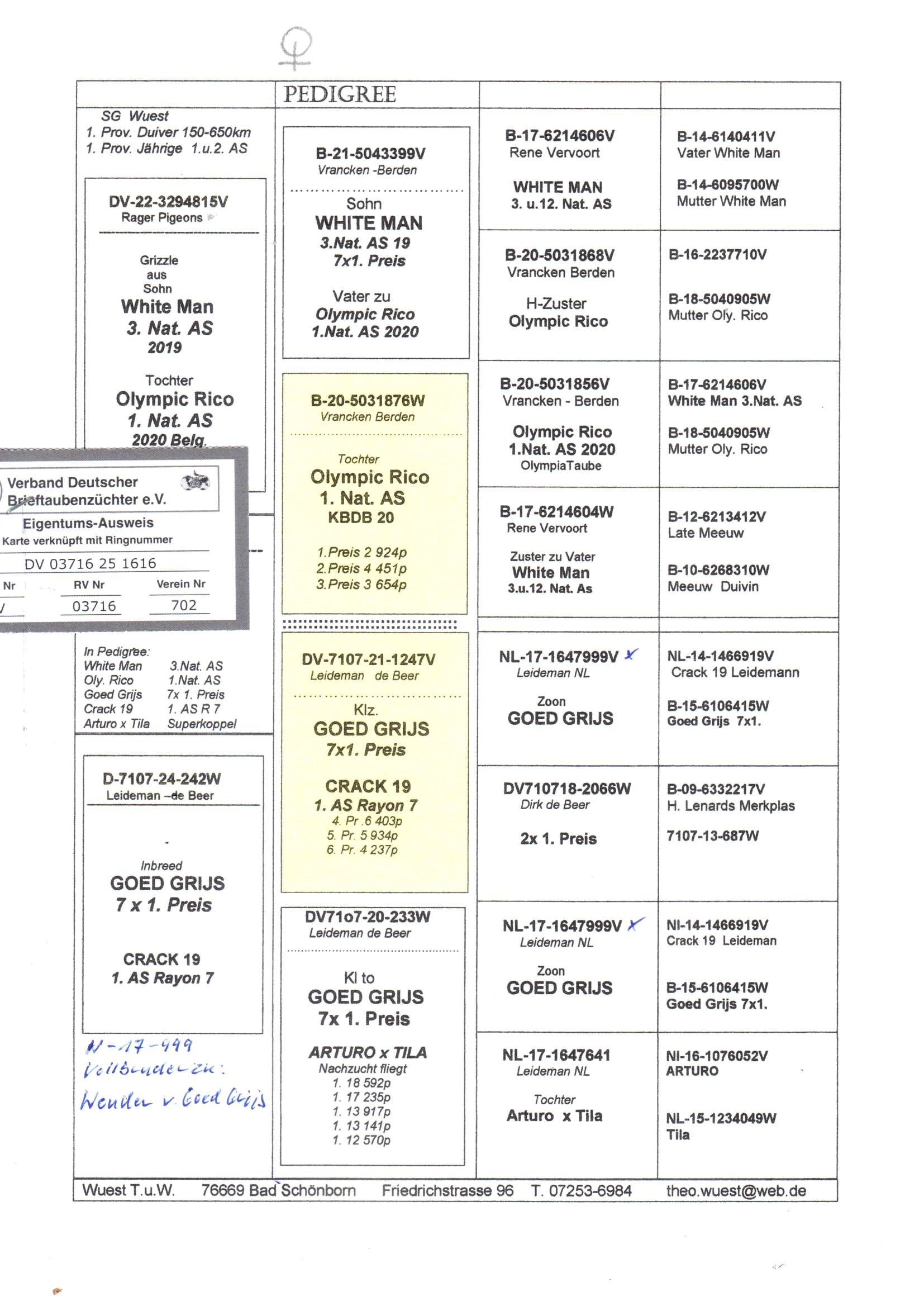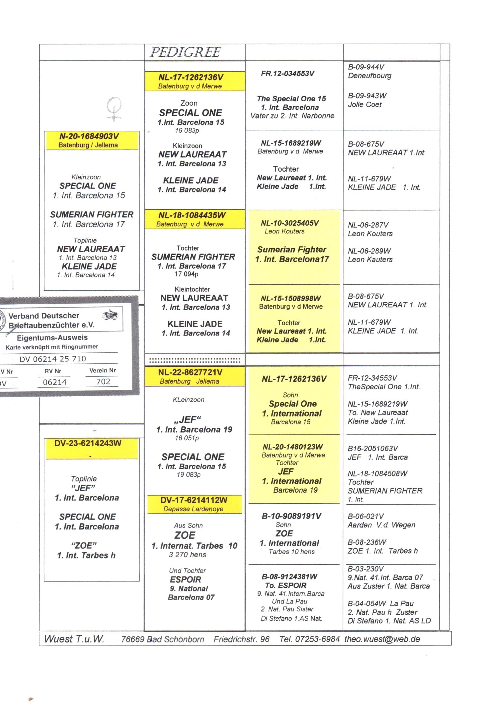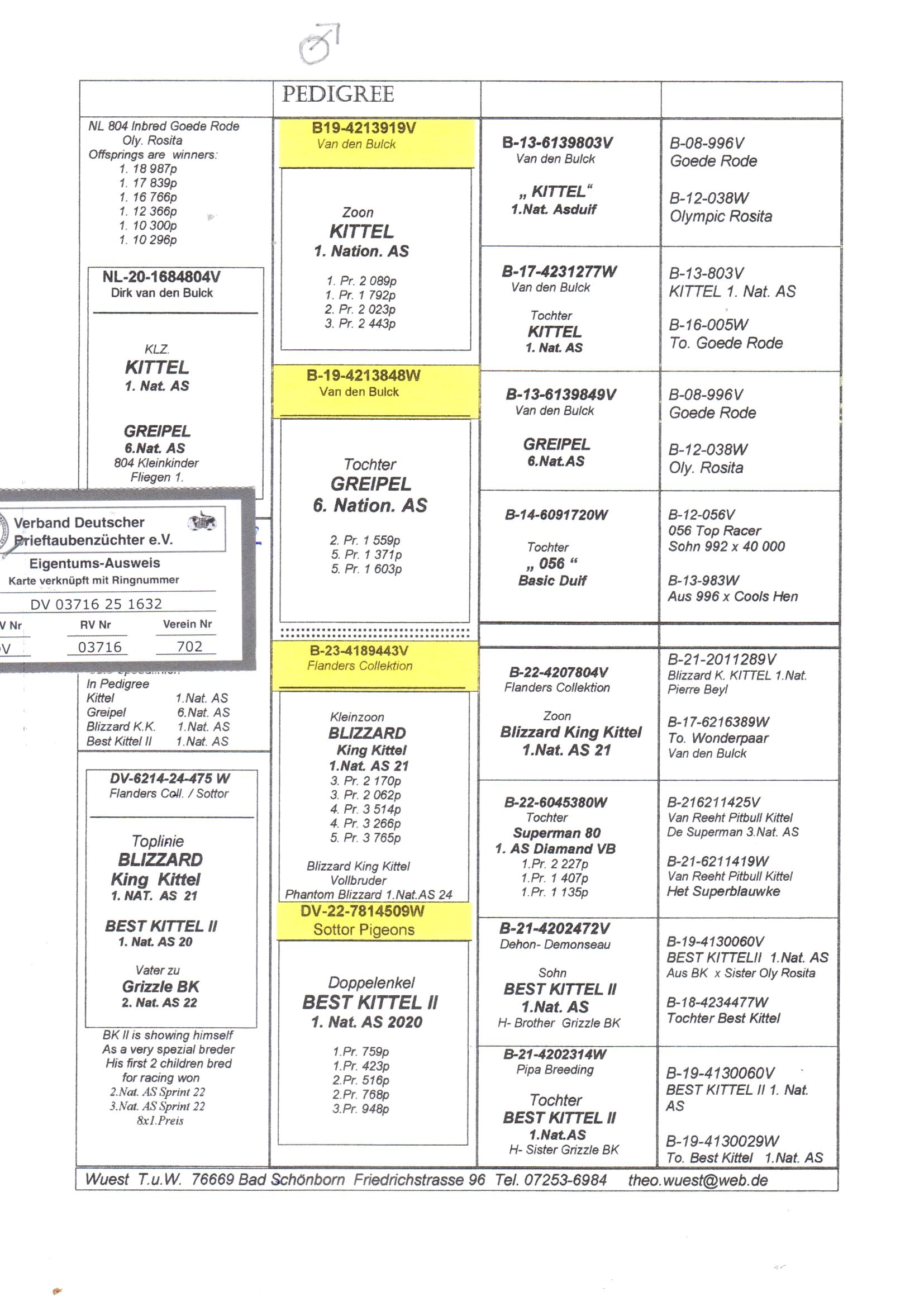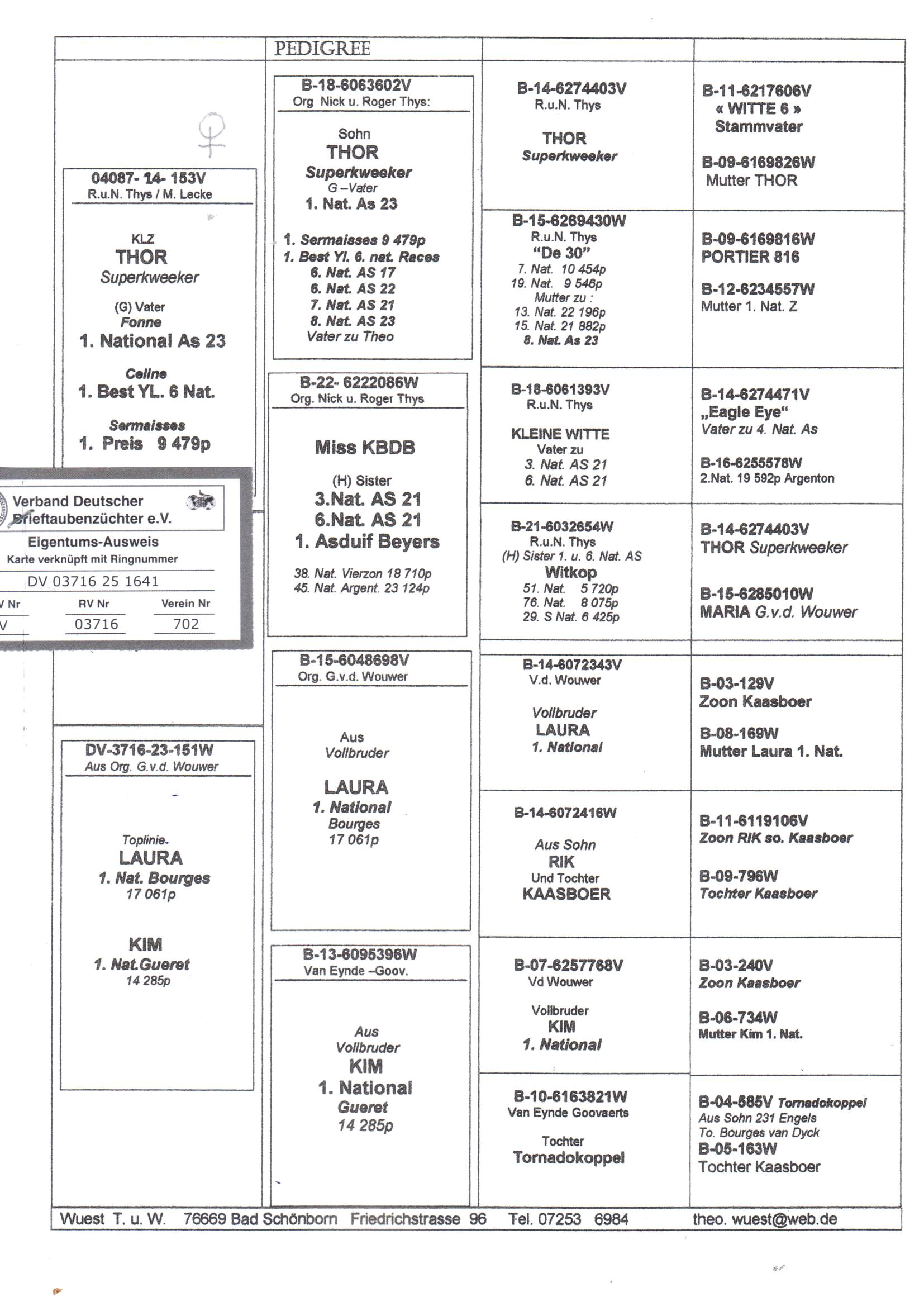 Les colombiers de Theo Wüst sont situés à Bad Schönborn, en Allemagne, à mi-chemin entre Francfort et Stuttgart. Depuis des années, il recherche les descendants des meilleurs pigeons du monde, ne lésinant pas sur les moyens pour les acquérir. Des noms de renommée mondiale tels que Kittel, Greipel, Porsche, White Man, Olympic Rico, Kaasboer, Wonderboy, Jackpot, Special One, Golden Prince, Harry, Jef, Champ, Murphy's Law et Di Caprio font la fierté de ses colombiers d'élevage. Son talent pour les meilleurs pigeons lui a permis de rencontrer les meilleurs amateurs du monde entier et a depuis fait de ses colombiers l'un des plus réputés, avec de nombreuses références en Allemagne et à l'étranger!