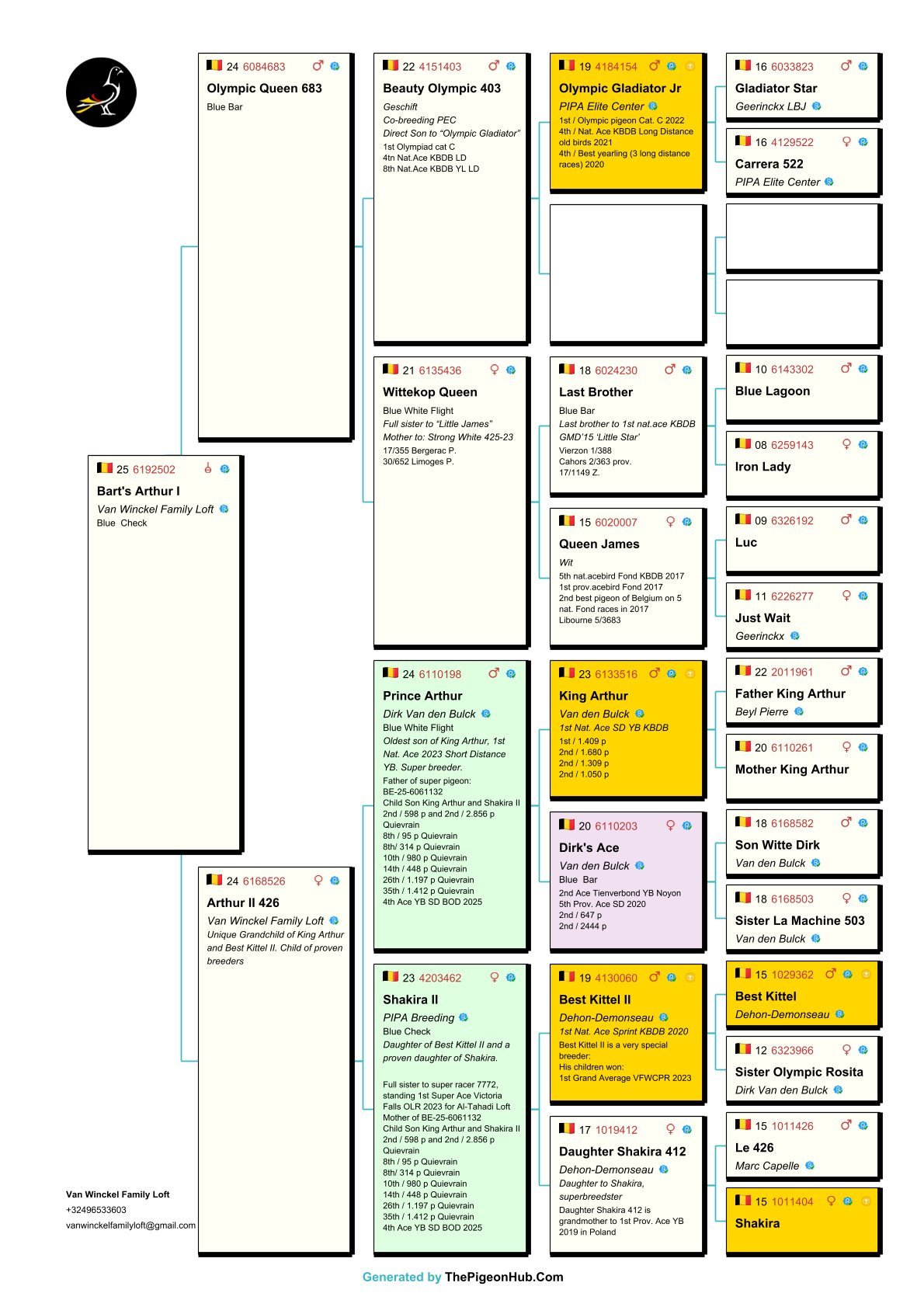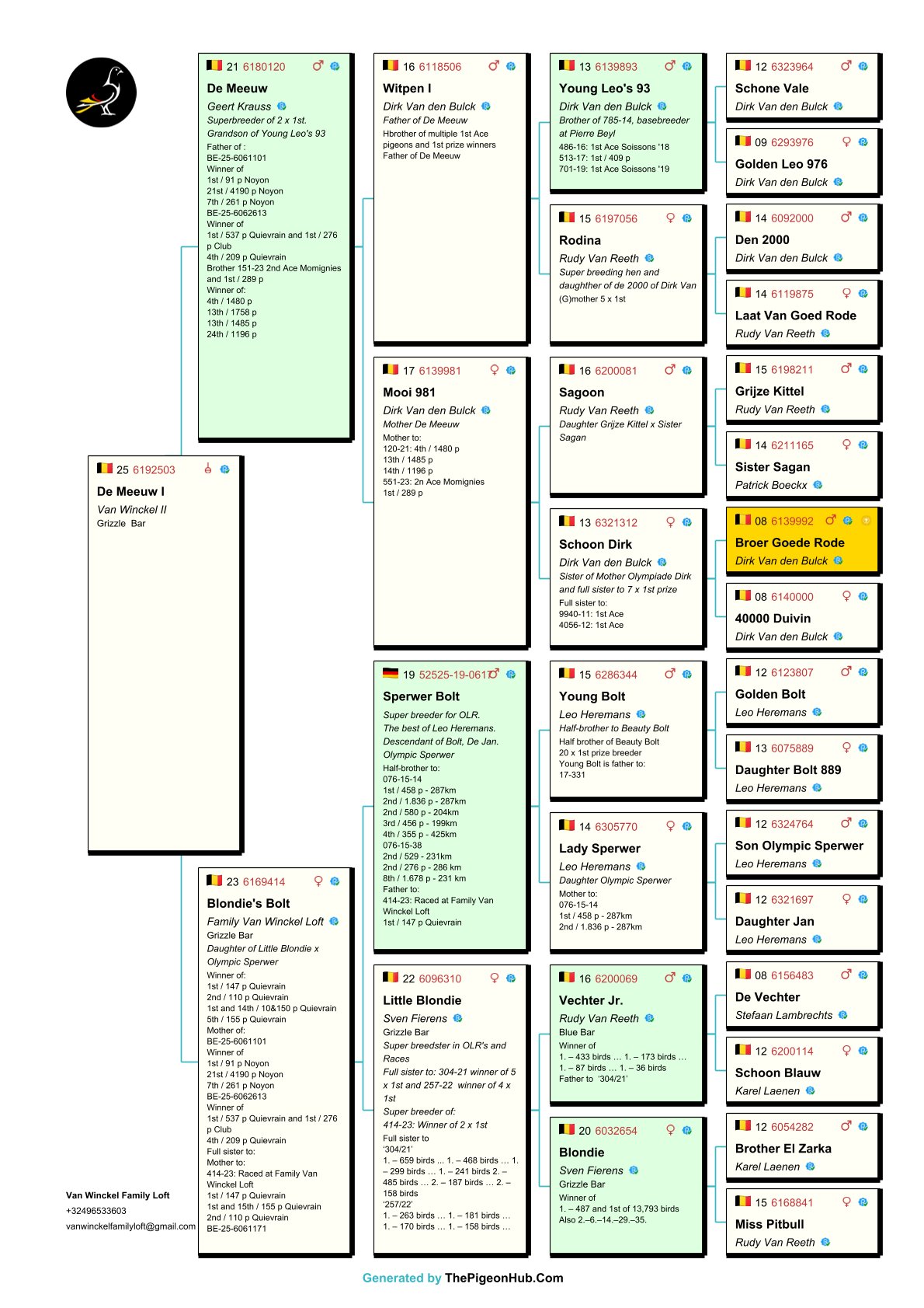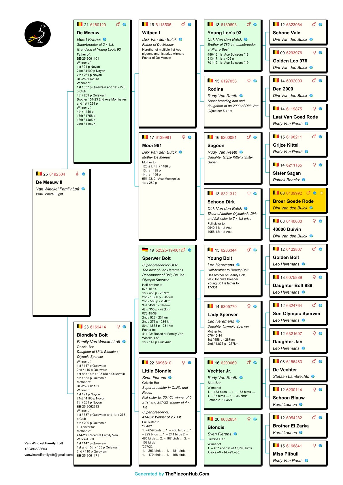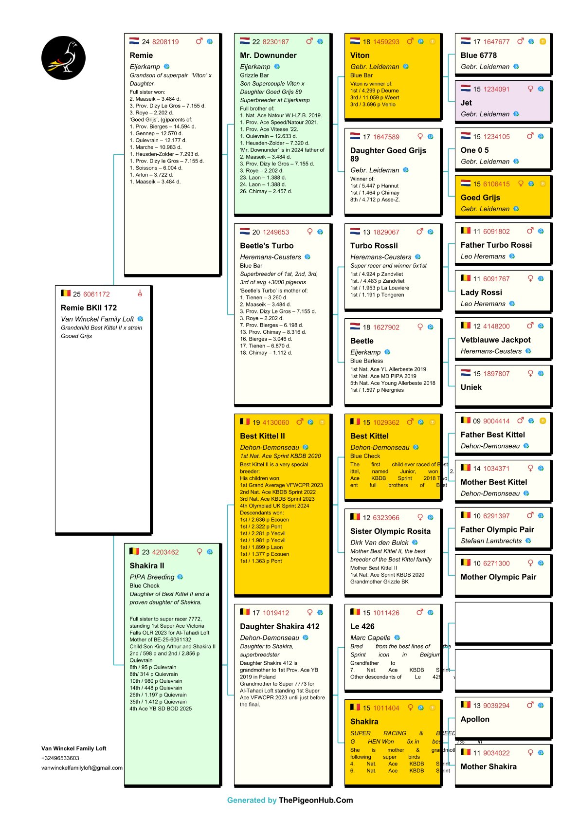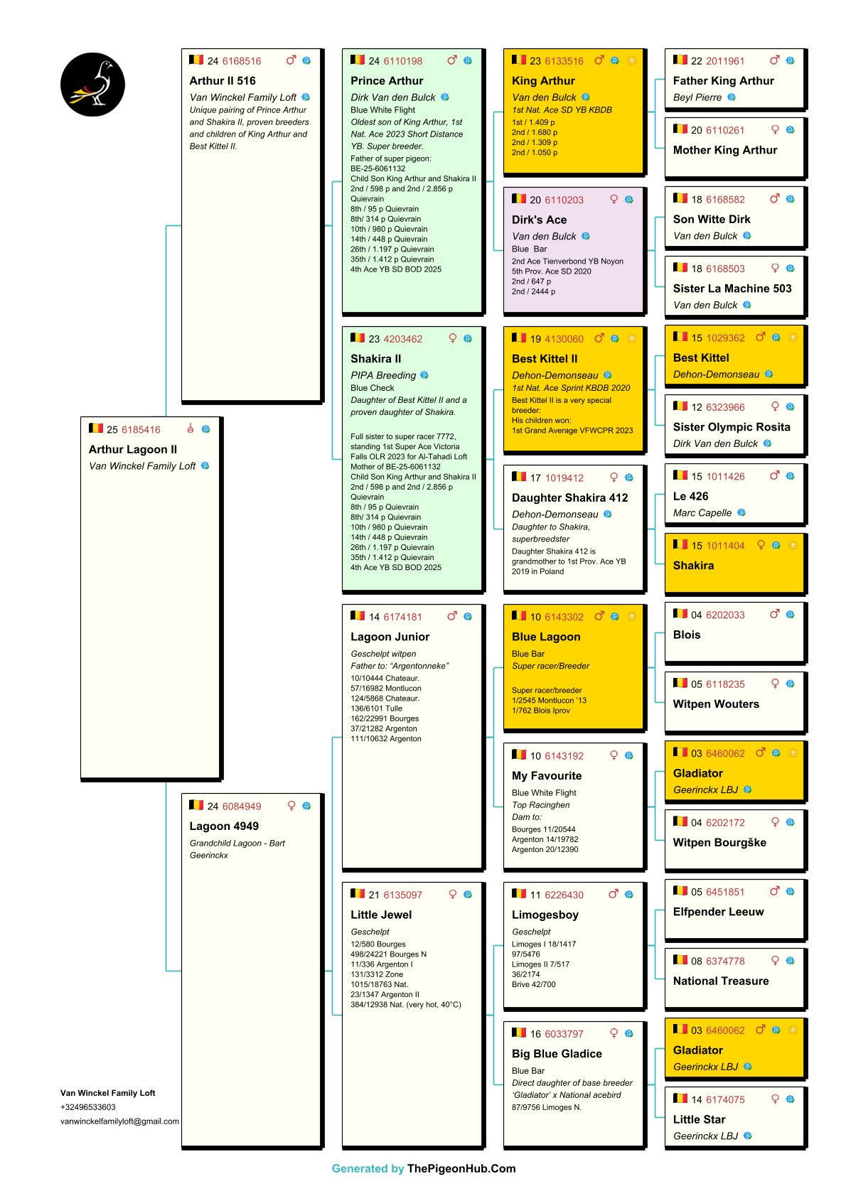 La famille Van Winckel a connu une saison 2025 exceptionnelle, remportant pas moins de 23 premiers prix, sans aucun doublé. Sous le nom de Noah Loft, elle a également connu un succès international. Elle possède une collection unique de pigeons et abrite certains des meilleurs pigeons au monde. Parmi eux figurent « Burj Khalifa », vainqueur et icône du Dubai OLR, et descendant direct de « Best Kittel II », l'un des meilleurs reproducteurs de la colombophilie moderne. La famille possède également des descendants directs de certains des meilleurs pigeons voyageurs de la célèbre Collection des Flandres, tels que ceux de « Blizzard King Kittel » et « Phantom Blizzard », ainsi que des pigeons issus des éleveurs renommés Dirk Van den Bulck et Pierre Beyl. Parmi les autres reproducteurs importants de la famille, on compte les descendants directs de « Junior », « White Man », « Best Kittel », « Gargenton », « Blue Best Kittel », « Ernest » et « Grizzly Adams ». Ces lignées exceptionnelles constituent la base solide de l'élevage de pigeons de haute qualité. Pitts est fier de proposer sa première sélection aux enchères!